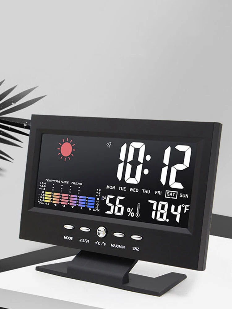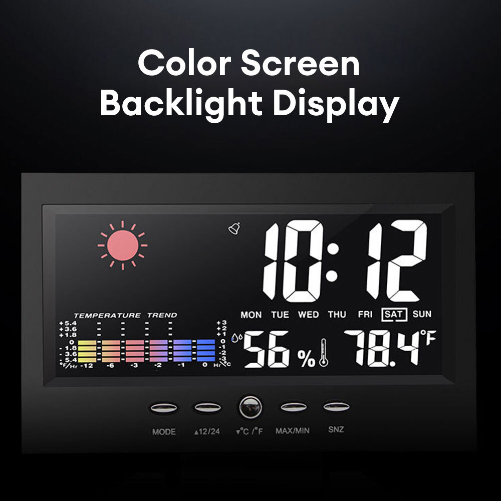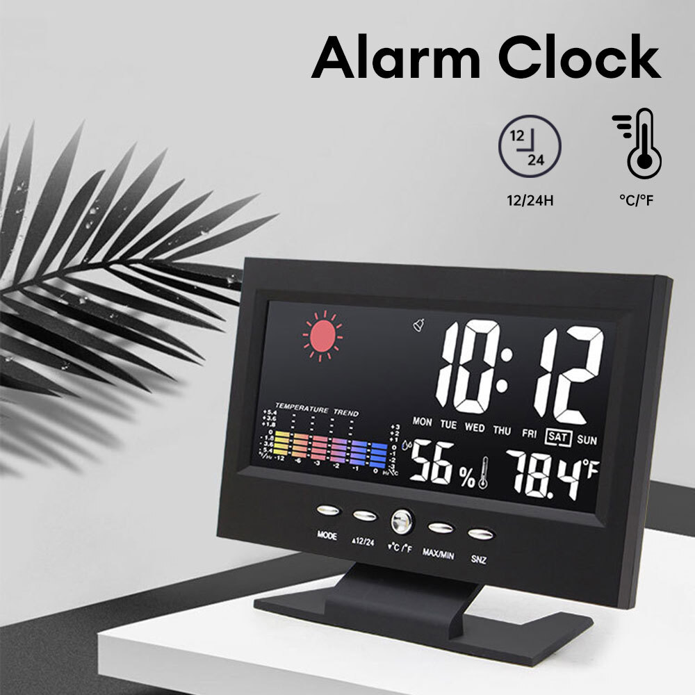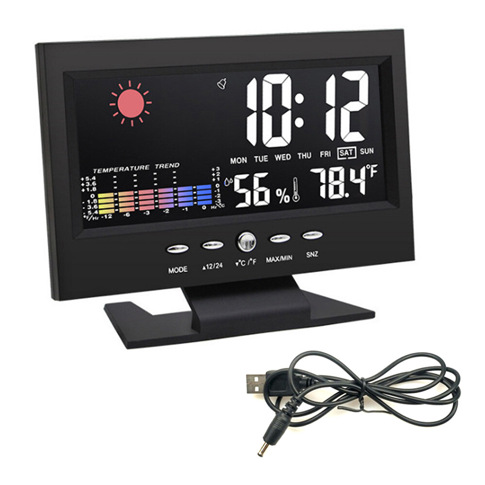 Description: 1. Clock display, 12/24 hours can be switched. 2. It can display time, weather, temperature, humidity, day of the week, temperature trend. 3. With alarm clock, snooze function, weather display, temperature trend indication, very practical. 4. Voice-activated backlight, energy-saving and convenient. You can turn off the voice-activated function through the switch on the back of the product. 5. Powered by 2 x 1.5V AAA batteries (not included). Specification: Material: ABS Color: Black Screen size: 107*58mm Temperature measurement range: -10-61°C / 14.2-140°F Humidity Measurement Range: 20%-99 Power supply: 2 * 1.5V AAA batteries (not included) Packing list: 1x Alarm clock (without battery) 1x USB charging cable Note: 1. When this product is powered by batteries, the screen backlight will not be always on (carbon batteries are recommended, please do not use high-power alkaline batteries) 2.When this product uses USB power supply, the screen will be always lit.