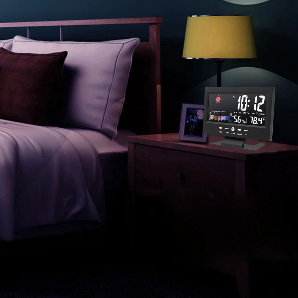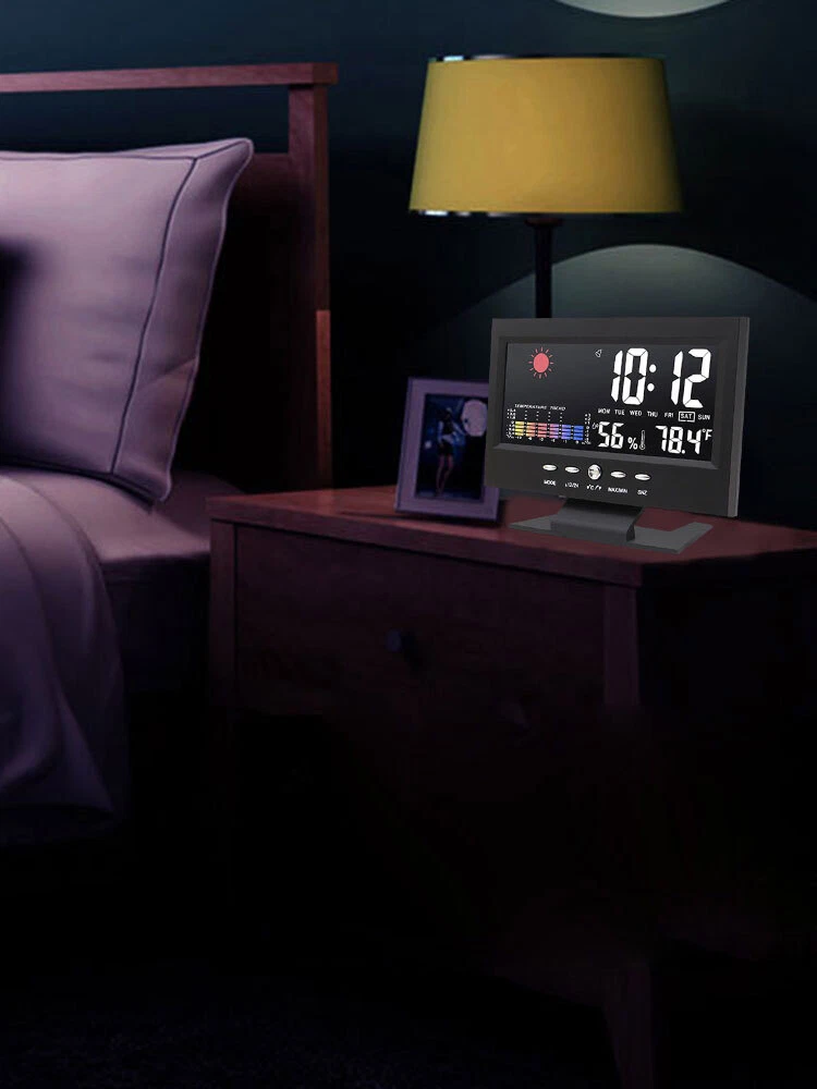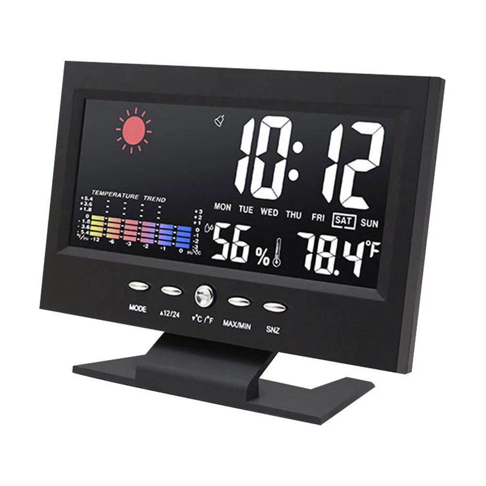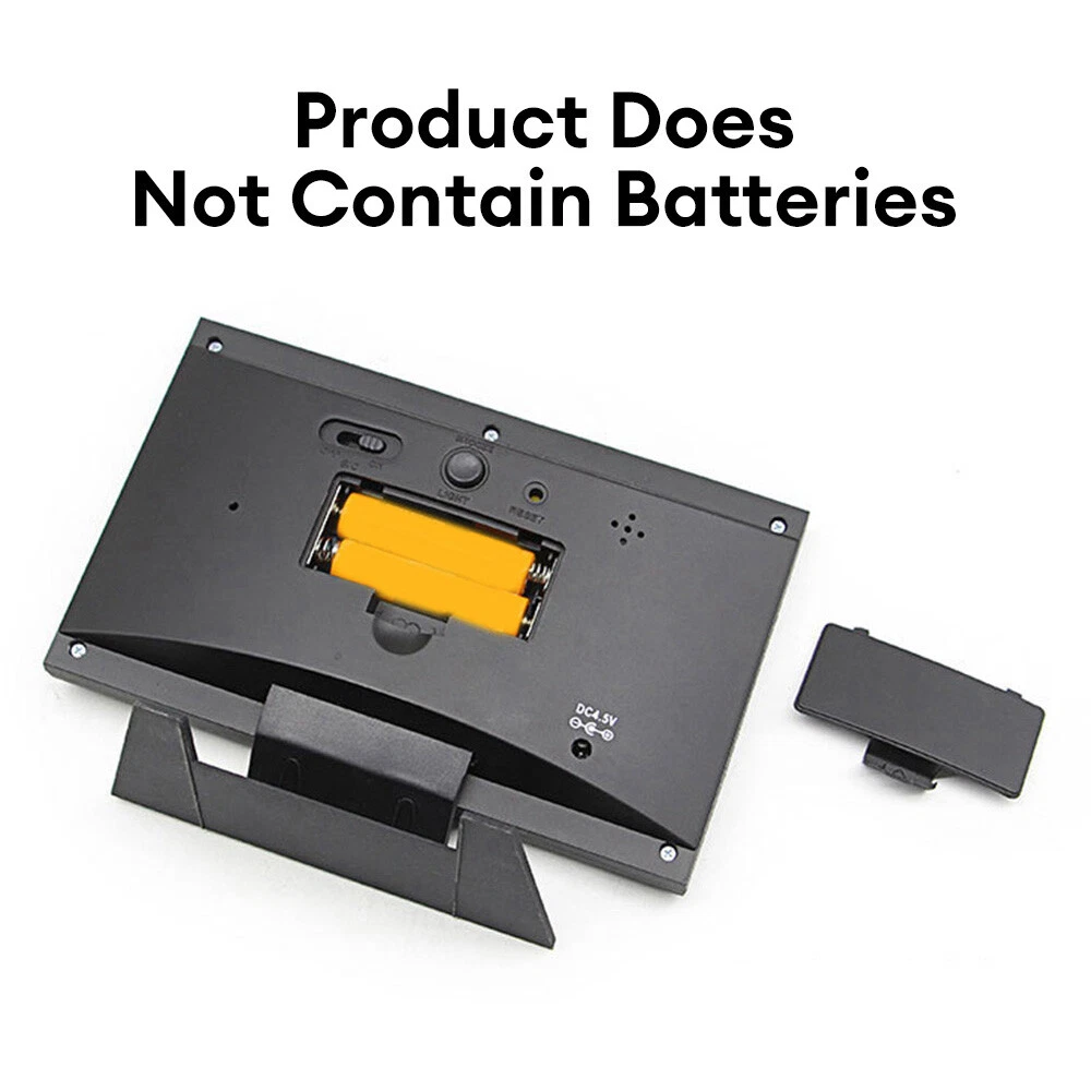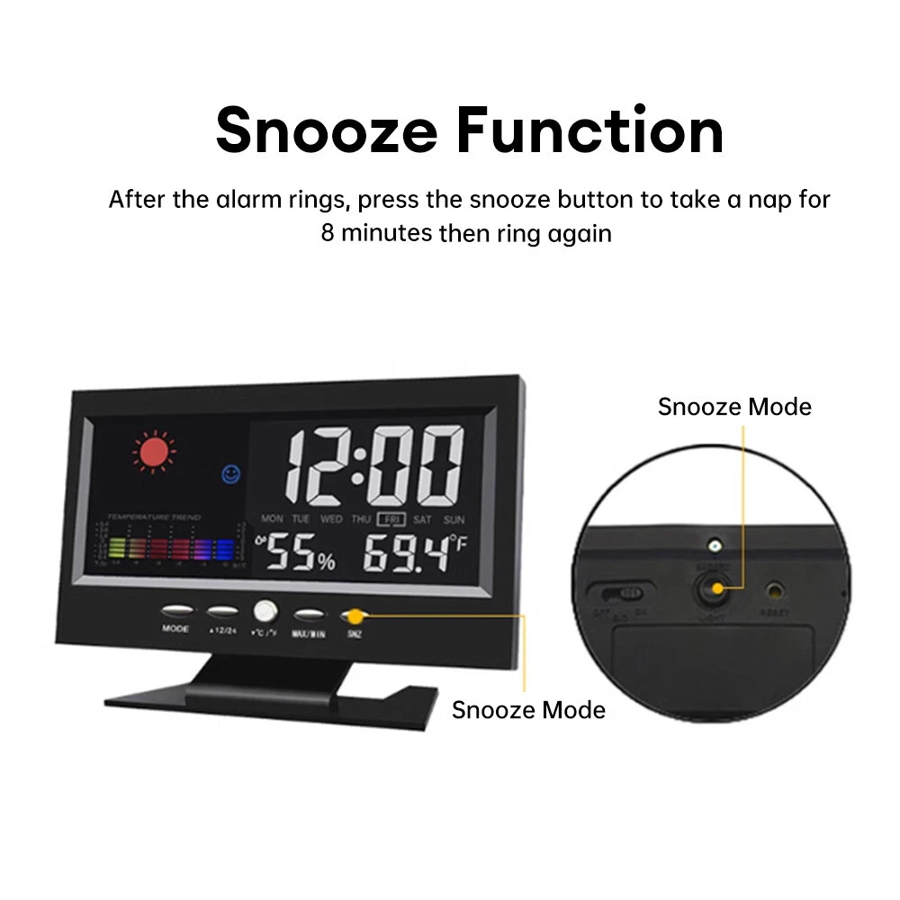 Description: 1. Clock display, 12/24 hours can be switched. 2. It can display time, weather, temperature, humidity, day of the week, temperature trend. 3. With alarm clock, snooze function, weather display, temperature trend indication, very practical. 4. Voice-activated backlight, energy-saving and convenient. You can turn off the voice-activated function through the switch on the back of the product. 5. Powered by 2 x 1.5V AAA batteries (not included). Specification: Material: ABS Color: Black Screen size: 107*58mm Temperature measurement range: -10-61°C / 14.2-140°F Humidity Measurement Range: 20%-99 Power supply: 2 * 1.5V AAA batteries (not included) Packing list: 1x Alarm clock (without battery) 1x USB charging cable Note: 1. When this product is powered by batteries, the screen backlight will not be always on (carbon batteries are recommended, please do not use high-power alkaline batteries) 2.When this product uses USB power supply, the screen will be always lit.