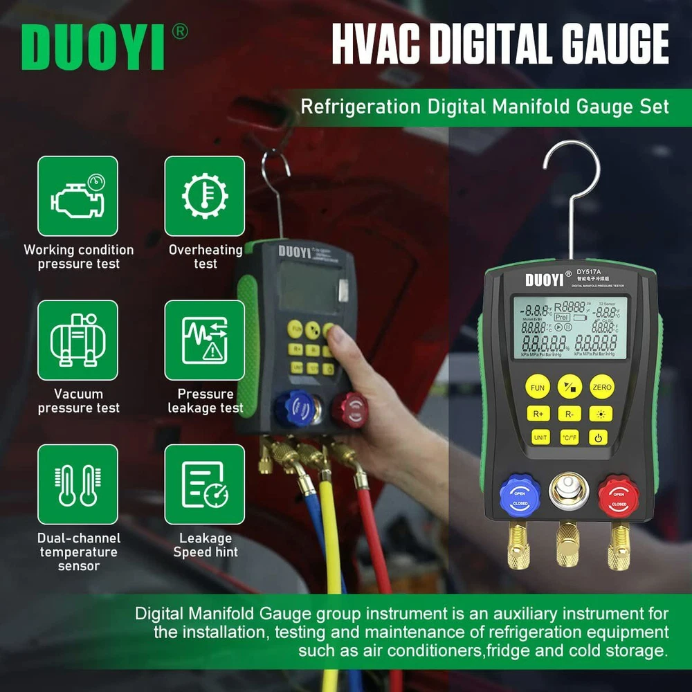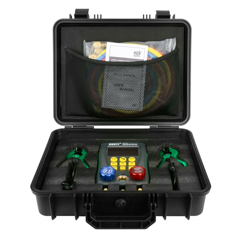 The intelligent electronic refrigerant group instrument is an auxiliary instrument for the installation, testing and maintenance of refrigeration equipment such as air conditioners, fridge and cold storage. Feature: Double pressure test, double temperature test Digital reading, multi-unit switching Large-size LCD display, LCD backlight support Calculate the degree of subcooling and superheating Test the percentage of vacuum measurement; pressure leak measurement, leak time speed record Long-life valve switch, 1/4 inch standard interface design Built-in 32-bit digital processing unit and high-precision data acquisition unit Built-in 89 kinds of refrigerant pressure-evaporation temperature database Pressure Leakage Test Calculate the pressure difference between the initial test pressure and the second test pressure to determine if the refrigerant is leaking. High/Low Pressure Temp Test This Manifold gauge can measure the temperature of the refrigerant in the high/low pressure pipelines of the air conditioning system. Evaporation Pressure & Temp Test The maximum pressure when the refrigerant changes from liquid to gas.The lowest temperature when the liquid becomes gaseous. High-Precision Data Unit Built-in 32-bit digital processing unit and high-precision data acquisition unit, high data and stability. Visual Window & LCD Display The charging status of refrigerant can be directly observed through the refrigeration gauges window. Large-size liquid crystal display, LCD backlight support, data display clear and easy to read. Applicable Scene This digital manifold gauge is an auxiliary instrument for the installation, testing and maintenance of refrigeration equipment such as air conditioners, fridge and cold storage. Compatible with 89 Kinds of Refrigerants: R11 R113 R114 R115 R116 R12 R123 R124 R125 R1270 R13 R134A R14 R141B R142B R143A R152A R170 R21 R218 R22 R227EA R23 R236EA R245CA R245FA R290 R32 R401A R401B R401C R402A R402B R403A R403B R404A R405A R406A R407A R407B R407C R407D R407E R408A R409A R41 R410A R410B R411A R411B R412A R413A R414A R414B R415A R415B R416A R417A R418A R419A R420A R421A R421B R422A R422B R422C R422D R423A R424A R425A R426A R427A R428A R50 R500 R501 R502 R503 R504 R507A R508A R508B R509A R600 R600A R717 R744(Co2) R1234 Note: This pressure guage will read random numbers when it is powered on. You must press the ZERO key to clear the numbers after you power it on, and then you can use it normally. Specification: Pressure test: gauge pressure Pressure test unit: Kpa; Mpa; bar; inHg; PSI. Pressure test range: 0 Kpa – 6000 Kpa Pressure test resolution: 1 Kpa Pressure test accuracy: +/- 0.5 %(FS)+ 5dgt Pressure overload limit: 10000 Kpa (10 Mpa; 100 bar;) Vacuum test: relative vacuum Vacuum test unit: Kpa; Mpa; bar; inHg; PSI. Vacuum test range: -101 Kpa – 0 Kpa Vacuum test resolution: 1 Kpa Temperature test unit: °C (Celsius), °F (Fahrenheit) Temperature test range: -40°C–150°C (-40°F–302°F) Temperature test resolution: 0.1°C (-40°C–99.9°C), 1°C (100°C–150°C), 0.1°F (-40°F–99.9°F), 1°F (100°F–302°F) Temperature test accuracy: +/- 0.5 °C + 2dgt +/- 0.9 °F + 2dgt Package Include: 1x Digital Manifold Gauge 2x Temperature Clips 1x Red Refrigeration Charging Hose 1x Blue Charging Hose 1x Yellow Refrigeration Charging Hose 1X Suitcase 1x User Manual Power Supply: 4 X 1.5V (SIZE.AA / LR6) Battery not include