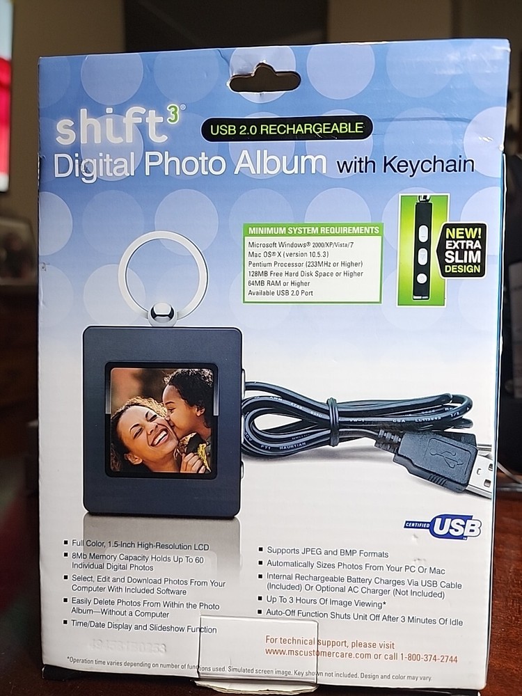 Display your favorite photos wherever you go with this digital photo album with keychain. With a compact size of 1.5 inches, this black photo album has a capacity of 8MB for storing all your treasured memories. It supports media formats like BMP and JPEG, and comes with a USB connectivity option for easy transfer of photos. This photo album also features a keychain, making it easy to attach to your bag or keyring for convenient access. Made in China, this digital photo album is perfect for those who love to keep their cherished memories close by.