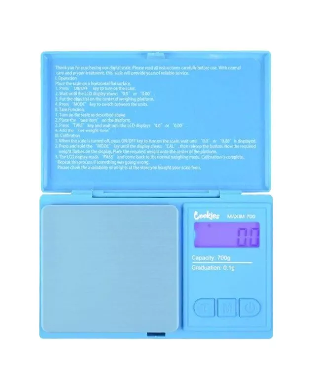This is a modern-style digital pocket scale from the AWS Series, with a capacity of 700g and a precision of 0.1g. It features a solid rectangular shape in a blue color, made of stainless steel, plastic, and metal materials. The scale operates on batteries and has digital, manual, and automatic functionalities. It weighs 0.5 lb and is ideal for kitchen use.