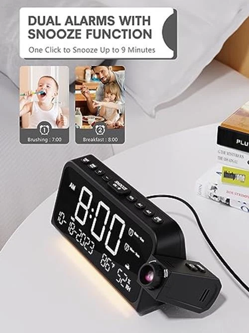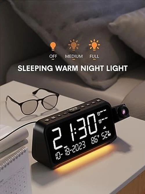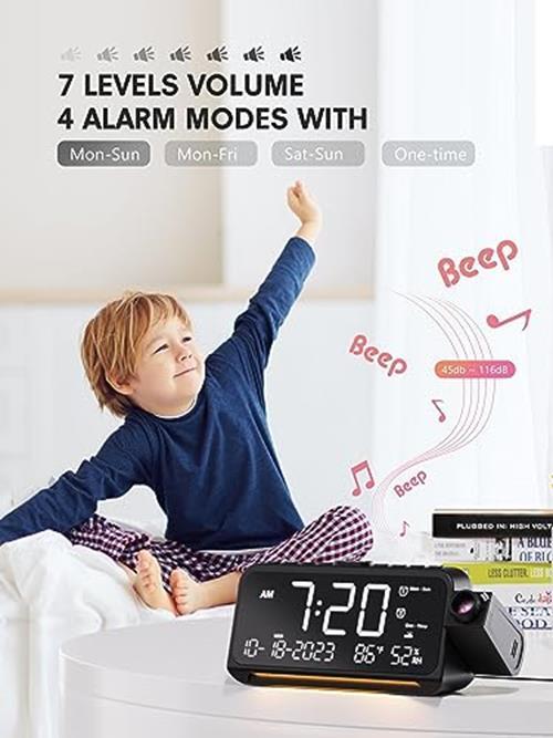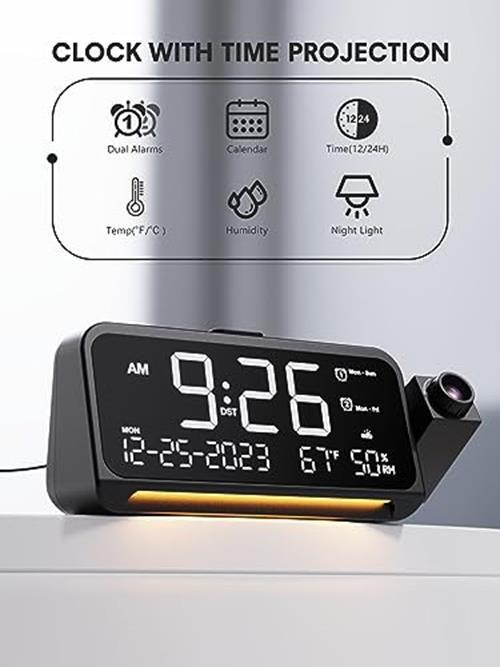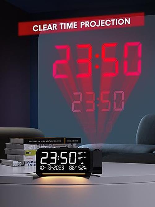 This projection alarm clock is a game-changer! The clear display and adjustable brightness make it easy to read, and the ceiling projection is a cool feature that lets me check the time without moving. The alarm is loud enough to wake me up but not jarring, and I love the customizable settings. Perfect for anyone who wants a functional yet stylish bedroom clock. Highly recommend!