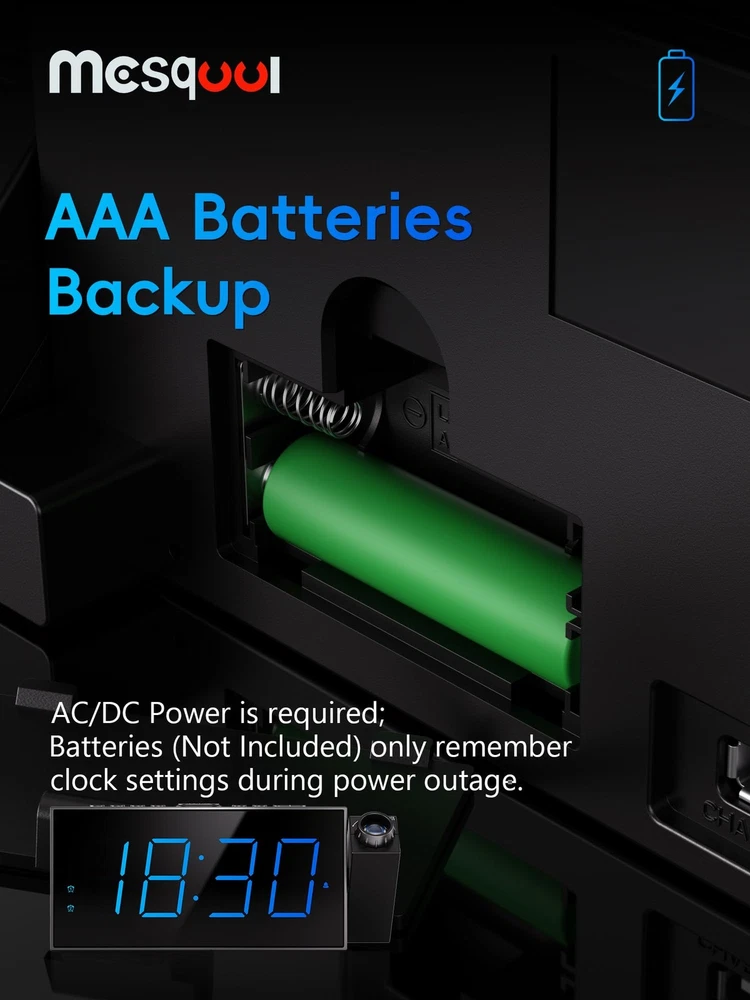 Project clear time on wall or ceiling With 350° adjustable swivel projector, this clock projects the time right onto your wall or ceiling for easy, stress free viewing - all you have to do is open your eyes. Turn on or off as needed. The best thing is that you can project the time really easy. Just repeatedly press “Projection” button and it will appear vividly on your wall. Not Too Faint, Not Too Bright--Just Right The high, medium, and low brightness settings ensure you can easily read the display during the day or night, without being distracted while trying to fall asleep. Charge While You Listen--or While You Sleep Your iPad, iPhone and your smartphone will charge while docked to help you avoid a drained battery, whether you're listening or not. Wake up with a smile and your mobile devices always fully charged! Package Contents: 1* alarm clock 1* US Plug 1* User Manual 2* Black Holders Important: Q: What should I do if this projection numbers on the ceiling is fuzzy? A: Please rotate the focus ring for proper angle to adjust it from fuzzy image to be clear as you desire. Q: How to adjust time numbers from reversed to be normal? A: please press the Projection button once again until make projection numbers to be normal. controller_type: Auto&Manual age_range_description: Over 3 years old 🥰180° 𝗥𝗢𝗧𝗔𝗧𝗔𝗕𝗟𝗘 𝗦𝗪𝗜𝗩𝗘𝗟 𝗣𝗥𝗢𝗝𝗘𝗖𝗧𝗢𝗥✨--Designed with 180° rotatable swivel projector and projects ultra-clear time onto wall or ceiling within the optimum projection distance 1.6-9.8ft, allowing you easily read it even lying on the bed. For more clarity of projection image, you can rotate focus ring🔄 of the ceiling clock by proper angle. Press Projection Mode button to flip the orientation of upside down projection images so the numbers are always right-side-up. 🆕𝗨𝗟𝗧𝗥𝗔 𝗖𝗟𝗘𝗔𝗥 𝗣𝗥𝗢𝗝𝗘𝗖𝗧𝗜𝗢𝗡 𝗪𝗜𝗧𝗛 𝟱-𝗟𝗘𝗩𝗘𝗟 𝗔𝗗𝗝𝗨𝗦𝗧𝗔𝗕𝗟𝗘 𝗕𝗥𝗜𝗚𝗛𝗧𝗡𝗘𝗦𝗦 𝗗𝗜𝗠𝗠𝗘𝗥--The projection part has a dimmer switch with 5 levels, which can be adjusted to your preference. This is helpful for people who are sensitive to light at night and want to reduce the brightness of the bright projection shines on the ceiling. ⏰ 𝗗𝗨𝗔𝗟 𝗔𝗟𝗔𝗥𝗠𝗦 𝗪𝗜𝗧𝗛 𝗖𝗢𝗡𝗩𝗘𝗡𝗜𝗘𝗡𝗧 𝗕𝗜𝗚 𝗦𝗡𝗢𝗢𝗭𝗘 𝗕𝗨𝗧𝗧𝗢𝗡--The projection clock can be set two separate alarms for couples with different routines or a backup for waking up heavy sleepers. The snooze button 💤 is in a convenient central location to turn off alarm to get extra 9 mins sleep before alerting you again. 🔊𝗔𝗗𝗝𝗨𝗦𝗧𝗔𝗕𝗟𝗘 𝗔𝗟𝗔𝗥𝗠 𝗩𝗢𝗟𝗨𝗠𝗘--The alarm volume of this loud alarm clock can be adjusted to your preference by pressing "V+" or "V-" buttons, with levels ranging from 1-5. The incremental increase in volume ensures that the alarm sound gradually gets louder, making it less jarring to wake up to. 🔆𝟳" 𝗟𝗔𝗥𝗚𝗘 𝗦𝗨𝗣𝗘𝗥-𝗖𝗟𝗘𝗔𝗥 𝗧𝗜𝗠𝗘 𝗗𝗜𝗦𝗣𝗟𝗔𝗬 𝗔𝗟𝗔𝗥𝗠 𝗖𝗟𝗢𝗖𝗞 𝗪𝗜𝗧𝗛 𝟱-𝗟𝗘𝗩𝗘𝗟 𝗗𝗜𝗠𝗠𝗘𝗥--7" ultra-large display of the ceiling projection alarm clock enables you to easily view the time even across the room even with glasses👓 off and perfectly for elders. You can dim the display if you are sensitive to light at night by repeatedly pressing "DIMMER" switch with 5 levels, which is also good for protect your eyes. 🔌𝗖𝗢𝗥𝗗𝗘𝗗 𝗖𝗟𝗢𝗖𝗞/𝗕𝗔𝗧𝗧𝗘𝗥𝗬 𝗕𝗔𝗖𝗞𝗨𝗣/𝗨𝗦𝗕 𝗖𝗛𝗔𝗥𝗚𝗜𝗡𝗚 𝗣𝗢𝗥𝗧--This electric alarm clock should always connect with the AC Power for all functions work. It also offers memory backup functionality using 2x AAA batteries (NOT included) to remember the time and clock settings. (When power outage, you don't need to set the time and alarm again.) Besides, the plug-in clock has a built-in 5V/1.0A USB output interface, allowing you to charge Android and iOS cellphones and tablets while asleep. 🎁𝗘𝗔𝗦𝗬-𝗧𝗢-𝗦𝗘𝗧&𝗦𝗧𝗬𝗟𝗜𝗦𝗛--This projection clock's user-friendly and intuitive buttons make setting the time a breeze, even for tech novices like children or seniors. By hold pressing the "DST" button, the DST function is activated. And the time format can be easily customized by long-pressing the 12/24H button to suit individual preferences. This clock makes for a practical and stylish gift that can be cherished by all your loved ones on special occasions. Projection distance and its ceiling size: 3.28ft = 9x 3.54 inch; 6.56ft = 18.9x 7.09 inch; 9.84ft = 25.59x 10.24 inch