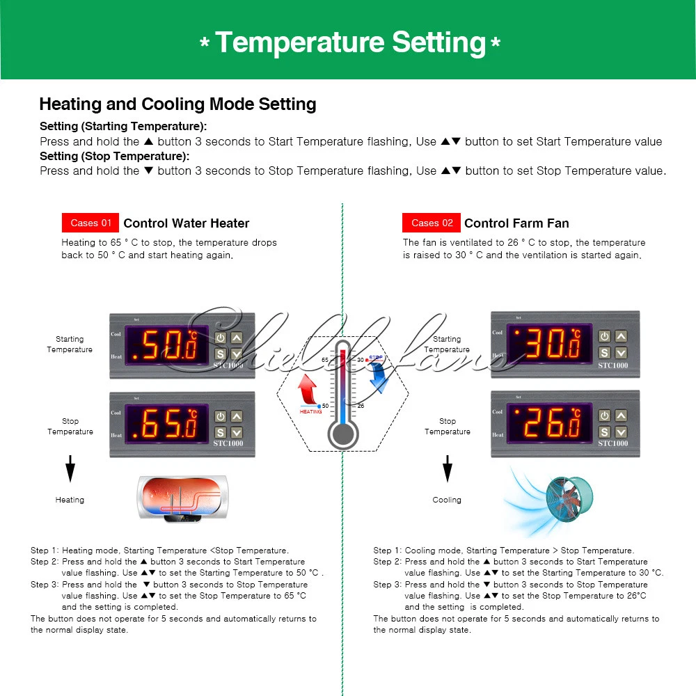 Digital STC-1000 All-Purpose Temperature Controller Thermostat With Sensor W1209 DC12V Product parameters: Temperature control range: -50℃-110℃ Temperature measurement accuracy: 0.1℃ Temperature measurement input: NTC (10k 0.5%) waterproof thermometer Temperature measurement output: 1-way 10A relay Return accuracy: 0.1℃ High temperature protection: 0-110℃ Resolution: -9.9-99.9 at 0.1℃ other 1℃ Input voltage: DC12V Refreshing frequency: 0.5S Overall power consumption: static current < 35MA, Suction Current <65MA Display Type: 0.28 inch red three-digit digital tube Size: 49*40*15.8mm(L*W*H) Packing: PE bag Packing list: W1209 thermostat 12V red LED *1 STC-1000 AC110-220V Product Parameters: Product Name: Digital Microcomputer Temperature Controller Product Name: STC-1000 Input Voltage: AC110-220V Measuring Range: -50℃~99℃ Measuring Precision: ±1℃(-50℃~70℃) Resolution: 0.1℃ Power Consumption: Less than 3W Sensor: NTC Sensor (1m) Ambient Temperature: 0-60℃ Relative Humidity: 20-85% (no dew) Installation Hole: 71*29MM Shell Material: ABS flame retardant plastic case Output Capacity: Cooling (10A/250VAC) Heating (10A/250VAC) 85% (no condensation) Installation aperture: 71 * 29MM Shell material: ABS flame-retardant plastic shell Output capacity: cooling (10A/250VAC) heating (10A/250VAC) Shipping List: Thermostat X1 Payment Method Returns Policy Shipping Feedback Contact us Payment Method 1.We accept PayPal payment ONLY, and must be received within 5 days from the date of purchase. 2. It is easy and safe for you to pay by credit cards, debit cards, bank transfers and PayPal account balances. 3.Buyers are responsible for import duties,custom fees and taxes, if any, please check your country. Returns Policy 1.We believe our items are so outstanding. We are convinced you will be happy with your Purchase. 2. If you do not satisfy with our items. Please simply return to us within 30 Days in original condition. Just pay for the returned postage. Then we can issue full refund or resend the item to you after the returned item arrived at our warehouse. 3. Please include your eBay ID and item number with any email requests. Shipping 1.We only ship to the confirmed address provided by eBay. please make sure your ebay address is 100% matches the address you would like us to ship to. If not, please let us know before we sent you the package, or we will not be responsible for any loss. hope you could understand. 2.Orders will be processed instantly and dispatched within 1-2 business days except hoilday, so we do NOT accept any email/message note after you place orders. 3.All package need to wait 30 days,Please take care it.Less than 30 days,we can't take a refund. Feedback 1.We greatly appreciate your POSITIVE feedback. Please do NOT leave negative feedback without asking for help. 2.Please DON'T leave negative or neutral feedback if you haven't received item in 30 days, because we have mentioned the shipping time repeatedly Contact us 1. If you have any questions, please feel free to email our service specialists. 2.Just contact us using the " Ask the seller a question" link on eBay. 3.Our aim is to provide Top Level Customer Service, normally so we will try our best to solve any problem. On 02/07/2025 at 15:28:13 AEST, seller added the following information: