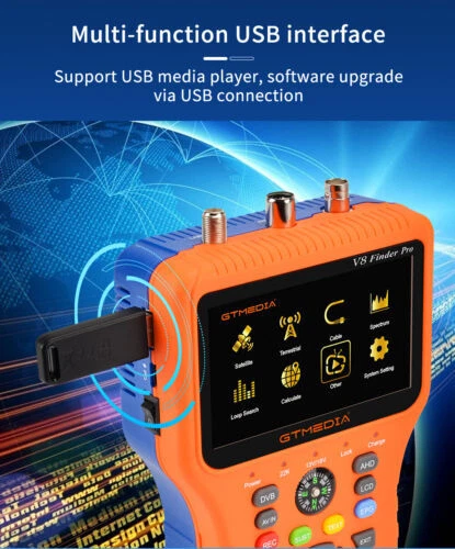 Product Description Digital Satellite TV Finder Signal Meter DVB-S2/S2X/C/T2 COMBO Spectrum Analyzer V8 Finder Pro is a DVB-S2X/S2/S/T2/T/C/ATSC-C and MPEG-2/4 H.264/H.265 (10 bit) compliant handheld combo meter, With its compact size, light weight, intuitive user's interface, long battery operational hours and rich feature set, the meter vides all functions needed for installation and verification of digital satellite TV service, antenna signal and cable signal to residential homes or multi-dwelling units. Features: ● 4.3 Inch High Definition TFT LCD Screen ● Fully DVB-S2X/S2/S/T2/T/C/ATSC-C, MPEG-2/MPEG-4 compliant ● Support H.264/H.265(10 Bit) Hardware decoding ● Digital measuring device for signal strength and quality.Supports presetting all satellite information ● Support Loop Search ● Spectrum analyzer ● Supports scan of Auto, Blind, Manual or NIT ● Sound for Locking Signal ● Auto Calculate Angle of AZ,EL ● Supports DISEQC 1.0/1.1/1.2, Unicable, 0/22kHz Tone ● Speaker Integrated ● Support both AV out and AV in ● Support both HDMI out ● Supports AHD camera input ● Support compass function ● Support real-time power display, with low power reminder ● Supports Youtube for USB wifi 2.4G ● LNB short tect ● 7.4V/4000mAh Li-ion Battery Included ● Software upgrade via USB port ● Easy to carry Product Dimension Size(W*D*H) 123*204*45(mm) Product Net Weight 0.6kg Packing box size(W*D*H) 260*200*57(mm) Package weight 0.85kg Specifications: TRANSMISSION STANDARDS: DVB-S2X/S2/S,DVB-T2/T,DVB-C/ATSC-C,MPEG-2,MPEG-4,H.264/H.265(10 Bit) Supports softcam: BISS auto roll, PowerVu auto roll, TNT(19.2E) Support VCM, ACM, multi-stream, T2MI, Multi-PLP Supports IKS: NEWCAM, MGCAM SATELLITE INPUT/DEMODULATION Connector Type:F Type Input Frequency: 950 to 2150 MHz Signal Input Level: ‐65 to ‐25 dBm Band Switch Control: 22KHz LNB Supply: 13V/18V, Max 350mA Demodulation Type: "DVB-S2 QPSK,DVB-S2 QPSK/8PSK/16APSK/32APSK, DVB-S2X QPSK/8PSK/16APSK/32APSK/64APSK" Symbol Rate: 2