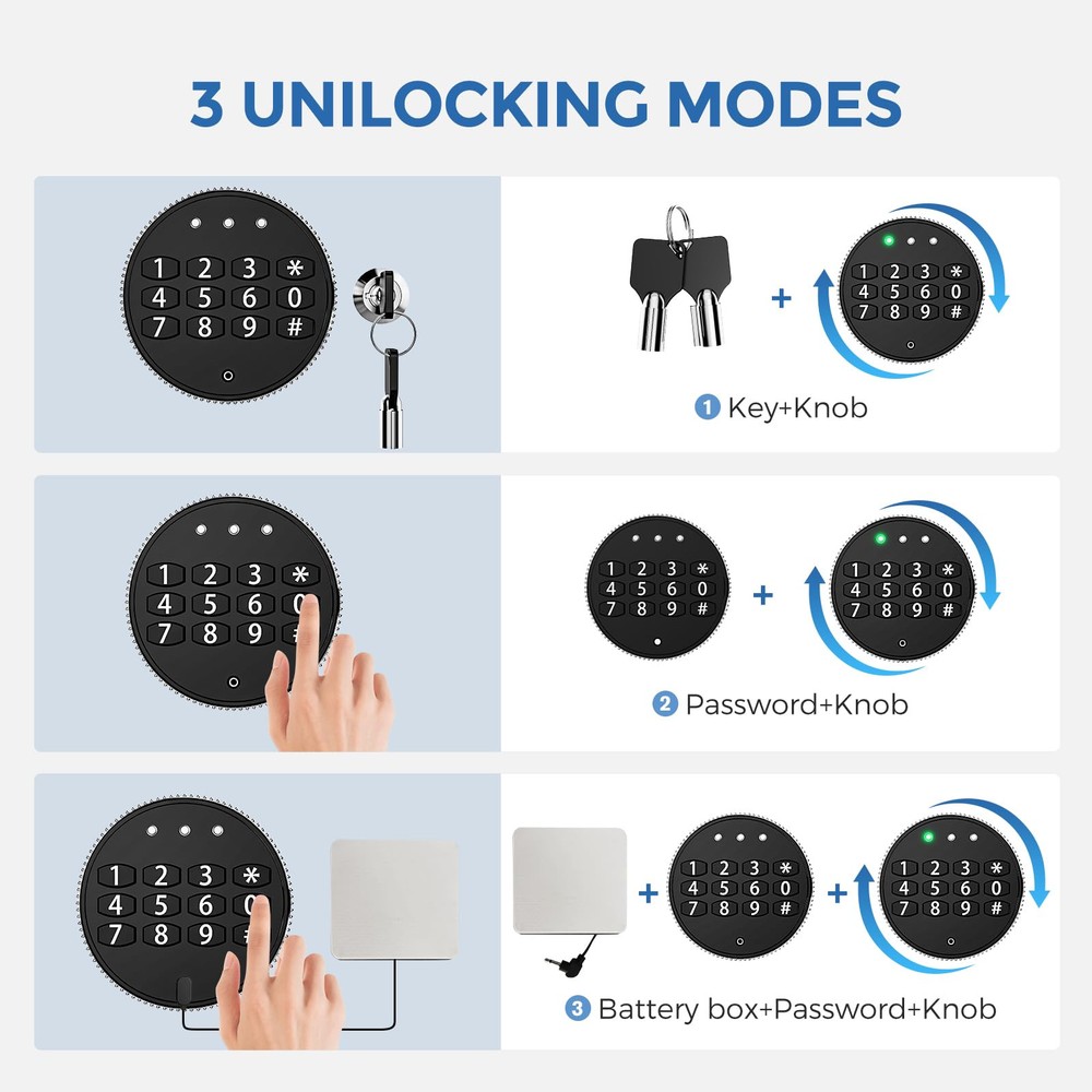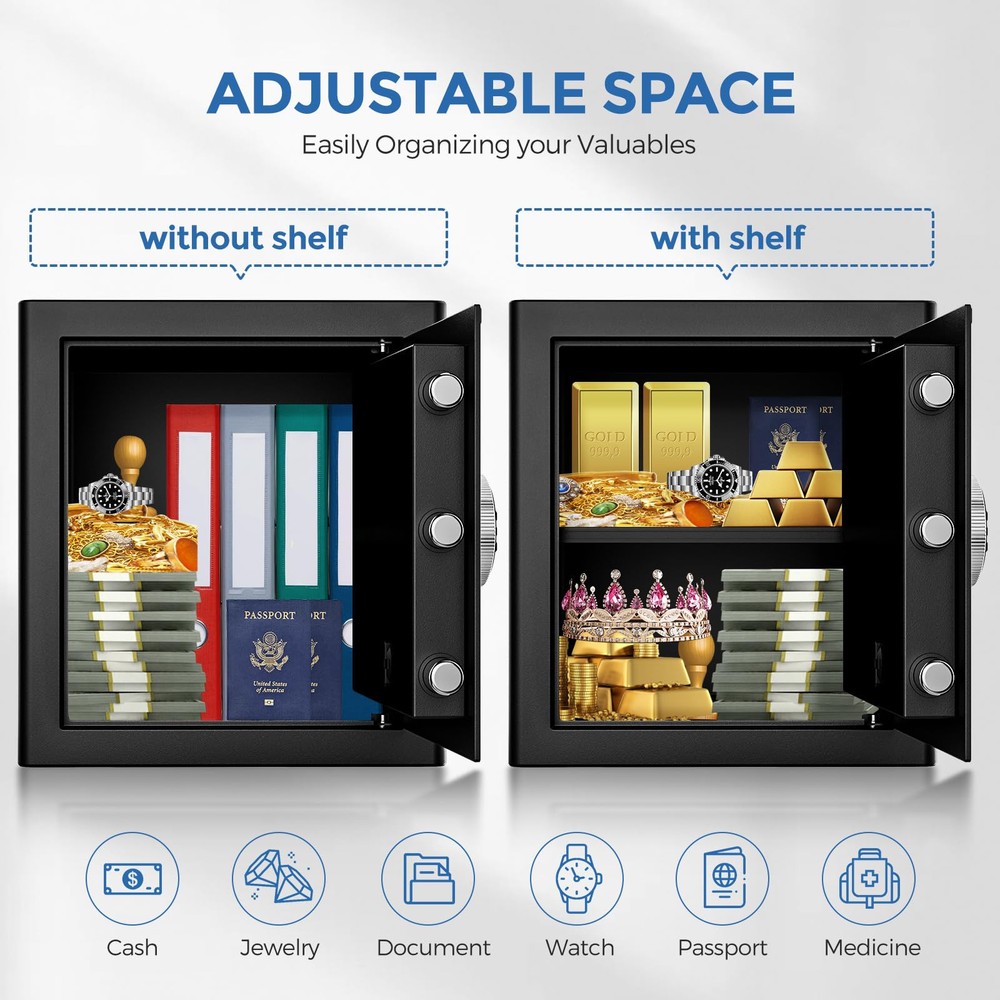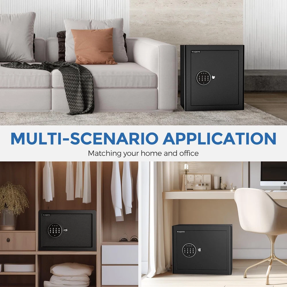 This safe is a fantastic investment for home security! The sturdy low-carbon steel construction with full welding and anti-rust coating ensures long-lasting durability. I love the dual access—digital keypad plus emergency keys—for quick entry. The thick steel latches and reinforced door give peace of mind against break-ins. The programmable alarm adds extra protection, and the fireproof design is a huge plus. Easy to set up and very reliable—highly recommend for keeping valuables secure!
