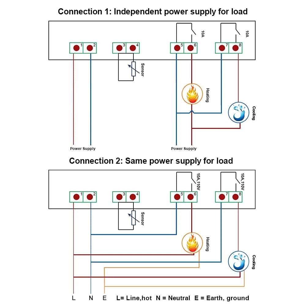 【2m Waterproof probe】Digital temperature controller 110V can be used in moisture and water environment, you can use it in home brewing, fridge, pet breeding, reptile, tank, incubation, fermentation, seedling heat mat, accelerating germination, ect. 【Keep temperaure in desired range】It's on/off control mode. You can program by simply setting temperature set value and difference value, heating and cooling mode can be automatically switched. Fully utilize the stc microcontroller and NTC probe to have this temperature regulator has great accuracy. 【High accuracy】Made of ABS heavy-duty and anti-flamming plastic shell with embedded structure, this digital dual relay thermostat is safe and energy saving. Accuracy: ±1°F, Temperature control range: -58~212°F, Power consumption: ≤3W, Power Supply: 110VAC 50Hz/60Hz. Output: 2 Relays, Cooling (10A/110-220VAC) / Heating (10A/110-220VAC). 【Connect heater & cooler at the same time】No more frequently change wiring between heater and cooler. This temperature regulator has 2 relays. Compared with other 1 relay temperature controllers, you can wire 2 appliances (heater and cooler) at the same time. (Please kindly note no outlets, wiring needed). 【Multi-functional】This incubator thermostat ac110V supports temperature calibration, compressor delay protection, alarm when temperature exceeds temperature limit or when sensor error, all parameters setting can be saved after restart. There is no voltage output directly, you need to connect additional power supply for the load.