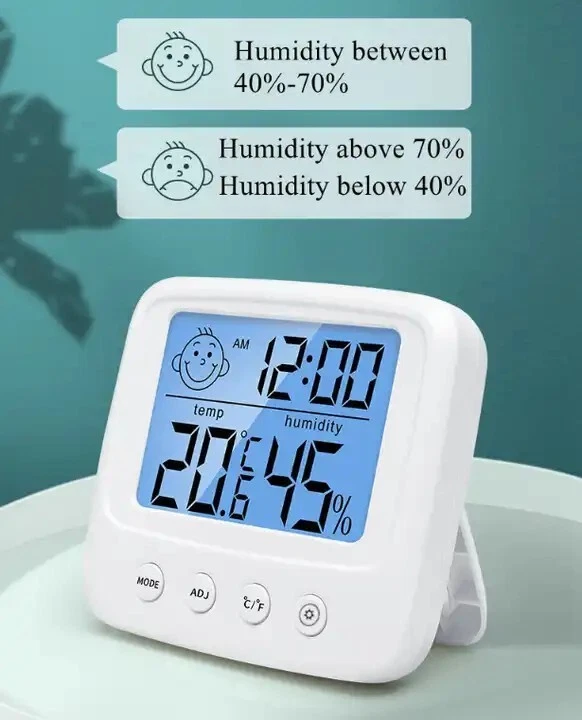 LCD Digital Temperature Humidity Meter Home Indoor Electronic Hygrometer Thermometer Baby Room E0828 Product Description Description: This thermometer hygrometer can display temperature and humidity in real time. This digital thermometer hygrometer is accurate and the temperature range is -50℃ to 70℃, humidity range is 10% to 99%. This digital thermometer hygrometer features a cartoon indicator to show comfort. This room temperature humidity meter allows you to switch between two units: ℃ or ℉. This digital thermometer has 3 buttons that make you can easily set the time and mode. Specifications: Color: White. Material: ABS. Temperature measurement range: -50℃ to 70℃. Humidity measurement range: 10% to 99% (RH). Temperature measurement accuracy: 1℃. Humidity measurement accuracy: 5%RH. Temperature measurement error: ±1℃. Humidity measurement error: ±5%RH. Temperature resolution: 0.1℃. Power supply: 1.5V AAA Battery.(Not included) Size: 82x78x21mm. Note: There might be a bit color distortions due to different computer resolutions. There might be a slight errors due to different hand measurement. Package included: 1x Electronic digital thermometer. Temperature range: -50 ~ +70℃ (-58 ~ +158 ℉) Humidity range: 10% -99% RH (relative humidity) Temperature resolution: 0.1 ℃ (0.2 ℉) Accuracy: ± 1 ℃ (1.8 ℉) Resolution: 1% RH Humidity Accuracy: ± 5% RH (40% -80%) Power Supply: 1 x 1.5V (AAA type) (included)