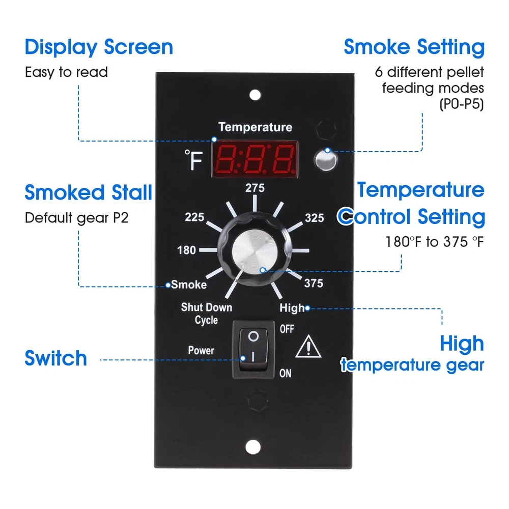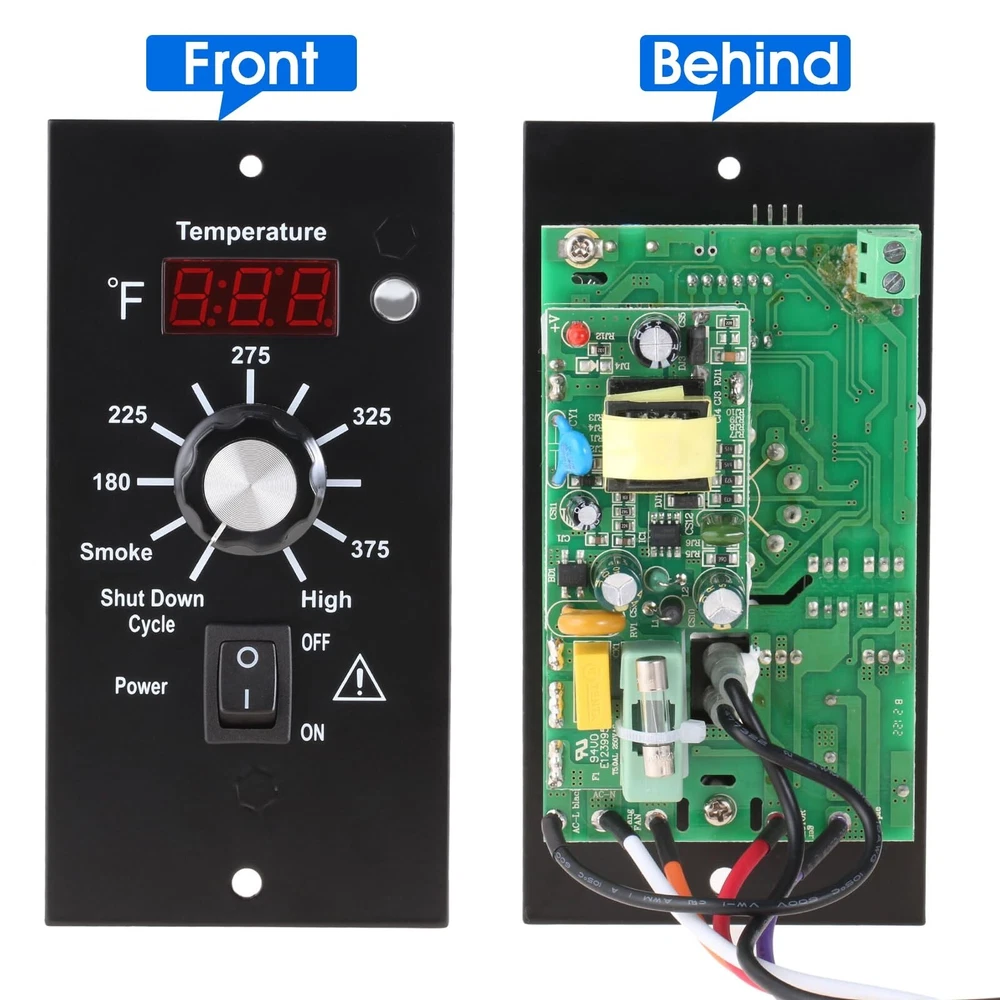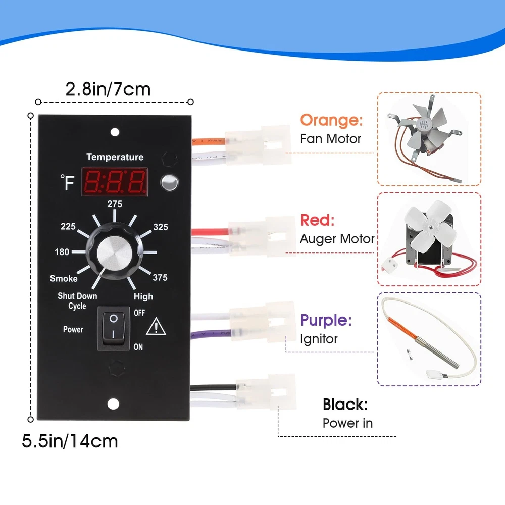 Digital Thermostat Controller Kit, Replacement for Traeger Pellet Grills, Control Board Panel Temperature Thermometer with 7" RTD Temperature Sensor, Replace for BAC236 BAC283 BAC389 BAC334 BAC388 Product Details Brand: DRELD Special Feature: Large Display, High Accuracy Color: Black Age Range (Description): Adult Included Components: Temperature Controller Board, RTD Temperature Probe Outer Material: Wood Display Type: , Digital Product Care Instructions: Wipe Clean Unit Count: 1.0 Count Power Source: Battery Powered Package Dimensions : 10.12 x 8.03 x 2.99 inches; 11.99 ounces Date First Available : August 25, 2021 Manufacturer : DRELD Best Sellers Rank: #168,342 in Patio, Lawn & Garden (See Top 100 in Patio, Lawn & Garden) #349 in Grill Thermometers #349 in Grill Thermometers Customer Reviews: 4.3 4.3 out of 5 stars 55 ratings [COMPATIBILITY]: Perfect replacement for all Traeger wood pellet grill models (except PTG, Ranger and Scout) . This temperature controller set could replace 3 speed smoker control. [MULTIPLE SETTINGS]: 180 to 375 degrees Fahrenheit (up to 450 degrees)! Multi-level temperature regulation can better adapt to the temperature required for roasting various ingredients. Good food requires simple cooking. This product has eight temperature regulation functions to let you experience the fun of roasting. It is also equipped with led to observe the temperature required for roasting more directly. [DISPLAY]: Our LED display could show you the target values, and also you can read it directly under the sunlight through our digital temperature controller kit. [PREMIUM QUALITY]: Made of heavy-duty materials comes with complete accessories, this digital thermostat kit will bring you a wonderful using experience for a long time, because every connector is checked and tested at the factory to make sure that they meet quality control standards. [GUARANTEE AND SERVICE]: This set of grill temperature controller comes with a one-year warranty. If the product failure, simply contact us, our customer service will reply you within 24 hours.