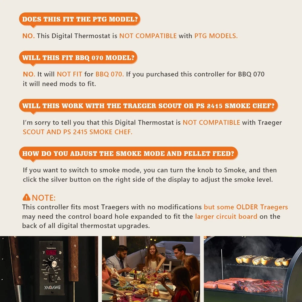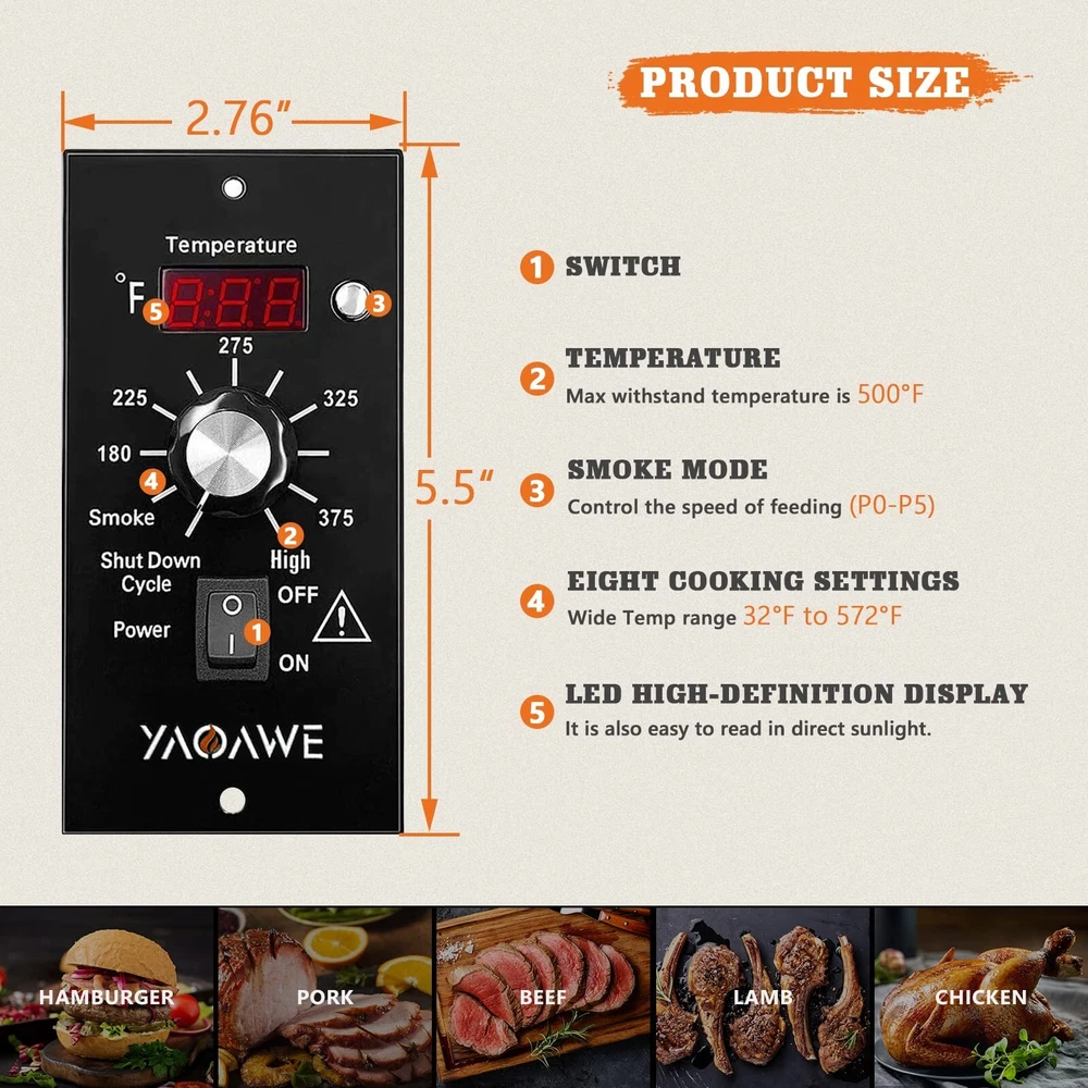 Digital Thermostat Kit Replacement Parts, Compatible with Traeger Pellet Grills, Digital Thermometer Pro Controller, with 7" RTD Temperature Sensor Product Details Style: Control Brand: YAOAWE UPC: 785657077901 EAN: 0785657077901 MPN: Does not apply Brand: YAOAWE Special Feature: High Accuracy Color: Controller Age Range (Description): Adult Display Type: Digital Product Care Instructions: Wipe Clean Unit Count: 1 Count Power Source: Battery Powered Upper Temperature Rating: 190.5 Degrees Celsius Reusability: Reusable Package Dimensions : 9.88 x 3.74 x 3.11 inches; 12.49 ounces Date First Available : June 29, 2020 Manufacturer : YAOAWE Best Sellers Rank: #1,425 in Patio, Lawn & Garden (See Top 100 in Patio, Lawn & Garden) #8 in Outdoor Cooking Replacement Parts #8 in Outdoor Cooking Replacement Parts Customer Reviews: 4.5 4.5 out of 5 stars 2,322 ratings Eight cooking settings. 180 to 375 degrees Fahrenheit (up to 450)! Multiple temperature adjustments. Special smoke mode, which allows users to control the speed of feeding, and supports low-temperature smoking. The 7 "RTD temperature sensor is easy to install, reads target values quickly, and displays accurate cooking temperatures! Multi-function control with cooling cycle function to ensure safety and provide juicy barbecue. LED high-definition display. It is also easy to read in direct sunlight. Show cooking temperature in the grill!