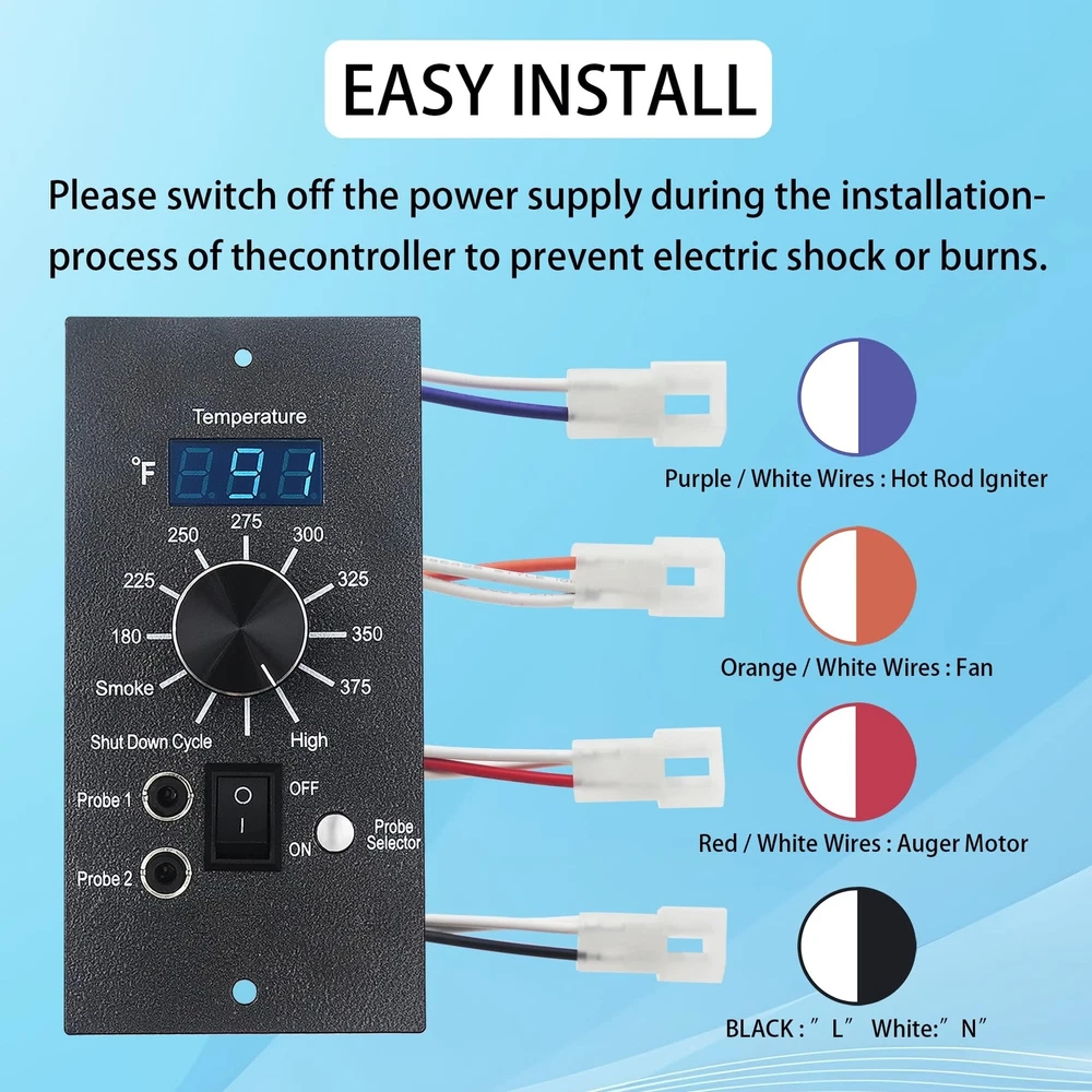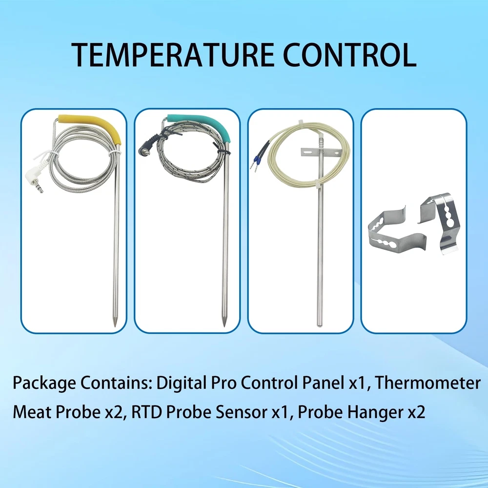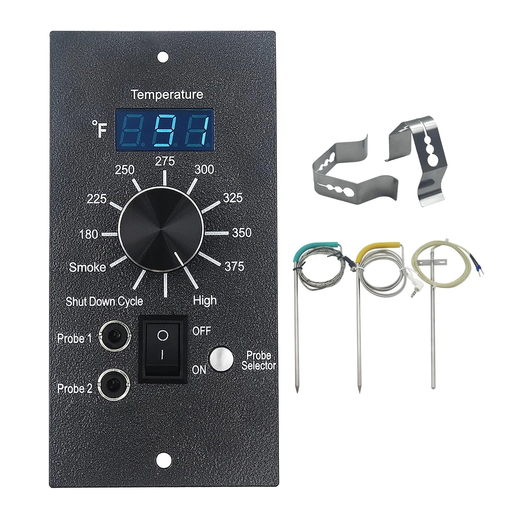 Digital Thermostat Kit for Traeger Control Panel Kit Parts Replacement, Compatible with Traeger Pellet Wood Pellet Grills,with 7" RTD Temperature, 2 Meat Probes.1 Probe Clips Product Details Color: Upgraded Controller+Meat Probe+RTD Brand: ZIZIXIATA Display Type: Digital Manufacturer: ZIZIXIATA Package Dimensions: 7.87 x 3.94 x 2.75 inches Item Weight: 1.1 pounds Manufacturer: ZIZIXIATA Country of Origin: China Batteries required: No Included Components: Control Panel x1Thermometer Meat Probe x2RTD Probe Sensor x1 Probe Hanger x2 Perfect Fits:Replacement for Traeger Controller Item# BAC236, Compatible with Traeger wood pellet grill models (except PTG) increases the stability of the controller, improving the compatibility of the Traeger control panel and equipped with more stable temperature control:Package Contains: Digital Pro Control Panel x1, Thermometer Meat Probe x2, RTD Probe Sensor x1, Probe Hanger x2 Easy install: plug and play, very simple. there are 4 quick connect wires and 1 RTD probe to connect.The red wire connect with auger motoer;the Purple wire connect with hot rod; the orage wire connect with fan; the black color connect with power supply Function Upgrade: Exact cooking thermostat, Bright LED display. Ten cook temperature settings 180 to 375 F (up to 450F) FUNCTION: Equipped with safety device and automatic cooling function, you can enjoy juicy BBQ grilling in safe.