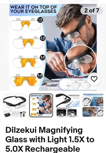 Dilzekui Magnifying Eyeglasses with LED Light ...1.5X to 5.0X Rechargeable w/USB. Includes 4 different lenses magnifications 1.5X, 2.5X, 3.5X, 5.0X , plastic lens case, lens cleaning cloth, usb cord, eyeglass frame and head strap. Shipping to US locations only.
