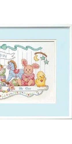 Celebrate a new addition to the family with our Toy Shelf Birth Record Counted Cross Stitch Kit! This counted cross stitch embroidery kit is easy to personalize with baby's name and birthday. Featuring a child's toys lined on a shelf with space to personalize your child's name, this unique gift for new parents is sure to be cherished for years to come! Includes cotton embroidery thread, 14-count white Aida, thread palette, needle and easy instructions including alphabet and number chart for personalizing. Finished design measures 16'' W x 9'' H. Kit contains cotton embroidery thread, 14-count white Aida, thread palette, needle and easy instructions including alphabet and number chart for personalizing Finished design measures 16'' W x 9'' H Easy cross stitch kit pictures a child's toys lined on a shelf with space to personalize your child's name. Toy shelf cross stitch activity is perfect for beginners with easy-to-follow instructions. Counted cross stitch kit makes a great gift for soon-to-be parents!
