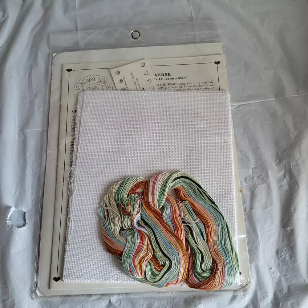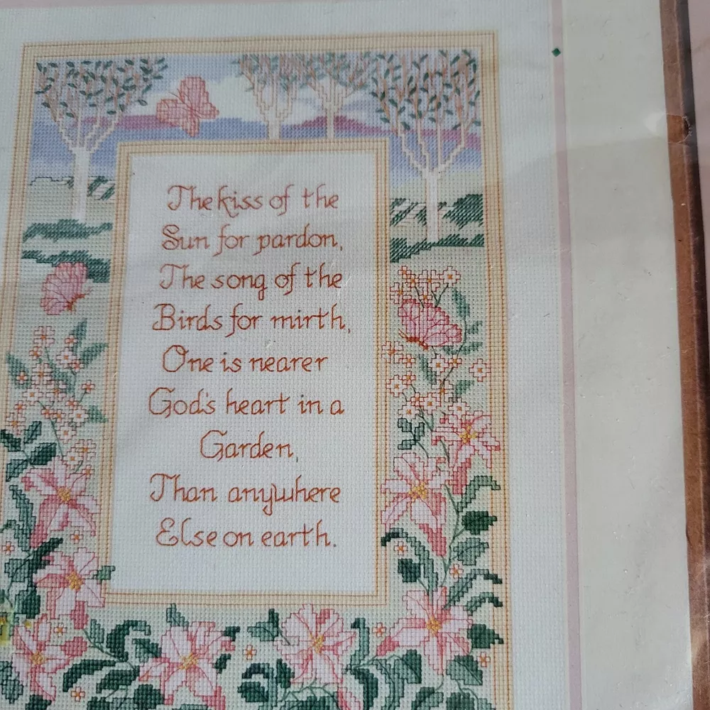 This counted cross stitch kit features a beautiful garden verse design by Molly John from 1987. The kit includes everything you need to create a stunning piece of art, including fabric, floss, needle, and instructions. The brand is "From the Heart" and the theme is "Flowers & Plants". This kit is perfect for anyone who loves cross stitch and wants to add a touch of elegance to their home decor.