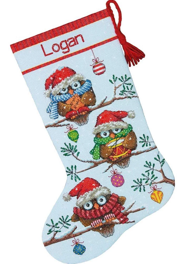 This year, hang a homemade Christmas stocking above the fireplace! The Counted Cross Stitch Personalized Christmas Stocking Kit features three colorful owls decked out in holiday gear! Personalize this Christmas craft by stitching the name of a child, friend, or loved on above the cute Christmas scene! Includes presorted cotton thread, 14 count light blue Aida, felt, needle, and easy to follow instructions with alphabet for personalization. Measures 16''. Holiday Hooties stocking kit includes presorted cotton thread, 14 count light blue Aida, felt, needle, and instructions. Completed Holiday Hooties personalized stocking measures 16''. This year, hang a homemade Christmas stocking above the fireplace with the Holiday Hootes Cross Stitch Stocking Kit! This Holiday Hooties Christmas cross stitch kit includes easy to follow instructions to help you craft a personalized Christmas stocking for someone special. Use the included cross stitch alphabet to personalize your owl stocking with the name of a child, friend, or loved one.