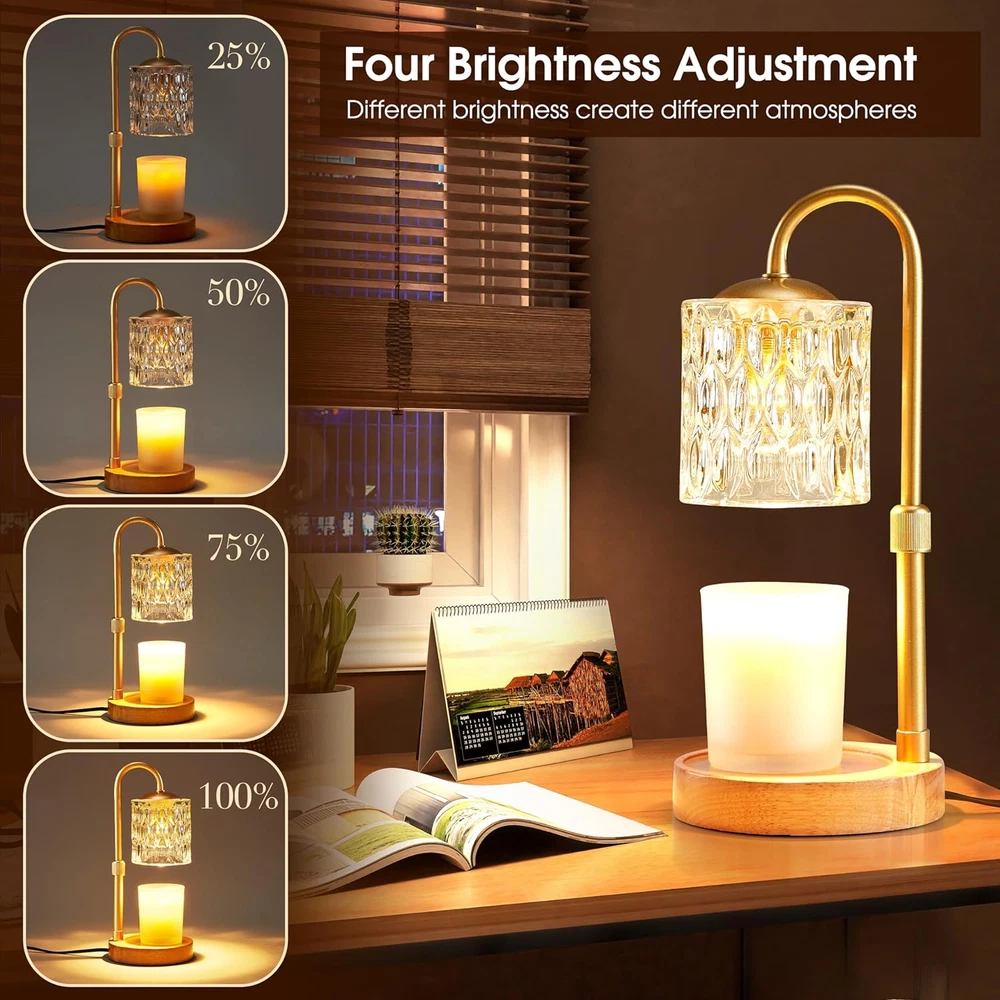 [Safe & Convenient] Briever candle warmer lamp adopts electric heating technology, comes with two 50 W halogen bulbs (without candle), which can emit fragrance by melting the candles, no open fire, no pollution, no smoke, is friendly to people health. Moreover, non-slip pads have been added under the wooden base for stability, making you feel safe when using this candle lamp warmer. [4 Brightness Adjustment] For this candle warmer, you can increase or decrease the brightness through theaugmented symbols and reduced symbols of the button. The brighter the light, the stronger the scent, the darker the light, the lighter the scent, it can be selected according to your preference. Compared with burning candles directly, Different brightness create different atmospheres. [2/4/8H Timing Function] Briever candle wax warmer obtains fragrance by heating from top to bottom to evenly melt candles, with 2/4/8H timer option, it will automatically stop the luminosity at the time, and will stop burning the candle. The candle warmer lamp with timer will help you to save candles and you don't have to worry about forgetting to turn it off. [Flexible Height Adjustment & Beautiful Design] The free lifting bracket of this lamp candle warmer can be easily adjusted in height to accommodate various size up to 5.9 inch candles. In addition, it adopts the fashionable combination of wooden base, metal body and glass shade, very beautiful and atmospheric. This candle lamp is suitable for a variety of occasions, like your bedroom, living-room, break room, office, kitchen, basement, or anywhere you frequent. [Popular Gifts] As the electric candle warmer can be used to adjust the atmosphere, decoration, relaxation, it is a suitable gift for everyone on Valentine's Day, Christmas, New Year, Housewarming or other special occasions. Briever is committed to providing customers with high levels of customer satisfaction. Product Description Briever candle Warmer lamp is a practical and uniquely designed product that melts and scents candles on four levels of brightness, with a 2/4/8 hour timer to avoid flames and fire hazards. It can also be set at different heights to release different levels of fragrance, maximizing the value of the candle. The sophisticated and modern design makes it both functional and decorative, bringing warmth and romance to any space. Kindly Reminder: ·Please do not light candles when using the lamp and candle warmer. ·Please turn off the power before changing the bulb. To avoid burns, please remove and replace the bulb with a new one after it has cooled down. ·After adjusting the height, please tighten the screws on the knob ring with the included wrench to secure the stem and prevent the shade from rotating. ·Please keep candle wax melt lamps out of the reach of children and pets.