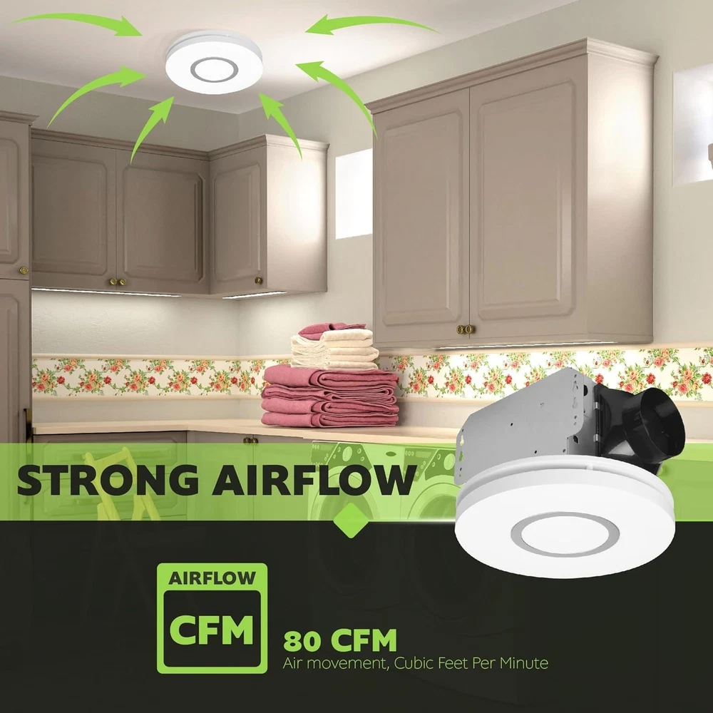 This bathroom fan is a game-changer! The dimmable LED lights with adjustable color temps create the perfect mood, and the quiet 80 CFM airflow keeps the room fresh without any noise. Love the added night light feature—so convenient for late-night trips. Installation was straightforward, and the sleek design blends seamlessly. Highly recommend for anyone upgrading their bathroom!