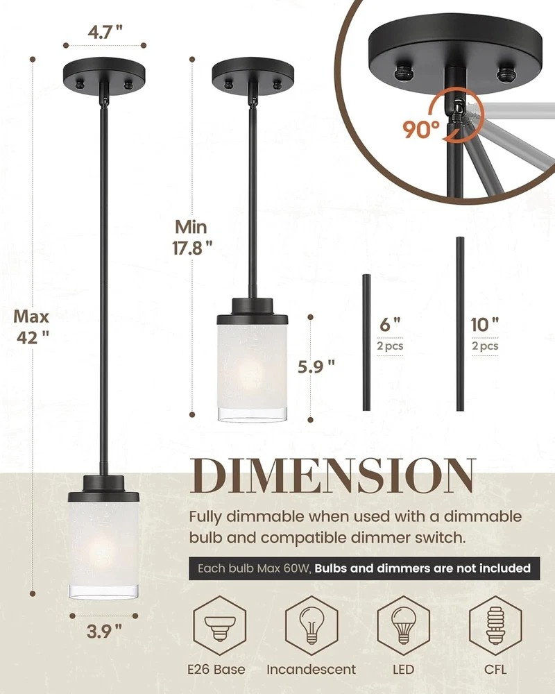 Dimmable Glass Shade Pendant Light - Stylish Indoor Lighting for Modern Homes ‹ › ‹ › ‹ › ‹ › ‹ › ‹ › ‹ › ‹ › ‹ › ‹ › Dimmable Glass Shade Pendant Light Stylish Indoor Lighting for Modern Homes Why Choose Our Pendant Light? For over three years, we have focused on providing unique lighting designs that elevate the elegance of your indoor space. This meticulously chosen light fixture not only illuminates but enhances the aesthetic appeal, fitting seamlessly with various modern styles. Key Features: Height Adjustable: No visible wiring. Includes 2 x 10" and 2 x 6" hard rods, providing a maximum height of 42" for your desired look. Linen Frosted Glass Shade: Measures 3.9" (D) x 5.9" (H). The etched linen and clear glass shade diffuses bright yet softened light, adding a classic and timeless ambiance to your home. Bulb Requirements: Compatible with E26 base socket bulbs including incandescent, LED, CFL, and halogen. Achieve full dimmability when paired with a dimmable bulb and compatible dimmer switch. (Maximum wattage: 60W, bulbs and dimmers not included.) Customer-Centric After Service: We prioritize your experience. Should you encounter any issues, our dedicated customer support team is ready to assist. Transform Your Space: Illuminate your living areas with sophistication and charm. The Dimmable Glass Shade Pendant Light is the perfect centerpiece for dining rooms, kitchens, and living spaces, enabling you to set the mood with adjustable brightness. Embrace the union of style and functionality. Don’t miss the opportunity to enhance your home’s ambiance—order your Dimmable Glass Shade Pendant Light today and redefine your indoor lighting experience! Shipping Free & Fast Shipping - We offer free shipping to most of the USA with a normal delivery time of 3-7 days. However, due to the current situation, additional delivery time (up to 3 weeks) may be required for some items. Alternative Carriers - We may use alternative carriers (e.g. USPS, FedEx, UPS, etc.) to ensure your package arrives safely and on time. Due to the use of multiple carriers, we are unable to provide a tracking number automatically. Handling Time - Orders are processed and shipped within 1-2 business days of receiving cleared payment. Shipping Restrictions - Shipping to Alaska, Hawaii, Puerto Rico, Guam, and other US territories may incur shipping charges or delivery restrictions. Please contact us before ordering, or your order can be refunded/cancelled. State Restrictions - There may be restrictions based on your state of purchase. For example, certain items may not be shipped to California due to state regulations. Contact for Tracking Updates - If you require tracking updates or have any concerns about the delivery of your order, please feel free to contact us, and we will be happy to assist you. Return 30-Day Hassle-Free Returns - We want you to be completely satisfied with your purchase. If you are not, you can return the item within 30 days of receiving it for a full refund or exchange. Easy Return Process - To start a return, simply contact us and we will provide you with a prepaid return shipping label and detailed instructions. Restocking Fee - There are no restocking fees for returns. However, the buyer is responsible for return shipping costs if the return is not due to a seller's error. Refund Processing Time - Refunds will be processed within 5 business days of receiving the returned item in its original condition. Payment We accept all major credit cards, PayPal, and Apple Pay for your convenience. Your payment information is secure and encrypted to ensure a safe and seamless transaction. Please complete your payment within 3 days of purchase to avoid any delays in shipping. Feedback Your feedback is extremely important to us. We strive to provide the best products and customer service possible. If you are satisfied with your purchase, please take a moment to leave us a positive review. If you have any concerns or issues with your order, please contact us before leaving negative feedback. We are committed to resolving any problems and ensuring your satisfaction. Contact Us If you have any questions or concerns, please feel free to reach out to our customer support team. You can contact us through the eBay messaging system. We are available Monday to Friday, 9:00 am to 5:00 pm EST, and we will do our best to respond to your inquiry within 24 hours. Buy it now and enjoy a pleasant shopping experience! UPC: Not Set Lumens: Not specified Item Height: Not Set Item Length: Not Set Item Weight: 2.66 pounds Item Width: Not Set Power Consumption: 60 watts Unit Quantity: 1 Material: Glass Room: Bar,Bedroom,Dining Room,Living Room,Office Light Color: Warm White Features: Dimmable Department: Adults Control Style: Push Button Occasion: Casual Light Direction: Downwards Labels & Certifications: Not Set Brand: Unbranded Type: Pendant Sensor Type: Light Style: Modern Lighting Technology: LED Color: Black Finish: Matte Number of Settings: 1 Shade Shape: Cylinder Power Source: AC Installation Area: Indoor Energy Star: Not Set LED String/Strip Type: Not Set MPN: Not Set EC Range: Not Set Manufacturer: Not Set Item Diameter: 3.9 in Voltage: 120 V Year Manufactured: Not Set Number of Lights: 1-3 Amperage: Not Set Country/Region of Manufacture: Not Set Output Voltage: Not Set IP Rating: Not Set Era: Not Set Manufacturer Warranty: Not Set Color Temperature: Not Set LED Chip Code: Not Set Model: Not Set Product Line: Not Set Unit Type: Unit Assembly Required: Not Set