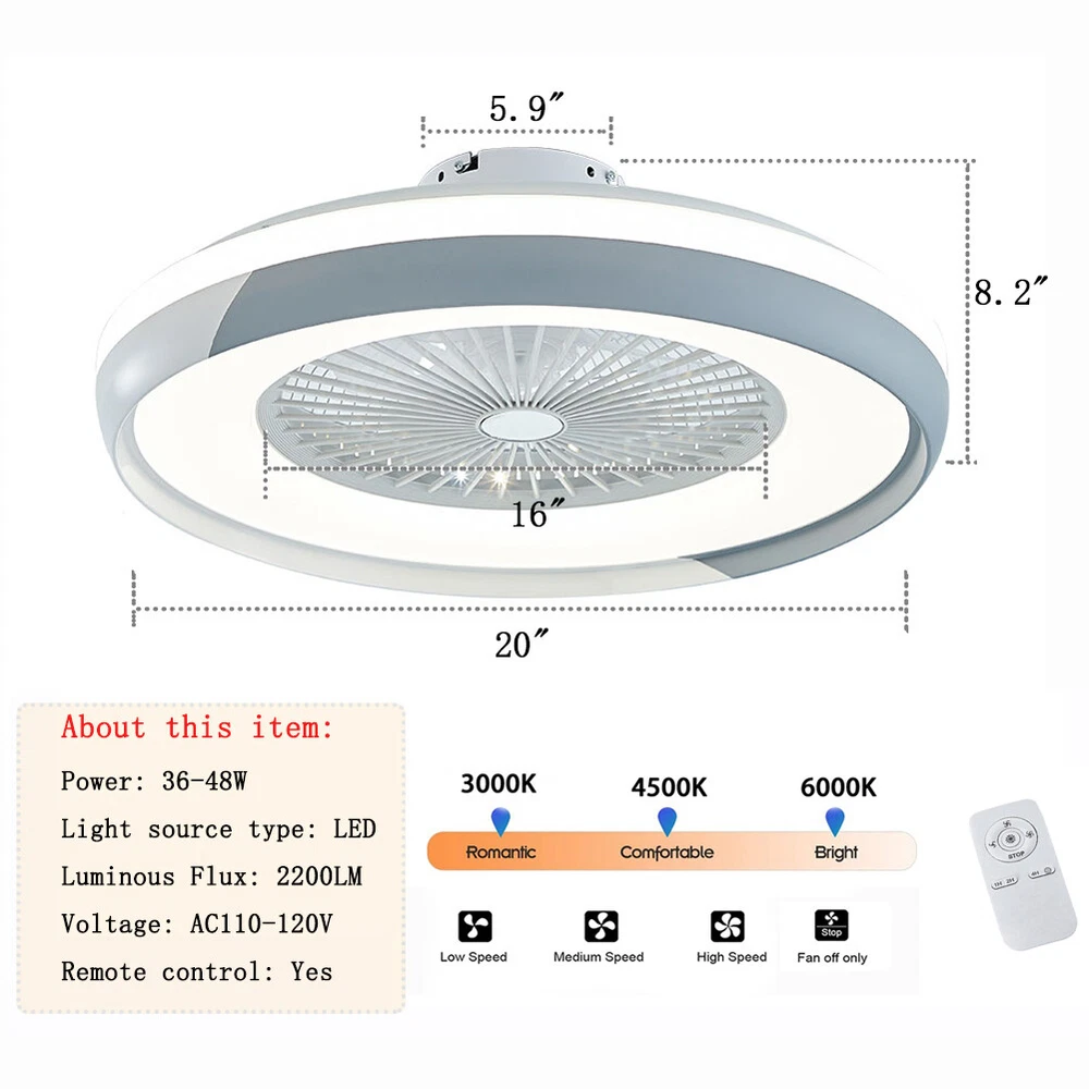 Modern Ceiling Fan LED Light Remote Control Flush Mount Dimmable Chandelier Lamp Modern Ceiling Fan LED Light Remote Control Flush Mount Dimmable Chandelier Lamp Features: Comfortable experience: Combines the advantages of ceiling fans and ceiling lamps. Save space and save money!!! Lighting colors: 3 type of lighting colors (Warm, White, Natural), different lighting effects to adapt to different applications. Remote Control: Lighting adjustment, 3 wind speed setting, timing setting (1/2/4/ hours automatic turn off). All these functions can be easily controlled by remote. Silent work: Ceiling fan's motor is strong, noiseless, comfortable and gentle. Easy to install: Semi Flush Mount. Products include English manuals, remote control and installation instructions, easy to install. Specifications: Light Information Category: Ceiling Fan Light / Ceiling Lamp Usage: Indoor Lighting, Bedroom, Living Room, Dining Room, Restaurant, Bar, Hotel, Shopping Mall, Cafe... Style: Modern / Simple / Creative Dimensions Fixture Height: 8.5" Fixture Width: 20" Bulb Information Bulb Type: LED Bulb Base: SMD Bulb Included Or Not: Bulb Included Wattage: Max 60W Voltage: AC110-120V Material and Colour Material: Acrylic + Metal Suggestion: 1. For a safe and secure installation, please ensure that the electrical box to which this fixture will be mounted is properly attached to a structural member of the building. 2. All wires are connected. When unpacking, be careful not to pull with wires as a bad connection may result. 3. Do not connect electricity until your fixture is fully assembled. 4. To reduce the risk of fire, electrical shock, or personal injury, always turn off and unplug fixture and allow it to cool prior to replacing light bulb. 5. Do not touch bulb when fixture is turned on or look directly at lit bulb. Keep flammable materials away from lit bulb. Payment Delivery details Terms of sales About us Contact us Payment We accept ebay payment ă Fees such as import duties, taxes are not included in the item price or shipping costs. These charges are the buyer's responsibility. Delivery details Shipping: 2-9 working days to: USA Terms of sales We maintain high standards of excellence and strive for hundred percent customer satisfaction. Feedback is very important to us. We hope that you contact us immediately before you give neutral or negative feedback, so that we can address your concerns. It is impossible to address issues if we do not know about them! About us Your satis faction is our ultimate goal. We work hard to earn your trust and future business. Our certified technicians have tested each item before shipping. The unit comes with 1 year limited warranty on all manufacturing defects. a) If you receive a defective item, you may return it or ask for a discount. Please contact us within 14 days after you receive the package. b) What you returned must be intact and in its original packaging as re? u. Customer is responsible for shipping costs of the returned item. c) We will cover the cost of shipping back t with the shipping rate indicated in the registration page. We will send you a new unit or refund the full payment you paid. Thank you. Contact us Business Hour Business Hour: Monday To Friday: 8:30 AM to 5:00 PM (Beijing China time) Due to time zones, our reply to your questions may not be immediately. But within above working time, we will reply your email within 24 hours. If it's non-workdays, please kindly be patient and wait till Monday. Please contact us with ebay message. Please feel free to contact us if you have any questions. Monday To Friday: 8:30 AM to 5:00 PM (Beijing China time) Due to time zones, our reply to your questions may not be immediately. But within above working time, we will reply your email within 24 hours. If it's non-workdays, please kindly be patient and wait till Monday. Please contact us with ebay message. Please feel free to contact us if you have any questions. Features stable performance Bundle Description no đ„Featuređ„ đ„High Safetyđ„High Performanceđ„Good Stabilityđ„ Highlights Compact Design, Unique AppearanceïŒHigh Reliability â€Highlights†â€Long Service Lifeâ€Creative Designâ€Premium Material†* Feature * *Durable Material*Good Performance*Beautiful Appearance* â Featuresâ â â â Reliable Qualityâ â â Easy installationâ â â Ideal Giftâ â â Feature 1 Durable , Made of high quality material Shipping Note Cannot ship to Puerto Rico & Hawaii Brand Unbranded Type ceiling light Style Modern / Simple / Creative Room Bedroom, Hallway, Dining Room, Bar, Living Room, Restaurant, Hotel, Shopping Mall, Cafe Material Metal Color White+Grey Shade Shape Drum Voltage AC110-120V Department Adults Occasion Best Wishes Lighting color Warm/ White/ Natural Bulb Type LED Bulb Base SMD Wattage Max 60W Sensor Type Light Installation Area Indoor Lighting Technology LED Light Direction Upwards Assembly Required Yes Labels & Certifications Energy Efficient Number of Speeds 3 Power Source Corded Mounting Ceiling Mounted Required Tools Screwdriver Control Style Remote Control