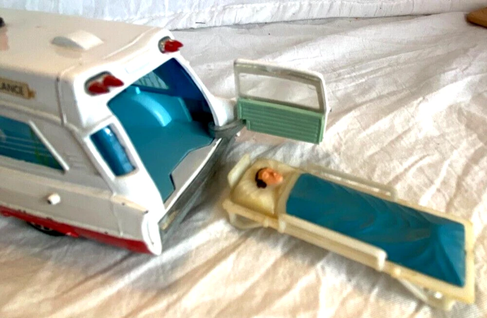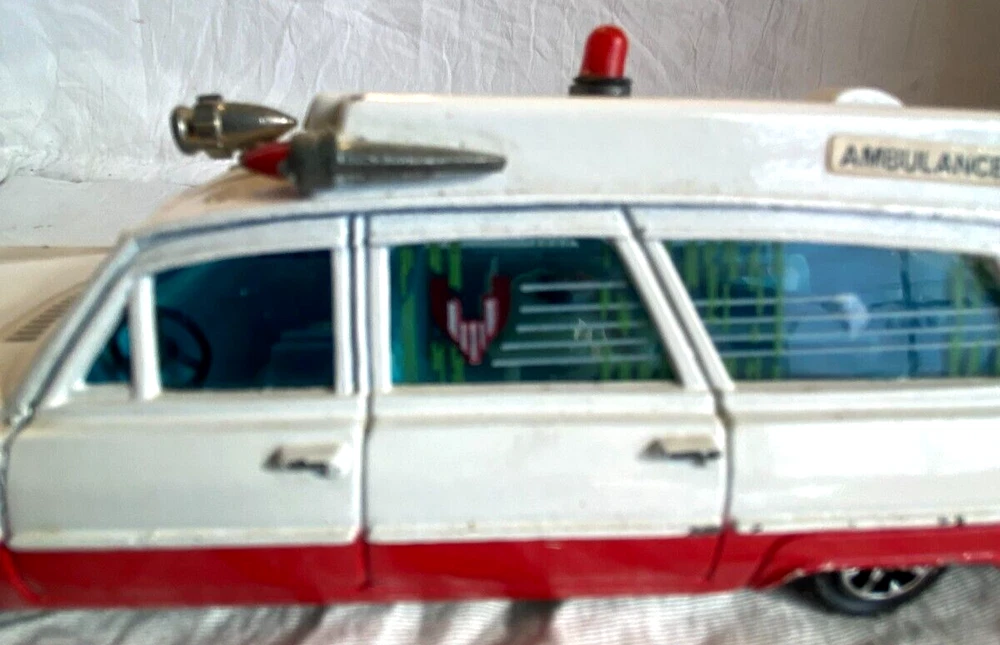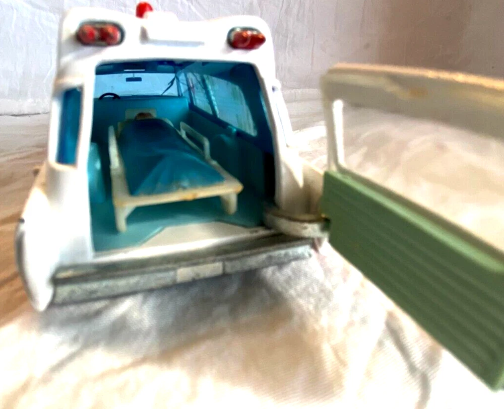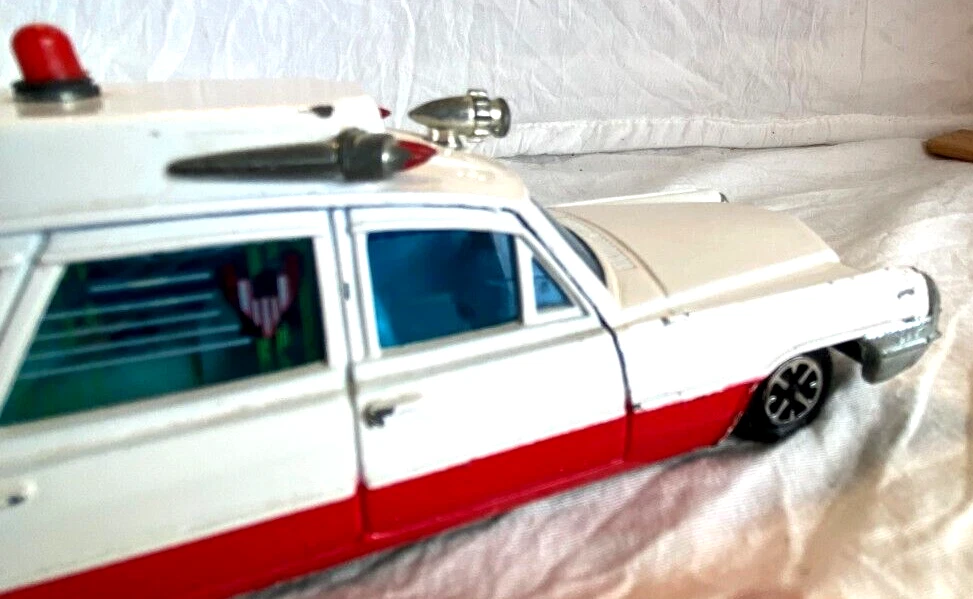 Hey Dinky Toy Lovers, Here is a must have for your collection. In the 1970's Dinky Toys decided to manufacture this 1973 Superior Criterion Rescuer Ambulance on a Cadillac Chassis, no suspension, dummy beacon, one-piece molded plastic wheels and tires, 4-spoke rims, with blue tinted windows. It is a Replica of Ambulance - Superior Coach Corporation (USA). It is 1:43 scale. You already know Dinky Toys are made in England. As always Dinky Toys makes awesome Toys & this is no exception. It's made of Diecast Metal & although it's preowned, this one is in very good condition. Unfortunately, there is no box with it. The back door opens to reveal a patient on a stretcher that comes out, so realistic, right. The license plate reads, "65-441-H" & I'd love to know it's history, but I do know it is Ref. #288C. Don't miss out on this offer if you're a Dinky Toy, Ambulance or just any type of Toy Collector. Smoke Free Environment Stored for 25+ years (Seller Cat.#0343) Ref. #288 (A), 1971, dummy beacon; Ref. #288B, 1972, no suspension, dummy beacon, one-piece molded plastic wheels and tires, 4-spoke rime; Ref. @#288C, 1973, as previous toy, with blue tinted windows;