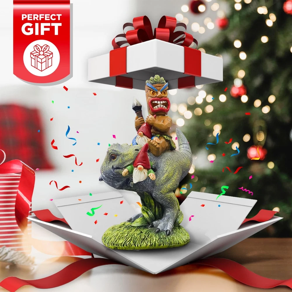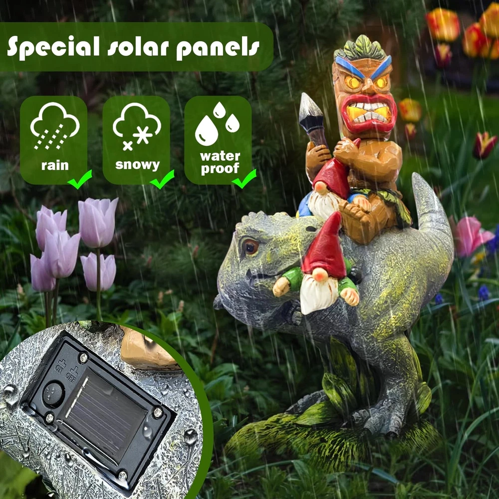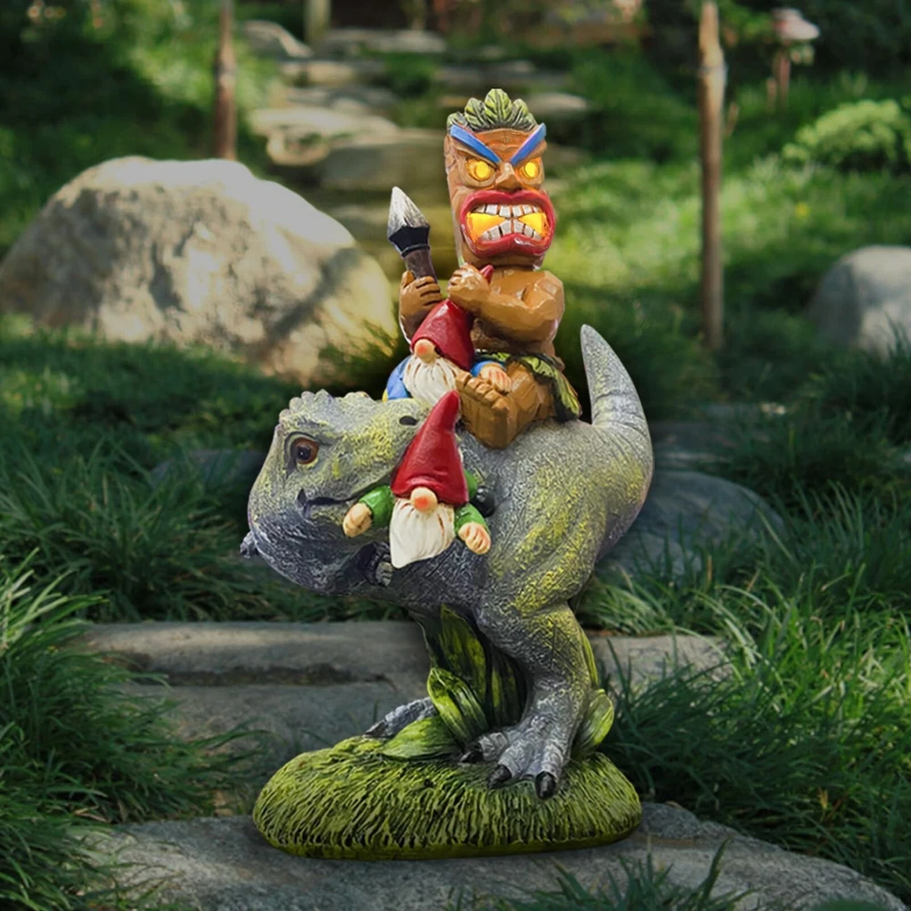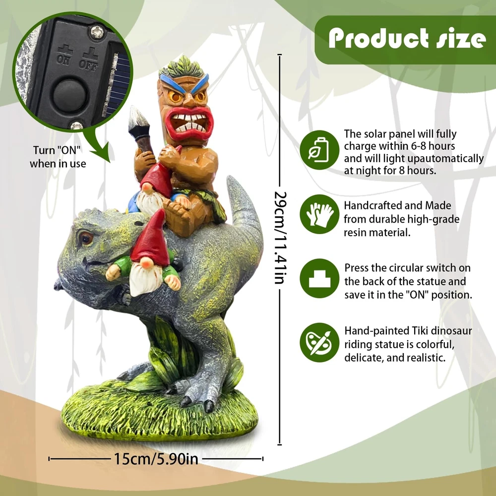 Dinosaur Tiki Bar Decor Gnome Garden Solar Statue Outdoor Funny Dinosaurs Patio, Lawn Ornament, Gardening Gifts for Women for Housewarming - Special Garden Gift Product Details Package Dimensions: 13.39 x 10.35 x 6.5 inches Item Weight: 2.66 pounds Manufacturer: OAWPKY Country of Origin: China Item model number: CRSZ0001 Date First Available: September 14, 2024 Tiki Warrior Riding Dinosaurs: This charming garden statue depicts a fierce Tiki warrior riding a dinosaur wielding a stone spear, adding a touch of island charm to your outdoor space Durable resin structure: This statue is made of high-quality resin, paired with outdoor specific pigments, designed to resist outdoor factors and maintain its vivid appearance Fantastical ornament: This statue is about 11.4 inches tall and can be placed on a tabletop, garden bed, or nestled among plants, adding a whimsical color Professional after-sales service: We attach great importance to your shopping experience. If you have any questions about this solar powered statue, please contact the seller directly and we will provide you with satisfactory after-sales guarantee