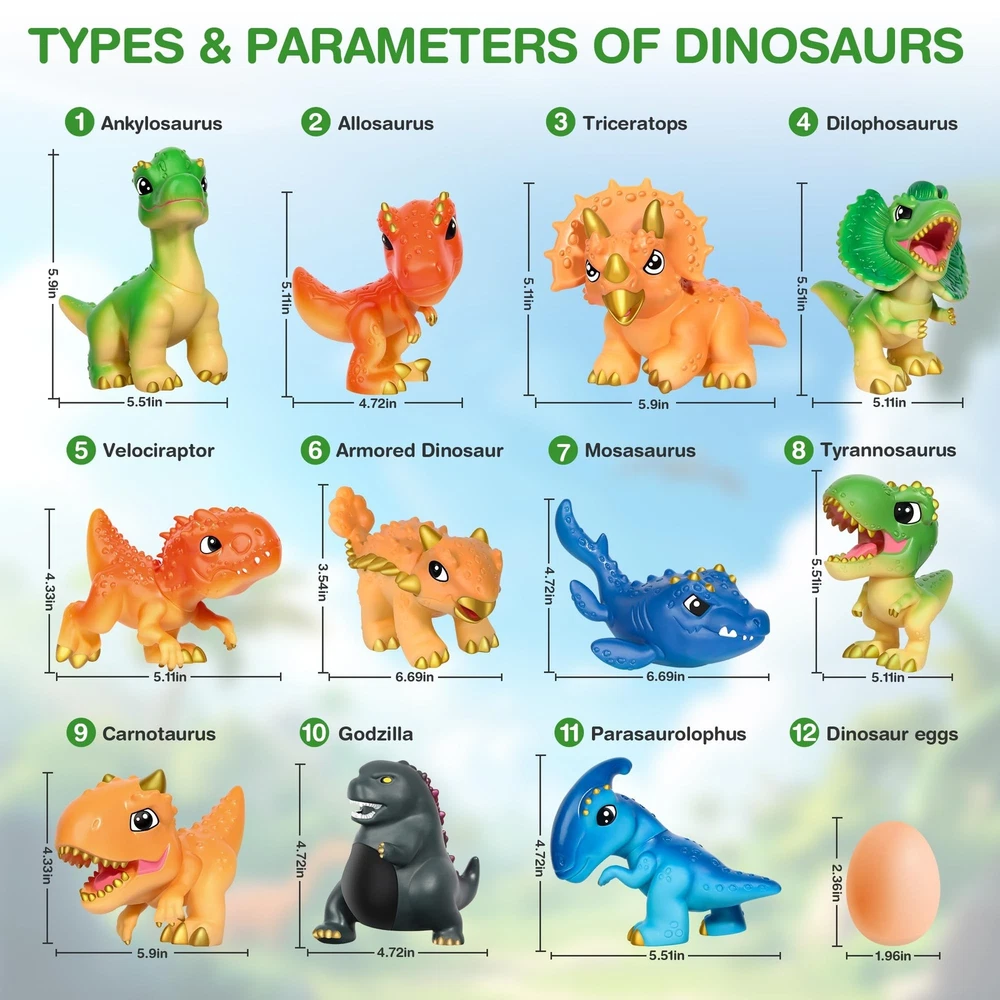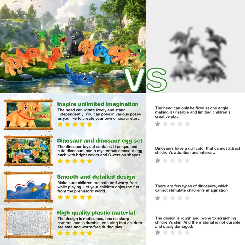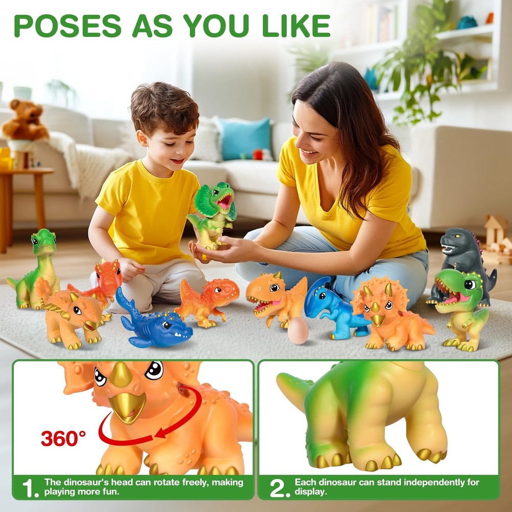 Dinosaur Toys for Kids 3-5, Plastic Dino Toy Set for Boys Age 4-7, 11 Soft Small Dinosaur Figures & 1 Egg, Series of Dinosaur Models for Toddlers Dinosaur Lovers Product Details Size: 11PCS Brand: Ykanzz MPN: 999-1 UPC: 782926883096 EAN: 0782926883096 Product Dimensions: 1 x 1 x 1 inches Item Weight: 2.75 pounds Country of Origin: China Item model number: 999-1 Manufacturer recommended age: 36 months - 12 years Manufacturer: Ykanzz 11 Dinosaurs & 1 Egg: Are You Ready to Embrace a Colorful Dinosaur World? This dinosaur toy set includes 11 unique and cute dinosaurs and 1 mysterious egg, each with bright colors and a Q-shaped design. Children will immerse themselves in this world full of laughter and joy, unleashing their imagination. Inspire Infinite Imagination: Each dinosaur's head can freely rotate and stand independently, making it more vivid and interesting for display or play. Children can freely pose in various positions and create their own dinosaur stories. Safe and Worry Free Happiness: This dinosaur toys are made of high-quality plastic material, with meticulous design, no sharp angles, and long-lasting durability, ensuring that children can play safely and worry free. Parents can rest assured that their children can enjoy the fun from this prehistoric world. (Certified to international environmental standards and tested by ASTM F963-17 and CPSIA) A Bridge for Parent-child Interaction: Every dinosaur is like the beginning of a story, waiting for children to explore and create. These cute little ones are not just toys, but also tools that inspire children's unlimited imagination. They can build their own dinosaur kingdom or create a prehistoric adventure! Perfect Combination of Education and Entertainment: Parents and children play the role of dinosaurs together, creating wonderful stories that not only enhance parent-child relationships, but also allow children to learn more about dinosaurs. Perfect for giving to children who love dinosaurs! Are you ready to welcome a dinosaur world full of laughter and joy? This colorful dinosaur toy set includes 11 unique and adorable dinosaurs and 1 mysterious egg, each with bright colors and a Q-shaped design. Children can freely rotate the heads of each dinosaur, pose in various positions, and create their own dinosaur stories. This set of toys is made of high-quality plastic material, with meticulous design, no sharp angles, and long-lasting durability, ensuring that children can play safely and worry free. These cute little ones are not just toys, but also tools that inspire children's unlimited imagination. Parents and children play the role of dinosaurs together, creating wonderful stories that not only enhance parent-child relationships but also allow children to learn more about dinosaurs. Perfect for giving to children who love dinosaurs!