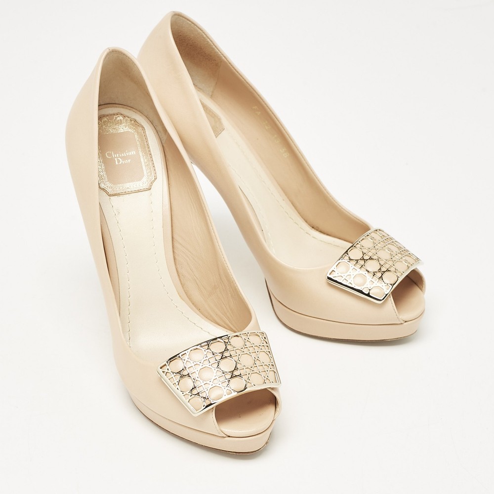 Make a chic style statement with these designer pumps. They showcase sturdy heels and durable soles, perfect for your fashionable outingsCertified by The Luxury Closet - This item has gone through a detailed authentication process overseen by our experts. We offer a lifetime guarantee of authenticity on all our items. Import duties, taxes and charges are not included in the item price. These charges are the buyers responsibility. Please check with your country’s customs office to determine what these additional cost will be prior to buying. Our eBay Store About Us Contact Us Add to Favorite Sellers Dior Beige Leather Cannage Plaque Peep Toe Platform Pumps Size 38 $225.5 Make a chic style statement with these designer pumps. They showcase sturdy heels and durable soles, perfect for your fashionable outings Product Details Brand Color Beige Dimensions Material Leather Size 38 Outsole Width 7.5 cm Outsole Length 21.5 cm Heel Height 12 cm Includes Original Dustbag, Original Box Certified by The Luxury Closet This item has gone through a detailed authentication process overseen by our experts. We offer a lifetime guarantee of authenticity on all our items. How We Check The in-house team of experts at The Luxury Closet is highly trained to verify the authenticity and the condition of the luxury products. They ensure that only 100% authentic items are put on sale.The evaluation process is unique with its own mix of assessment criteria and differs according to the category. Each item is evaluated based on the following combination of hallmarks, hardware, stitching, symmetry, material, craftsmanship, stamping, codes, hologram stickers, and packaging. Our authenticators also check if the items have been modified or amended (e.g., aftermarket diamonds, replaced batteries, repaired bags, etc.) International Buyers Import duties, taxes and charges are not included in the item price. These charges are the buyers responsibility. Please check with your country’s customs office to determine what these additional cost will be prior to buying.