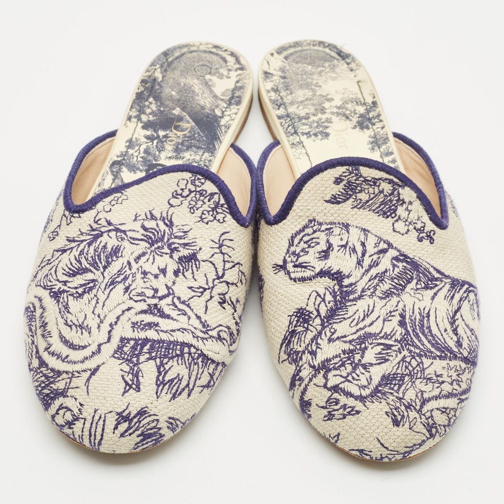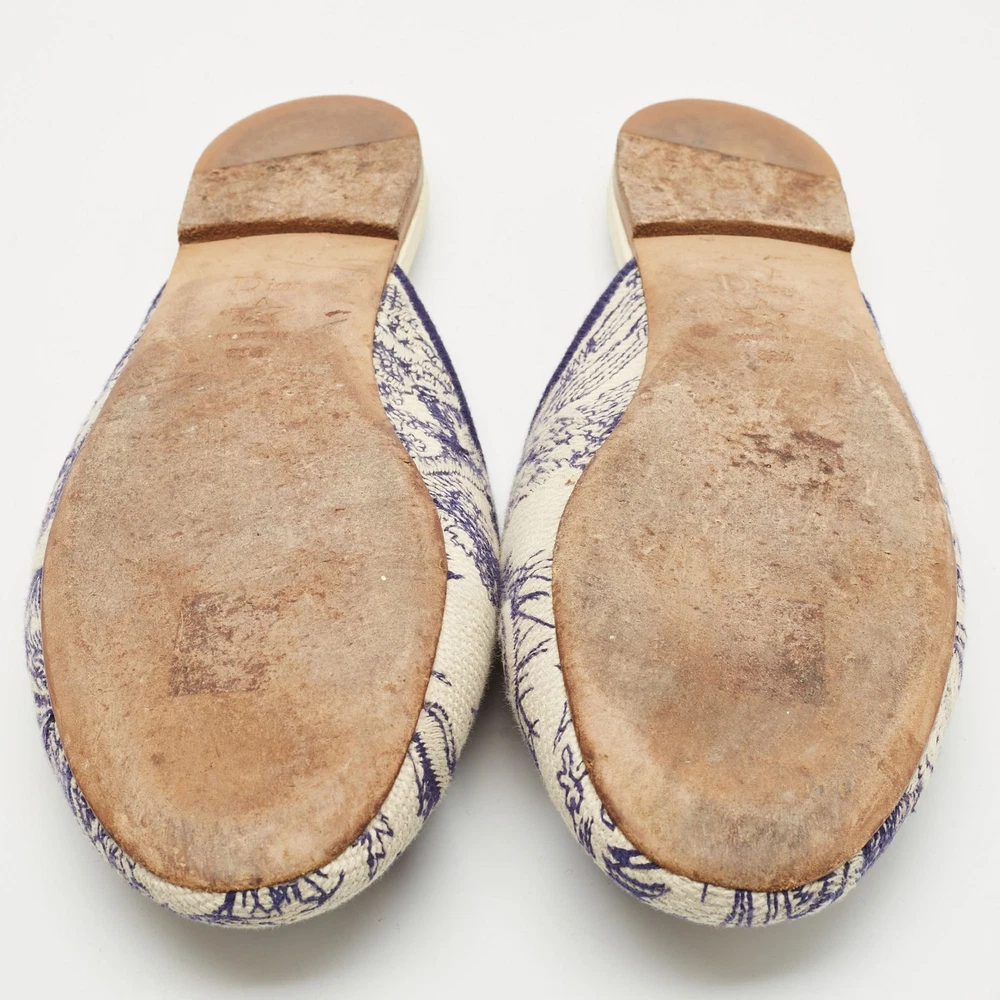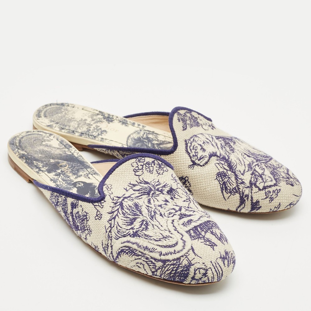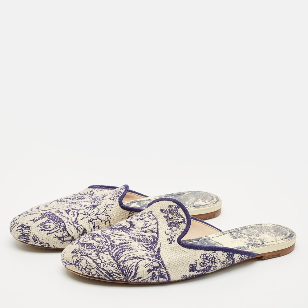 Step into timeless elegance with these Dior flat mules, featuring the house’s iconic Toile de Jouy motif in a refined blue and beige palette. Crafted from finely embroidered canvas, they blend heritage artistry with contemporary comfort. The slip on silhouette make them an effortless choice for sophisticated off duty styling or luxe resort wear.Certified by The Luxury Closet - This item has gone through a detailed authentication process overseen by our experts. We offer a lifetime guarantee of authenticity on all our items. Import duties, taxes and charges are not included in the item price. These charges are the buyers responsibility. Please check with your country’s customs office to determine what these additional cost will be prior to buying. Our eBay Store About Us Contact Us Add to Favorite Sellers Dior Blue/Beige Embroidered Canvas Toile De Jouy Flat Mules Size 39.5 $344.3 Step into timeless elegance with these Dior flat mules, featuring the house’s iconic Toile de Jouy motif in a refined blue and beige palette. Crafted from finely embroidered canvas, they blend heritage artistry with contemporary comfort. The slip on silhouette make them an effortless choice for sophisticated off duty styling or luxe resort wear. Product Details Brand Color Blue Dimensions Material Canvas Size 39.5 Outsole Width Outsole Length Heel Height Includes Certified by The Luxury Closet This item has gone through a detailed authentication process overseen by our experts. We offer a lifetime guarantee of authenticity on all our items. How We Check The in-house team of experts at The Luxury Closet is highly trained to verify the authenticity and the condition of the luxury products. They ensure that only 100% authentic items are put on sale.The evaluation process is unique with its own mix of assessment criteria and differs according to the category. Each item is evaluated based on the following combination of hallmarks, hardware, stitching, symmetry, material, craftsmanship, stamping, codes, hologram stickers, and packaging. Our authenticators also check if the items have been modified or amended (e.g., aftermarket diamonds, replaced batteries, repaired bags, etc.) International Buyers Import duties, taxes and charges are not included in the item price. These charges are the buyers responsibility. Please check with your country’s customs office to determine what these additional cost will be prior to buying.