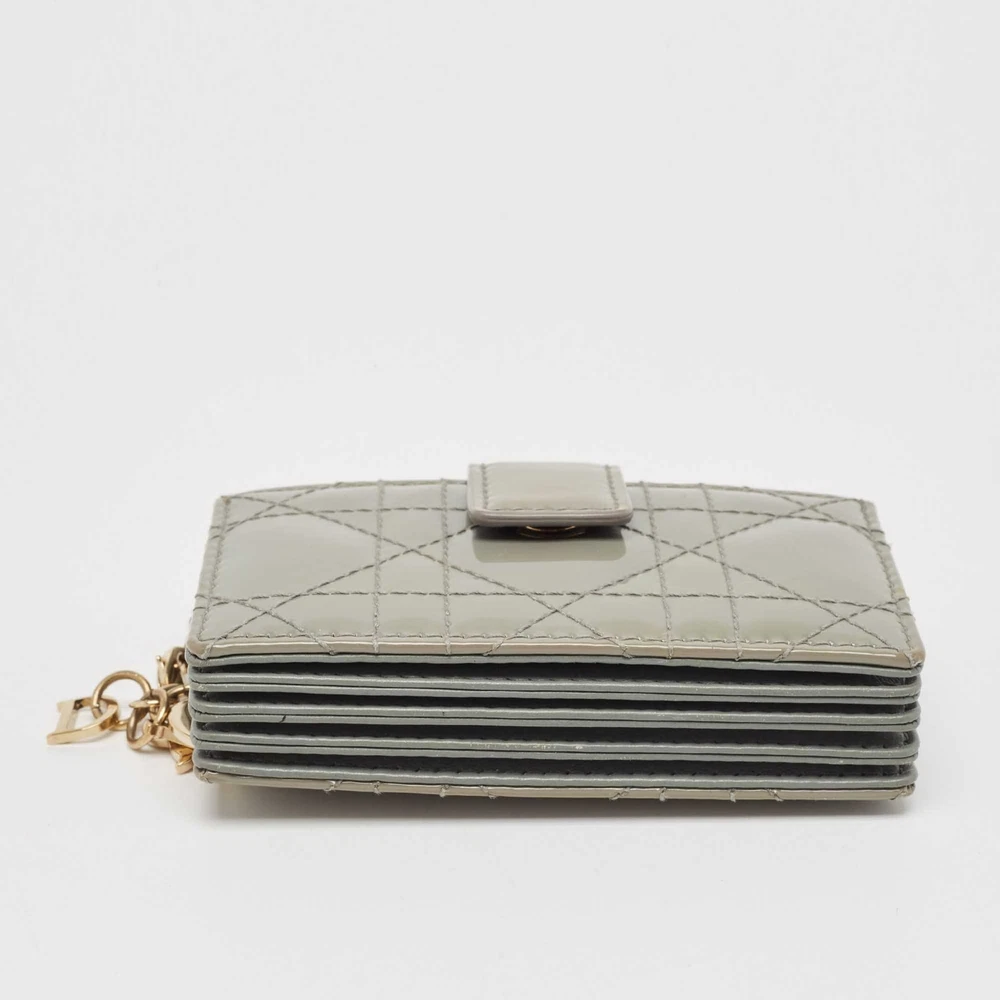 Crafted from patent leather, this Dior gusset card holder opens to reveal multiple compartments to carry your cards neatly. It also features the brands iconic quilt on the exterior. This grey piece is finished with gold tone hardware and DIOR charms.Certified by The Luxury Closet - This item has gone through a detailed authentication process overseen by our experts. We offer a lifetime guarantee of authenticity on all our items. Import duties, taxes and charges are not included in the item price. These charges are the buyers responsibility. Please check with your country’s customs office to determine what these additional cost will be prior to buying. Our eBay Store About Us Contact Us Add to Favorite Sellers Dior Grey Cannage Patent Leather Lady Dior 5 Gusset Card Holder $242 Crafted from patent leather, this Dior gusset card holder opens to reveal multiple compartments to carry your cards neatly. It also features the brands iconic quilt on the exterior. This grey piece is finished with gold tone hardware and DIOR charms. Product Details Brand Color Grey Dimensions Height: 6 cm, Width: 2 cm, Length: 10.5 cm Material Leather, Patent Leather Size Outsole Width Outsole Length Heel Height Includes Original Dustbag, Original Box Certified by The Luxury Closet This item has gone through a detailed authentication process overseen by our experts. We offer a lifetime guarantee of authenticity on all our items. How We Check The in-house team of experts at The Luxury Closet is highly trained to verify the authenticity and the condition of the luxury products. They ensure that only 100% authentic items are put on sale.The evaluation process is unique with its own mix of assessment criteria and differs according to the category. Each item is evaluated based on the following combination of hallmarks, hardware, stitching, symmetry, material, craftsmanship, stamping, codes, hologram stickers, and packaging. Our authenticators also check if the items have been modified or amended (e.g., aftermarket diamonds, replaced batteries, repaired bags, etc.) International Buyers Import duties, taxes and charges are not included in the item price. These charges are the buyers responsibility. Please check with your country’s customs office to determine what these additional cost will be prior to buying.