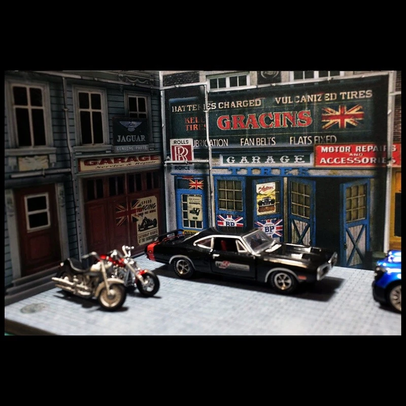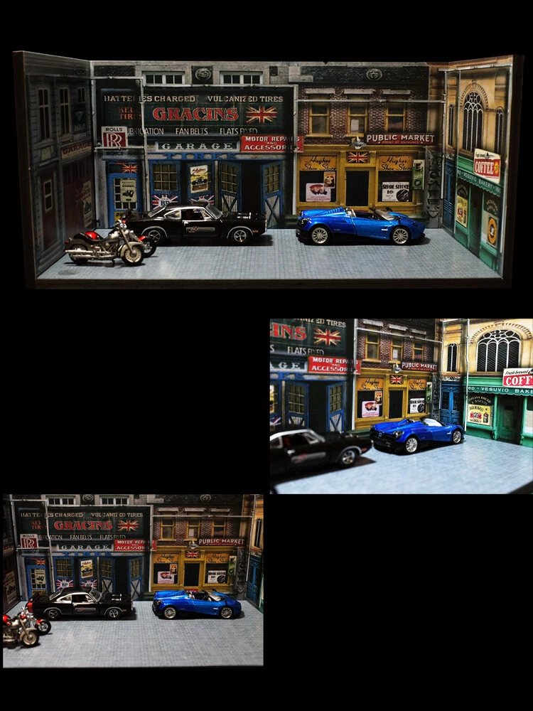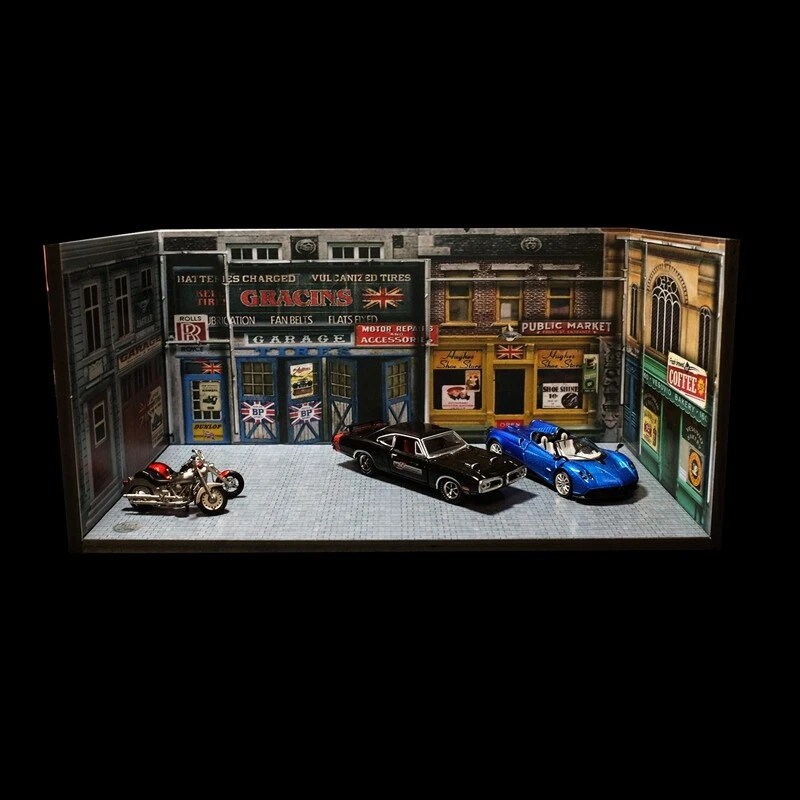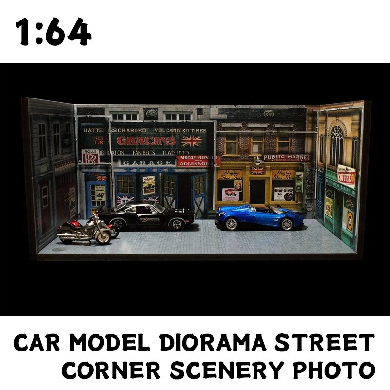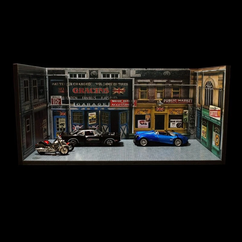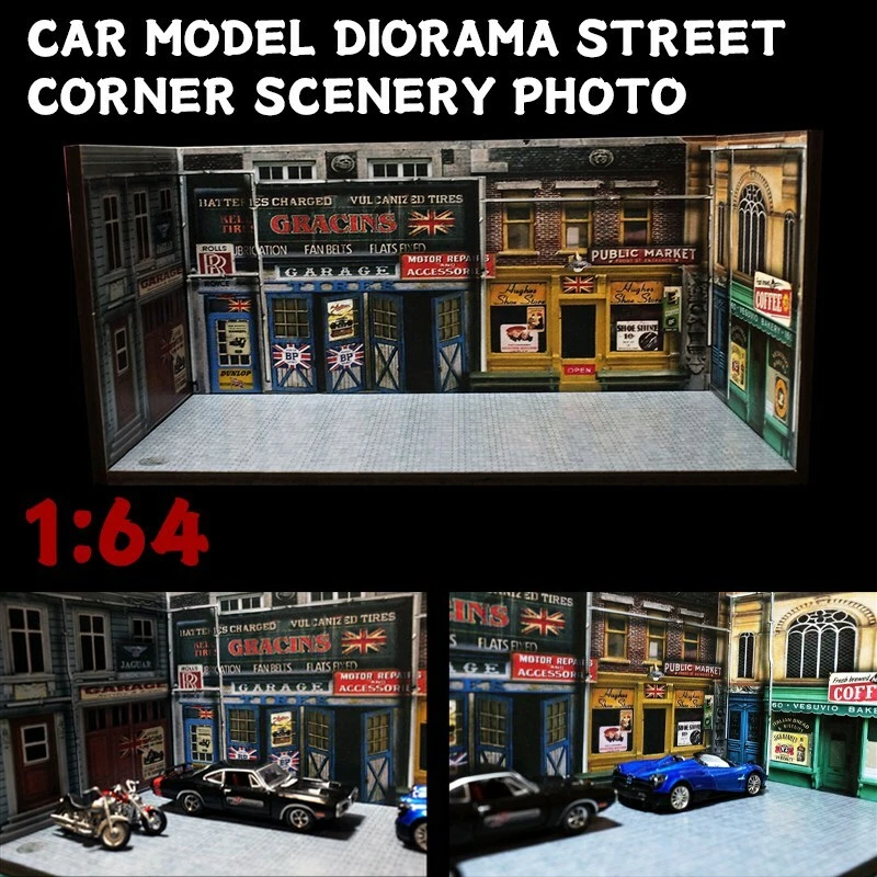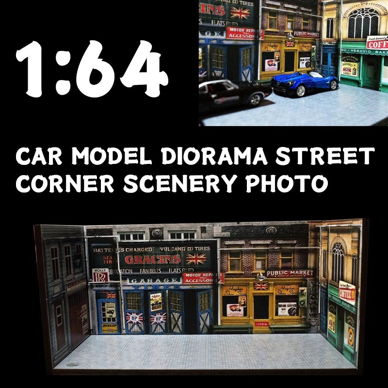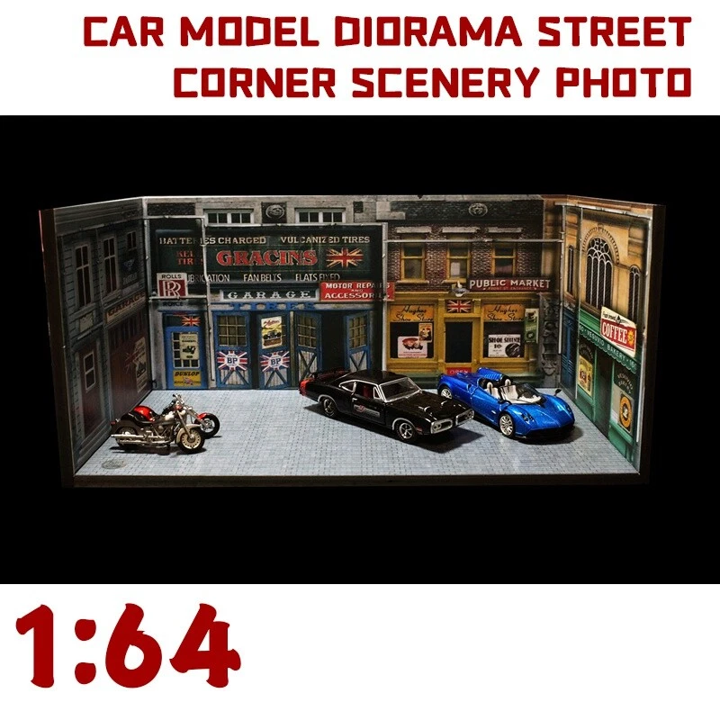 Description: 1:64 Car Model Diorama Street Corner Scenery Photo Background Parking Lot Display Scenery Model Status: In Stock Scale: 1:64 Material: PVC Model Size: L 210mm x W 110mm x H 100mm (8.3"x4.3"x3.9"inches) Packing: 1 x Floor + 3pcs x Wall Noted: Product does not including car mode and figures