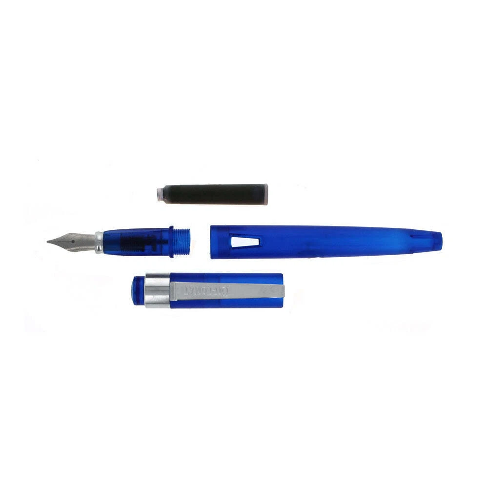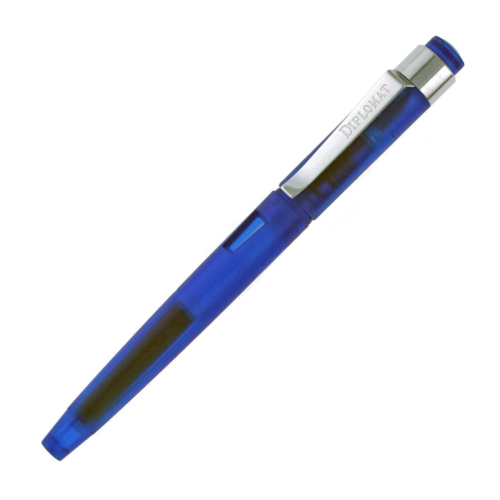 Diplomat Magnum Fountain Pen, Demo (Translucent) Blue Diplomat Magnum fountain pen with special no-slip resin finish that gives the pen a soft touch. Contoured ergonomic grip zone makes the Magnum comfortable to hold and helps keep the pen at the correct writing angle for right- or left-handed writers. Stainless steel nib made for Diplomat by JoWo of Germany. Snap-on cap. Made in Germany. Length Capped: 5.25" (134 mm); Length Uncapped: 4.95" (126 mm); Length Posted: 6.0" (152 mm); Barrel Diameter (Maximum): 0.47" (12 mm); Weight: 0.5 oz. (15 g) Contoured ergonomic grip zone Special no-slip resin body Ink view window Plastic casing Matte chrome fittings Sturdy metal clip Stainless steel nib made by JoWo Utilizes standard international ink cartridge Accepts optional converter for bottled ink (Rosetta Explorer converter) Gift boxed Made in Germany