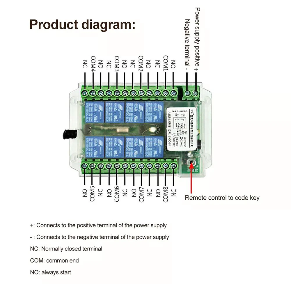 You may also like 2Pcs Replacement Full Range Speaker for JBL Charge 3 4ohm 10W Bluetooth Speaker 17.99 USD 20x Soft Golf Shoe Spikes Replacement Cleat Fast Twist Q-Lok For Footjoy Champ 12.99 USD 36X Phone Camera Telephoto Lens Zoom Fisheye Wide Angle Lens For iPhone 25.99 USD Metal 1/4" Boat Jack Plate for Fender Stratocaster Strat Style Guitar Parts b 9.89 USD For Insta360 X3 Camera Accessories Aluminum Alloy Protective Cage Housing Frame 58.99 USD Rivet Marking Tool& Handle Model Building For Galaxy Tools Accessories Part 22.99 USD SAFE & SECURE SHOPPING 100% SATISFACTION GUARANTEED FAST SHIPPING Direct wiring 8 Channel Wireless RF433MHz Remote Control Switch Relay Module Product Description Features: 1. Compact Product, With Working Indicator Light 2. Simple Operation, Wiring Without Disassembling The Shell Direct Wiring 3. Wide Voltage Power Supply, Safe And Reliable, Stable Performance, Low Power Consumption 4. Loss Of Remote Control, Can Clear The Information Stored In The Acceptance Of The Controller 5. Wide Range Of Use: Applied To Electric Doors, Windows, Lifting Equipment, Gates, Elevators And Other Fields Specifications: Working Voltage: DC8-86V Operating Temperature: -10℃-+55℃ Coding Mode: Learning Type Controller Size: 120mm* 90mm* 35mm Remote Control Battery: 2* AAA Battery(Not Included) Operating Frequency: 433mhz Maximum Current: 10A Remote Control Distance: 100m-200m Working Mode: Mode 1: Tap Mode 2: Self-Locking Mode 3: Interlock Mode 4: 1. 2. 3. 4-Way Tap 5. 6. 7. 8 Self-Locking Mode 5: 1. 2-Way Tap, 3. 4-Way Self-Locking, 5. 6-Way Interlocking, 7.8-Way Interlocking Mode 6: Tap + Total Open Mode 7: Self-Locking + ALL ON ALL OFF Explanation Of Mode Output: Self-Locking: Press The Same Remote Control Button, Press It Once, The Relay Will Absorb, Press It Again, The Relay Will Turn Off. Interlocking: Press The Remote Control 1 Key, One - Way Relay Will Be Engaged (The Other Way Will Be Closed), Press The Remote Control 2 Key, Two - Way Relay Will Be Engaged (The Other Way Will Be Closed). Tap: Press The Remote Control "1" Key, The Relay Will Absorb, Release The Remote Control "1" Key, The Relay Will Turn Off. If You Keep Pressing The Remote Control "1" Key, The Relay Is Always Active, When To Let Go Of The Remote Control, When The Relay Is Off. +: Connect To The Positive Terminal Of The Power Supply -: Connect To The Negative Pole Of Power Supply Nc: Normally Closed Terminal Com: Common Terminal No: Normally Open Terminal Learning Code: 1. Mode 1 (Pointing) Learning Method: Press The Control Panel Code Button Once, Wait For The Led Indicator To Light Up And Then Press Any Key Of The Remote Control That Needs To Be Coded, And The Led Indicator Of The Control Panel Will Blink 3 Times In A Row For The Code To Be Successfully Coded. 2. Mode 2 (Self-Locking) Learning Method: Continuously Press The Control Board 2 Times To The Code Button, Wait For The Led Indicator Is Lit, Press Any Key Of The Remote Control That Needs To Be Coded, The Control Board Led Indicator Blinks 3 Times In A Row To The Code Successfully. 3. Mode 3 (Interlock) Learning Method: Continuously Press The Control Board 3 Times To The Code Button, Wait For The Led Indicator Is Lit, Press Any Key Of The Remote Control That Needs To Be Coded, The Control Board Led Indicator Blinks 3 Times In A Row To The Code Successfully. 4. Mode 4 (Point + Self-Locking) Learning Method: Continuously Press The Control Board 4 Times The Code Button, Wait For The Led Indicator Light Up And Then Press Any Key Of The Remote Control Need To Code, The Control Board Led Indicator Flashes 3 Times To Code Successfully. 5. Mode 5 (Tap + Self-Locking + Interlocking) Learning Method: Continuously Press The Control Board 5 Times The Code Button, Wait For The Led Indicator Light Up And Then Press Any Key Of The Remote Control That Needs To Be Coded, The Control Board Led Indicator Flashes 3 Times In A Row To The Code Successfully. 6. Mode 6 (Tap+Total) Learning Method: Press The Control Panel Code Button 11 Times In A Row, Wait For The Led Indicator To Light Up And Then Press Any Key Of The Remote Control That Needs To Be Coded, The Led Indicator Of The Control Panel Will Flash 3 Times In A Row And The Code Will Be Successfully Coded. 7. Mode 7 (Self-Locking + ALL ON ALL OFF) Learning Method: Continuously Press The Control Board 12 Times To Code Button, And So On The Led Indicator Light, Light, Press Any Key Of The Remote Control That Needs To Code, The Control Board Led Indicator Blinks 3 Times In A Row To Code Successfully. Clear Data Press The Learning Button On The Control Board For 11 Consecutive Times, It Will Automatically Clear All The Remote Controls That Have Learned The Code. After Clearing, The Original Remote Control Will No Longer Be Controlled. Packege Included: 1* Relay Module 1* Remote Control About Us Payment Shipping Returns Contact Us About Us Welcome to our store! Our aim is to offer our clients items with high quality and fast delivery, also our price will be reasonable. We supply many products including video game, health & beauty, phone accessories, computers accessories, camera & camcorder,car accessories, games, toys & hobbies, jewelry, antique & craftwork. Excellent customer service and a reliable credit standing is our tenet. Payment We accept all verified payments from ebay. Orders will be shipped after receiving cleared payment. Payment due within 7 days after auction ends and for buy it now listings. Shipping We ship most of our orders within 24 hours, and may up to 48 hours. If you want faster shipping way. Please contact us before making payment. Sometimes due to problems with our transportation company system, your shipping information may be delayed to update. We recommend that you try again after 3-4 days. If you still haven't checked the shipping information, you can contact us by ebay message. Returns Always believe we can figure things out with communication, if it comes to return, the pacakge mus