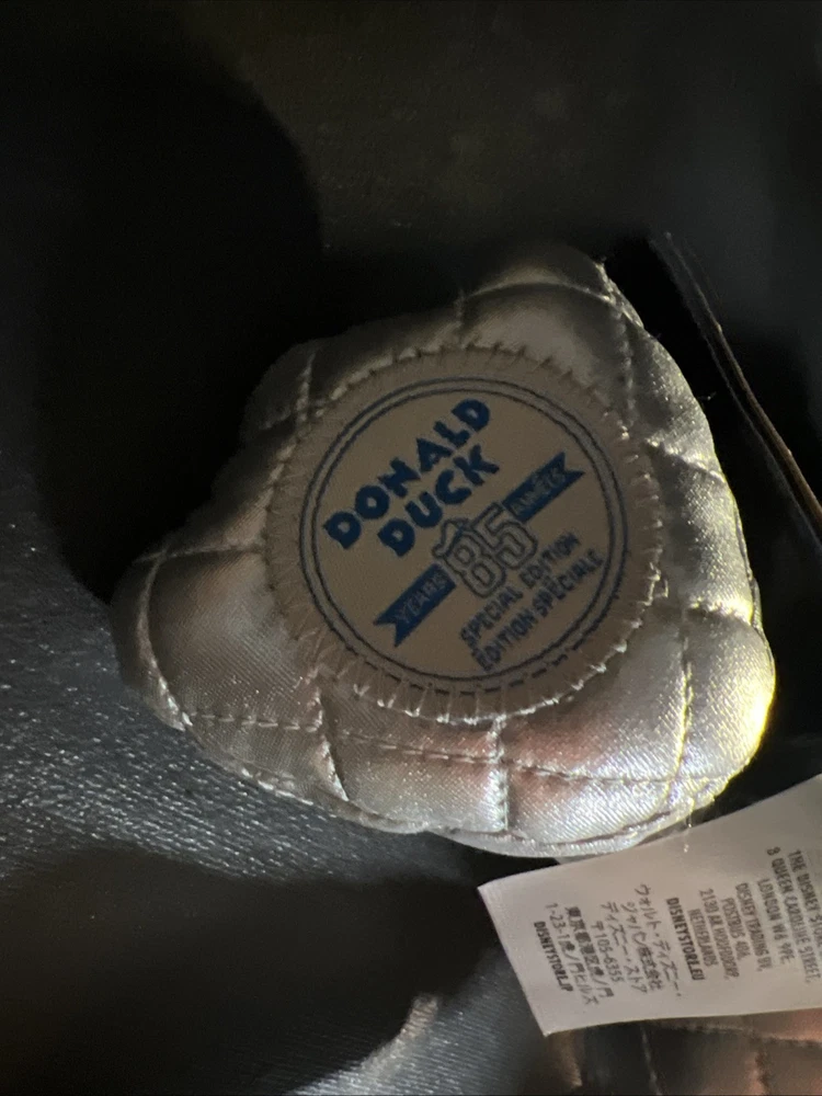 Celebrate a classic with the Disney Donald Duck 85th Anniversary Metallic 15" Plush, a special edition collectible that shines in any Disneyana collection. This plush toy, adorned with shimmering metallic accents, honors the beloved character's enduring legacy and adds a touch of sparkle to your display. Crafted with care and attention to detail, this plush is a testament to the enduring charm of Donald Duck. Perfect for fans and collectors alike, it's a delightful nod to the whimsical world of Disney, ready to take its place as a treasured keepsake in your home or office.
