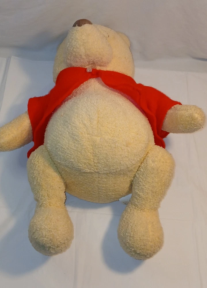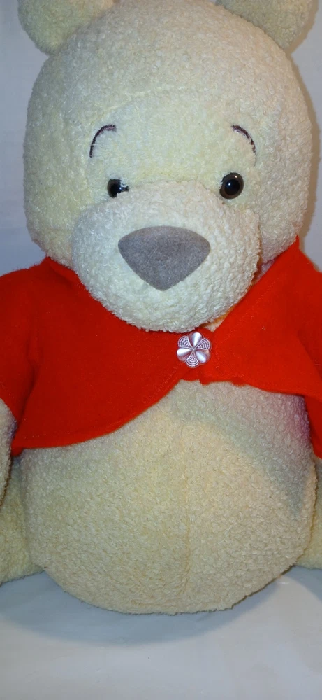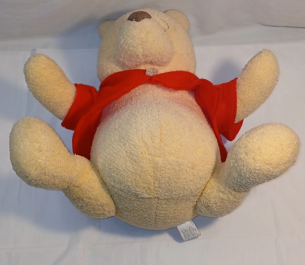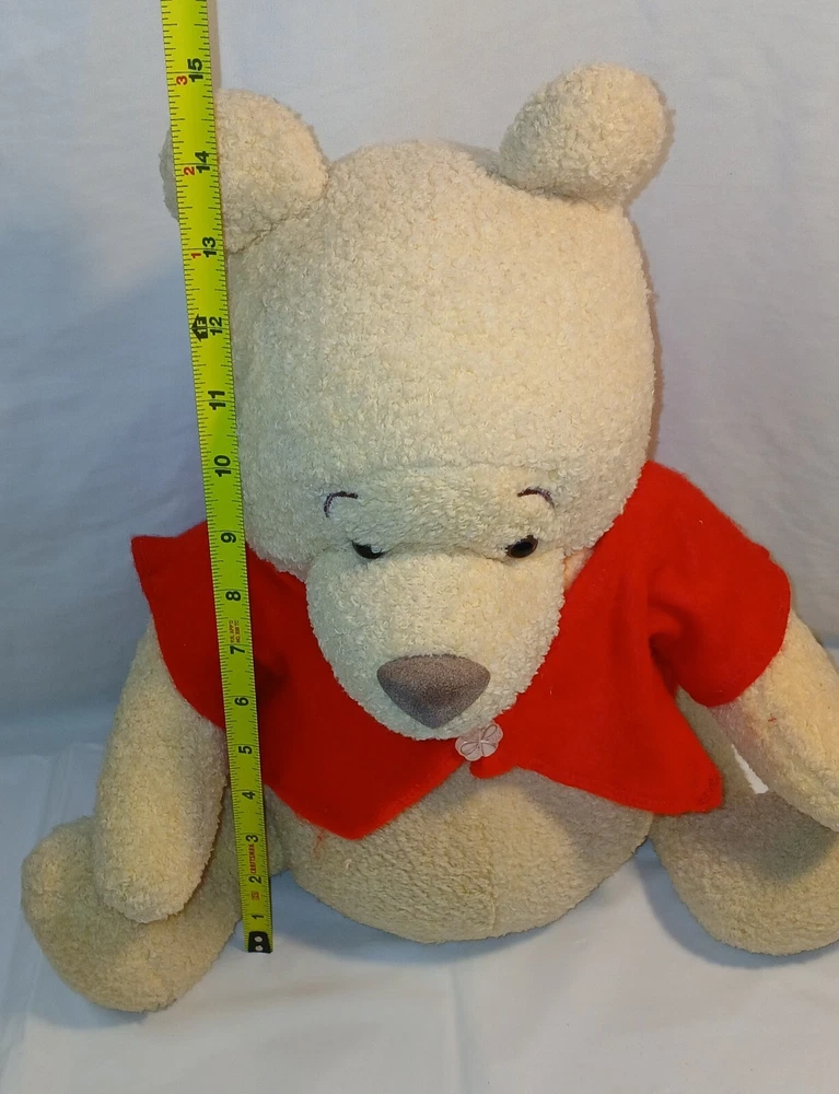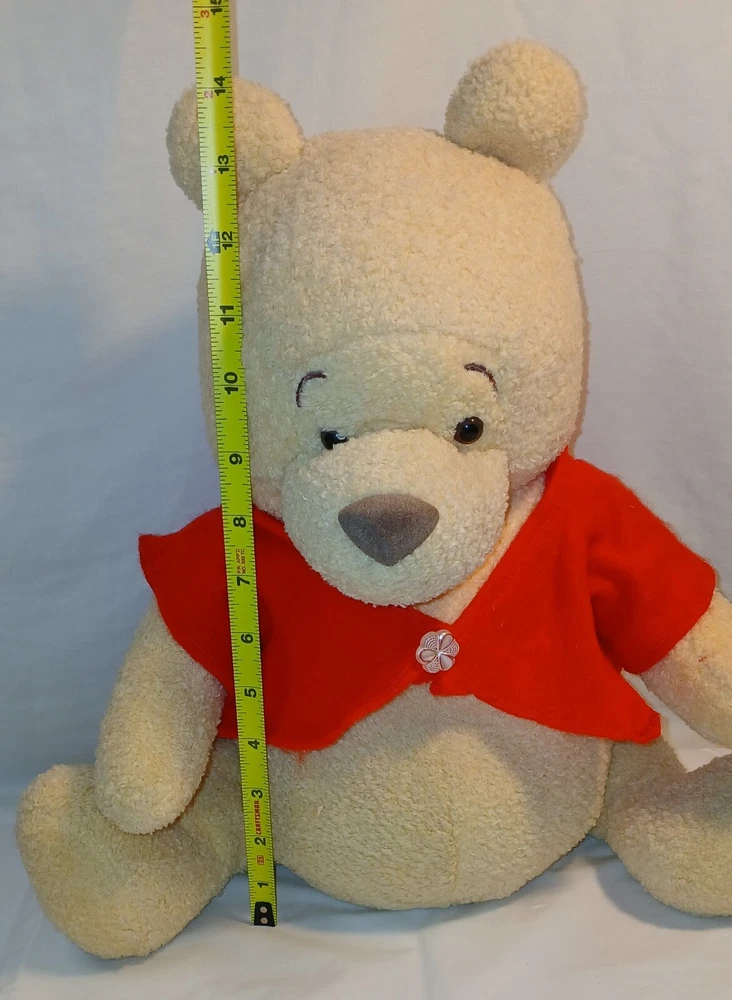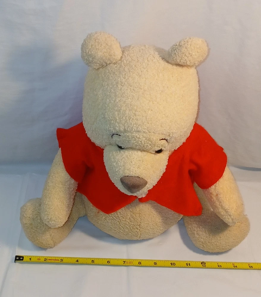 You receive the exact item shown. Please see the pictures as they depict multiple angles and close ups. Tape measure is shown for size reference. Plush Winnie The Pooh has no damages, holes, or rips that I could find. He is clean and from a smoke-free environment. You should still wash and clean it to your own personal standards. Ships to you by the next business day.