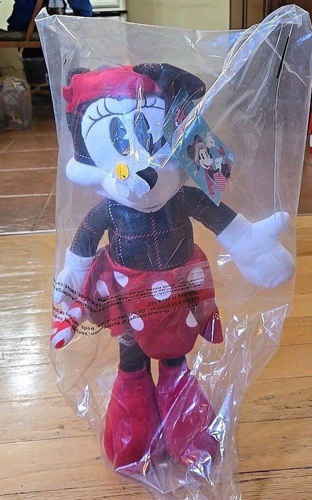 Celebrate the holiday season with the charming Disney Gemmy 11.5" Minnie Mouse Dancing and Singing Plush. This festive plush toy brings joy to any room with its delightful dancing moves and cheerful singing, sure to be a hit at your holiday gatherings. Featuring the classic Minnie Mouse design in vibrant, multicolor attire, she is crafted from a mix of fabric and plastic, making her a durable and colorful addition to your festive decor. Disney fans of all ages will appreciate the magic of this special holiday collectible. With no personalization or handmade touches, the focus is on Minnie Mouse's lively performance. Perfect for creating memorable Christmas moments, this Gemmy plush is not just a toy but a cherished piece of holiday nostalgia that will brighten up your celebrations.