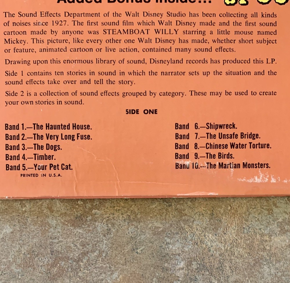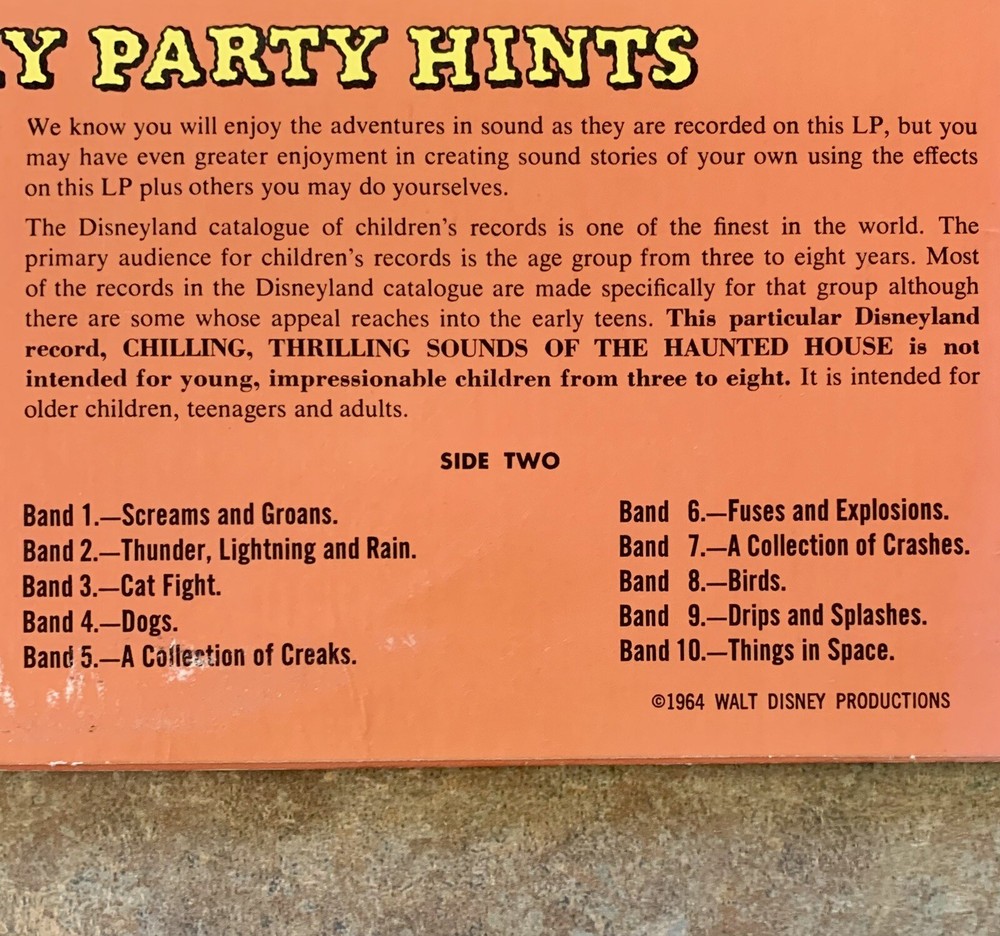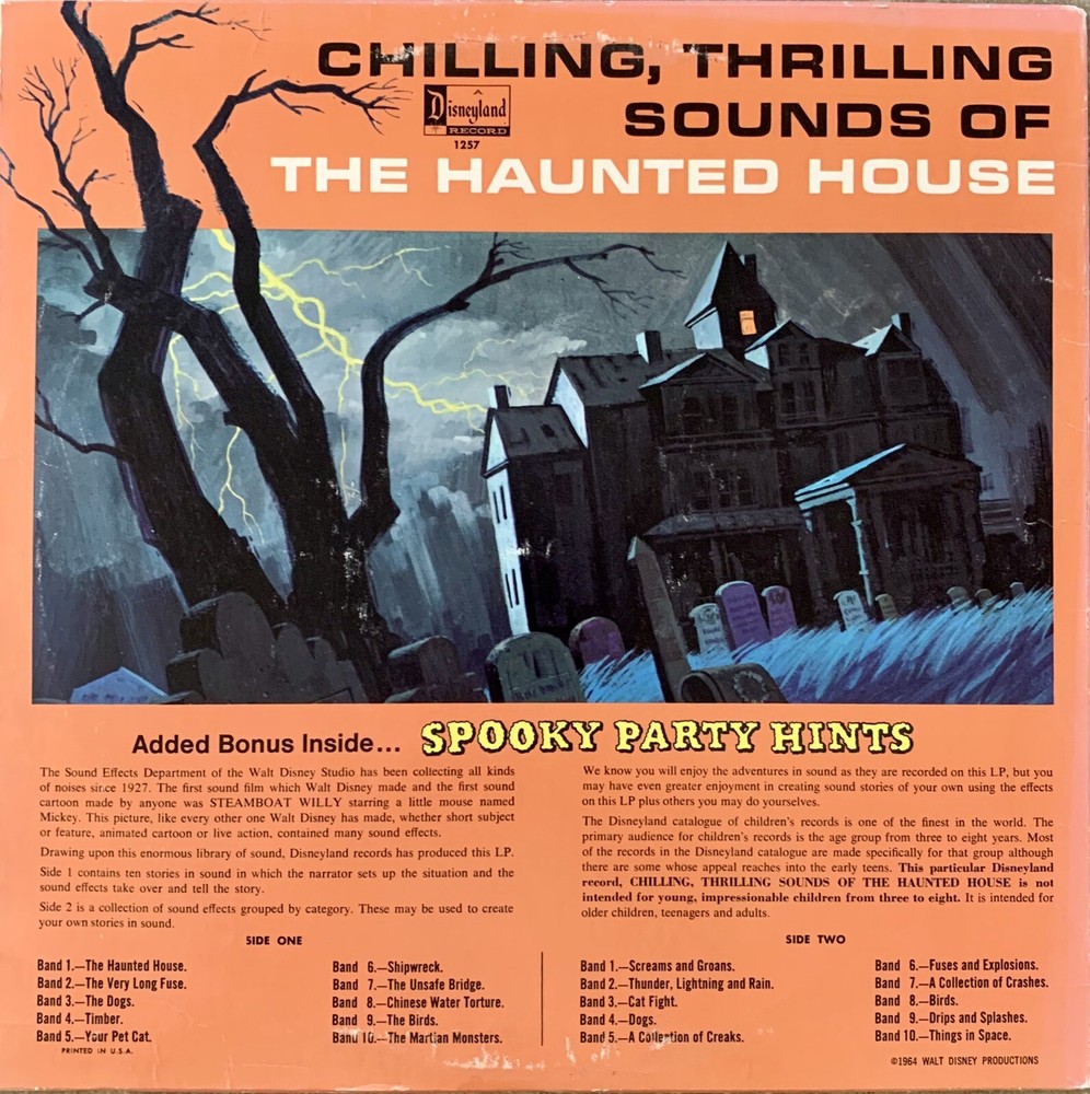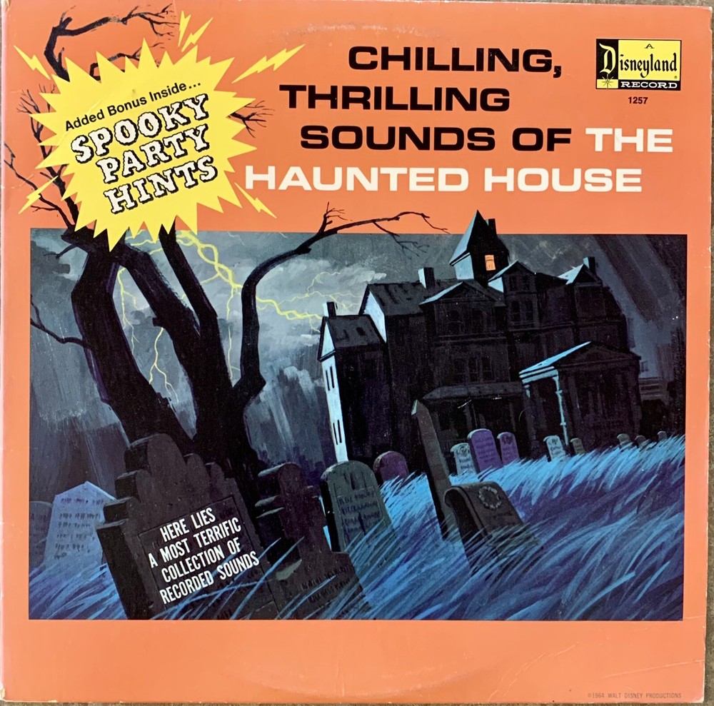 Disney - Chilling Thrilling Sounds Of The Haunted House Vinyl Record LP Cover has some slight wear on the corners and edges. Record is in excellent shape. Includes original “Spooky Party Hints” sleeve.