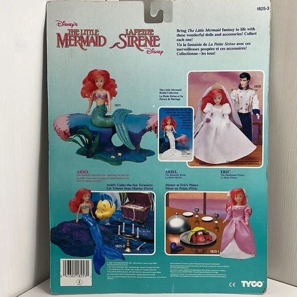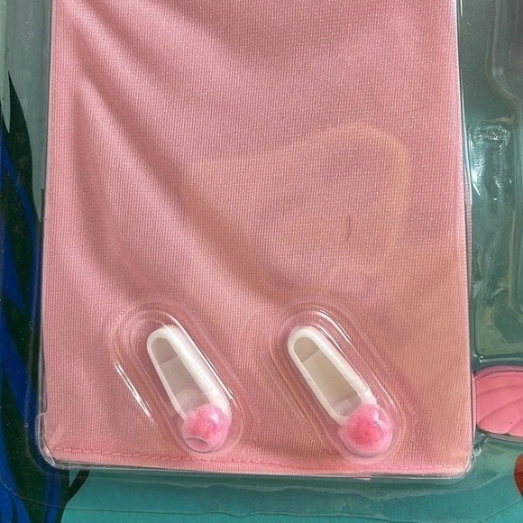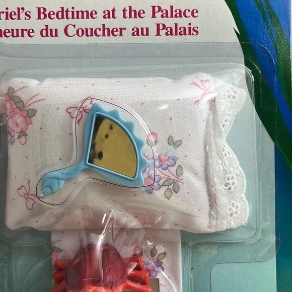 For your consideration is a new old stock Disney's The Little Mermaid "Ariel's Bedtime at the Palace" Accessory Set. Date 1991 This set is so adorable! Features pink nightgown with white color. White plastic slipper flat shoes with a pink ball. You also get a floral pillow and a sheet folded under the pillow. There's a little hand mirror, pink comb and a Sebastian pvc figure. This is by Tyco and marked on the bottom "The Walt Disney Company." The packaging is in nice condition. Crease near the top. Comes from a smoke free home. I use calculated shipping and don't add a handling fee, so buyers only pay the actual shipping costs I incur. This approach helps keep expenses low for the buyer.