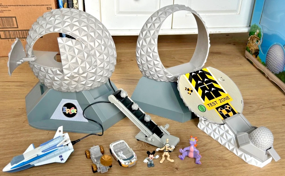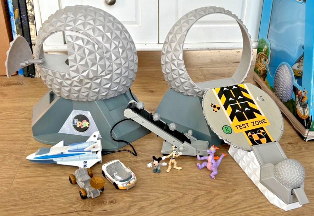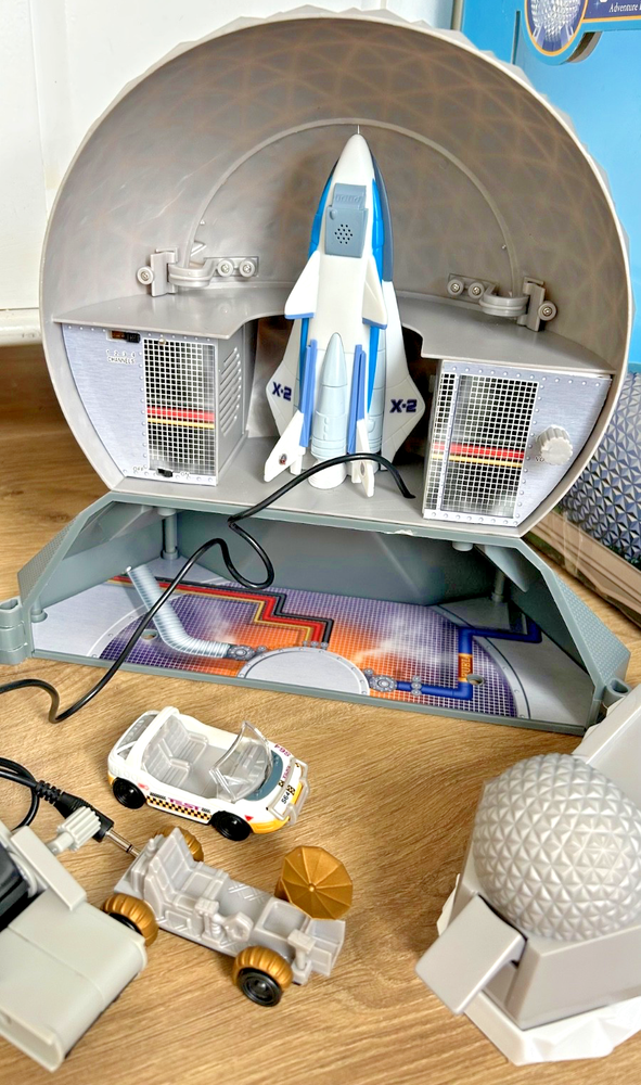 Disney Monorail Spaceship Earth Epcot Adventure Park Playset Disneyland & Walt Disney World Exclusive Sphere RARE This is the Disneyland & Disney World Monorail Epcot play set, complete with figures. The microphone did not work when I inserted the batteries and the rubber band in the car launcher has dried out and will need to be replaced. The back window of the test car has 2 cracks on the frame, but the pieces are firmly attached and are in good order. I believe that the play set is complete and very hard to find. The box is include, which is in good condition. The box has some wear and tears from age. If you would like to omit the box, it will most likely save with the shipping cost. Please contact me with any questions or concerns, thank you!