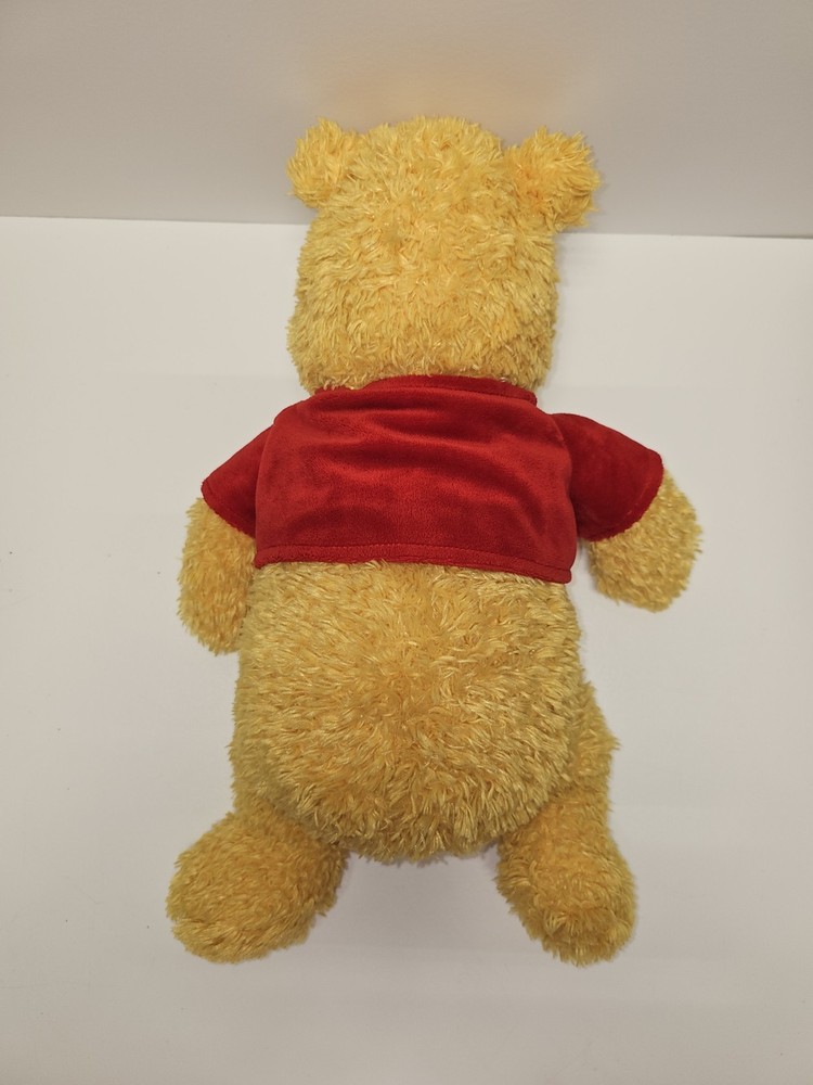 This adorable 14-inch Winnie the Pooh plush is an official Disney Parks collectible, sold at Disneyland and Walt Disney World. Pooh features soft, fuzzy golden fur, a red velvety "Pooh" shirt, and classic embroidered facial details. Brand: Disney Theme Park Merchandise Character: Winnie the Pooh Height: Approx. 14 inches Material: Polyester Fiber & Polyurethane Foam Tag Info: Marked with Disney Parks, Disneyland/Walt Disney World label Color: Yellow with red shirt Condition: Pre-owned in very good condition. There are a few light scuffs on the plastic nose (see close-up photo), but the plush is clean with no holes or stains. Original tag still attached.