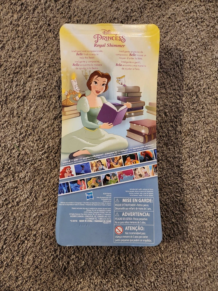 Bring a little magic into your home with the Disney Princess Royal Shimmer Belle Doll. Inspired by the cherished tale of Beauty and the Beast, this 10 1/2 inch doll captures the enchanting spirit of Princess Belle. She comes dressed in her signature gown, complete with the intricate details and colors that fans will instantly recognize. Her long, wavy brown hair frames her gentle face, and her green eyes sparkle with the royalty she carries within. This collectible doll, part of the Disney Barbie Dolls product line and the Shimmer Series, is brand new, sealed in its original packaging, and ready to be a part of your collection or a treasured gift for someone special. Crafted with quality plastic, this Belle doll is a testament to the timeless story and the enduring legacy of Disney's fantasy world. Celebrate every occasion with this iconic character, a symbol of love and adventure.