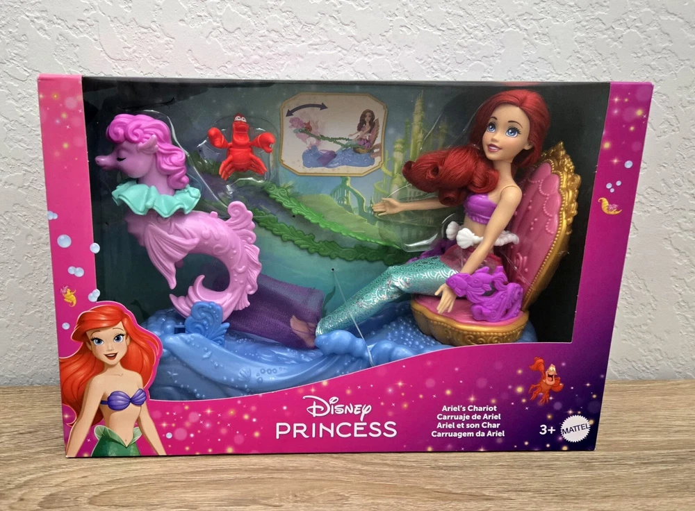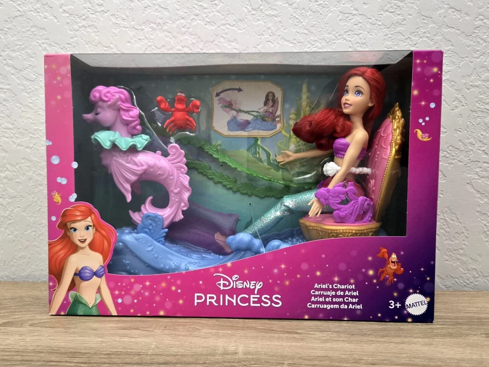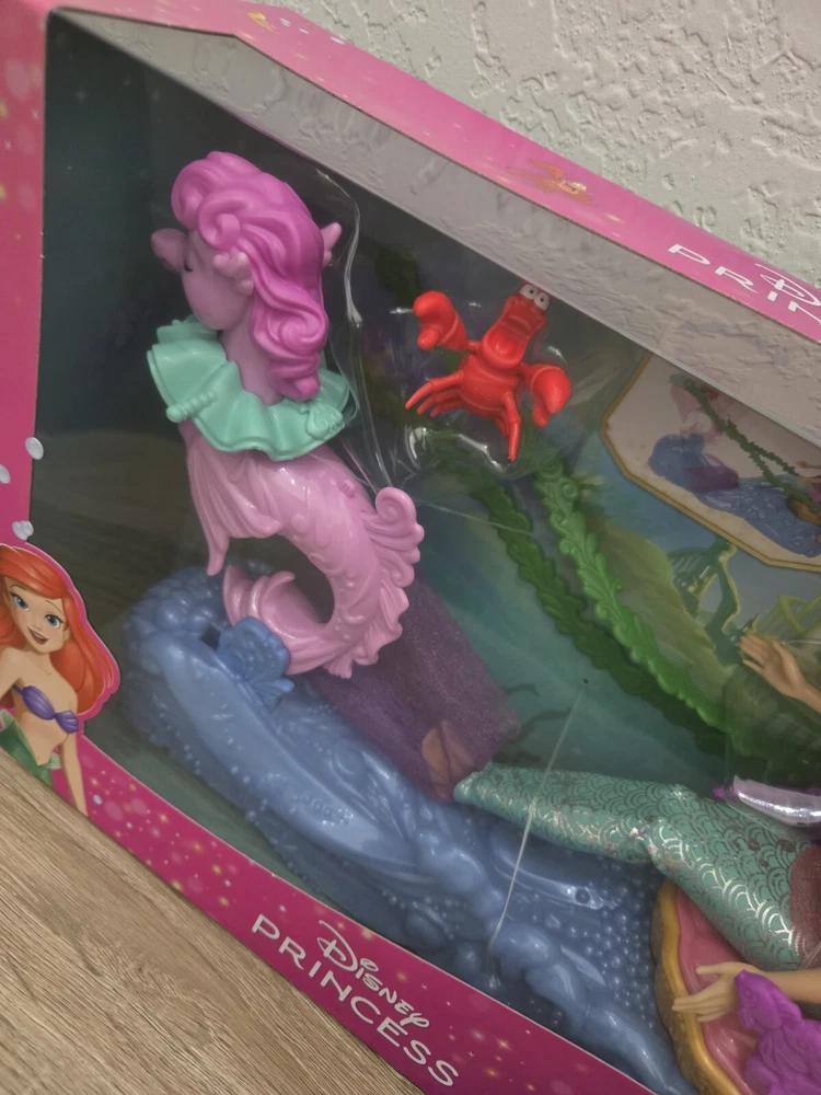 *Free shipping with USPS Ground Advantage. Ships ASAP. Packaged with care. Smoke-free home.* Please note minor imperfections on box as shown in the attached pictures. The playset is not damaged. This Disney Princess Ariel's Chariot playset comes with an Ariel doll and Sebastian character, perfect for all occasions. The doll has wavy red hair, blue eyes, and light complexion. The set includes removable clothes, a back and forth chariot movement, and is packaged in its original unopened box. The playset is part of the Disney Series and is manufactured in China with plastic materials. It is recommended for ages 3+ and is a great addition to any Disney or Little Mermaid collection. This doll playset is perfect for imaginative play and creates a magical underwater world for Ariel and her friends.