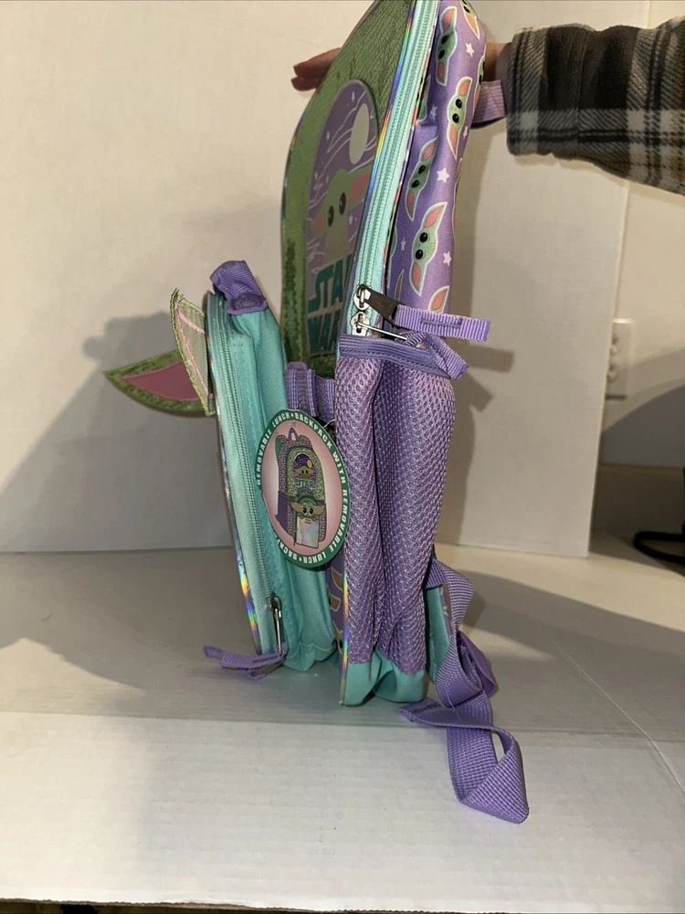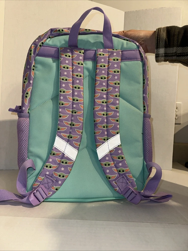 Get your hands on this amazing Disney Star Wars Mandalorian Baby Yoda Backpack With Lunch Bag in Green. The backpack is made of 100% polyester and features a zip closure. It is a large size, measuring 12 inches in width, 18 inches in height, and 4 inches in depth. The backpack is adorned with sequins and has a stars theme, making it perfect for any Star Wars fan. The unisex backpack is perfect for kids, and the backpack is brand new.