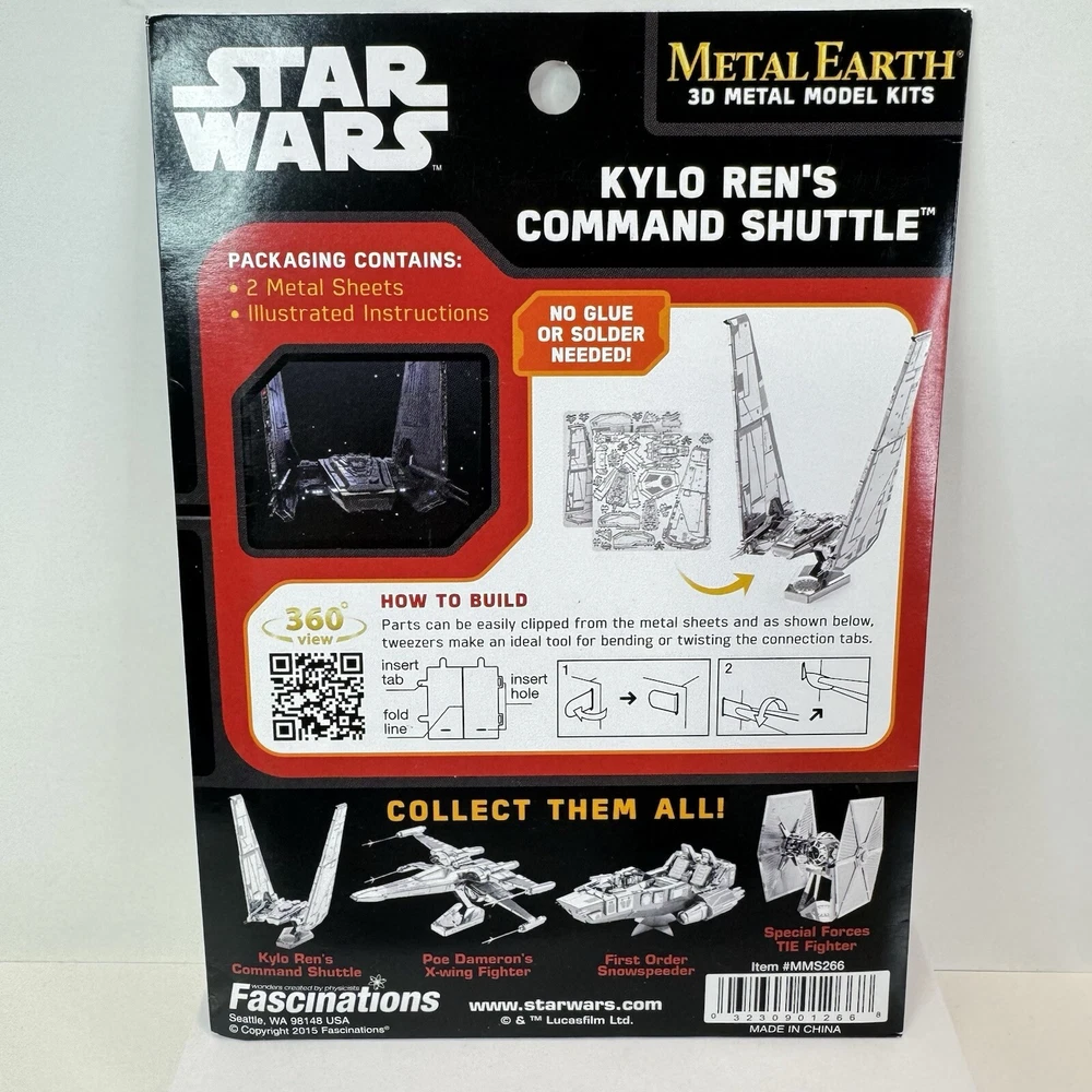 The Disney Star Wars Metal Earth 3D Metal Model Kylo Ren’s Command Shuttle Kit is a toy puzzle that falls under the Theme of Kylo Ren from the Character Family of Star Wars. This 3D puzzle is made of Metal material and is suitable for the Age Level of 12-16 Years. As part of the Metal Earth brand, this kit allows fans to construct a detailed model of Kylo Ren's Command Shuttle, providing a fun and challenging activity for Star Wars enthusiasts.