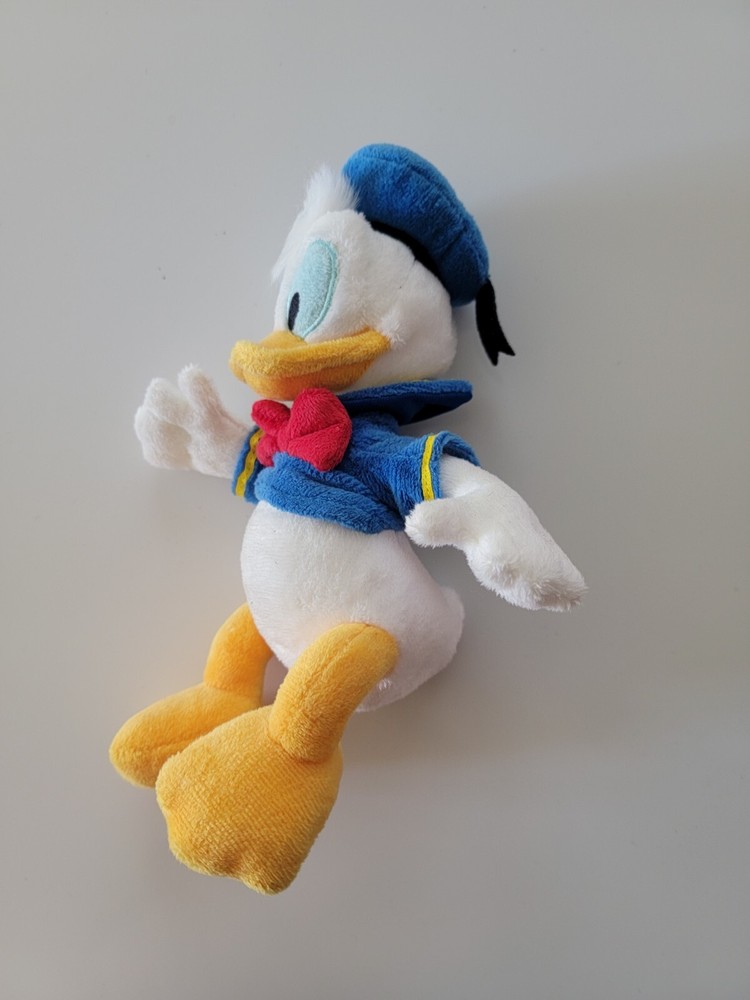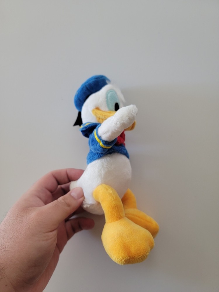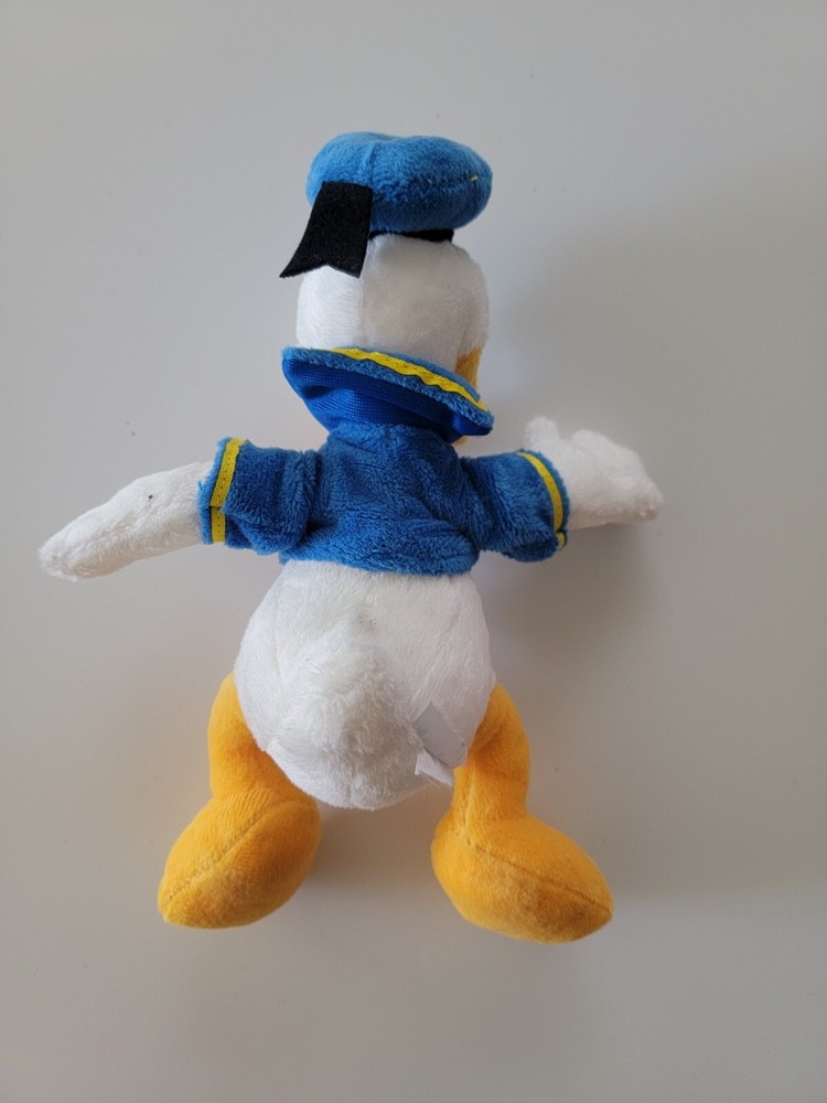 This is a small 9" Donald Duck plush stuffed animal toy from the Disney Store, featuring Donald in a sailor suit. It is part of the Disney franchise and is perfect for collectors of Disneyana and fans of the character. The plush toy is made by Disney and is primarily white in color, making it a cute and cuddly addition to any Disney collection.