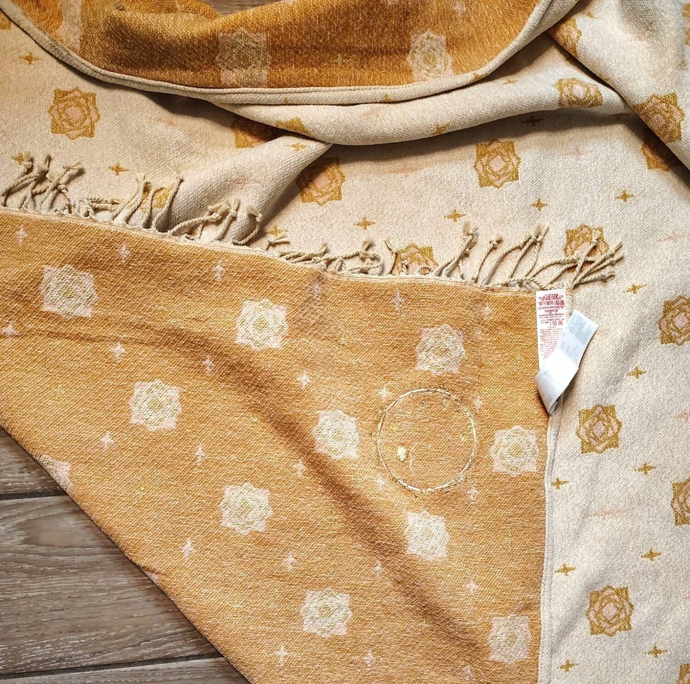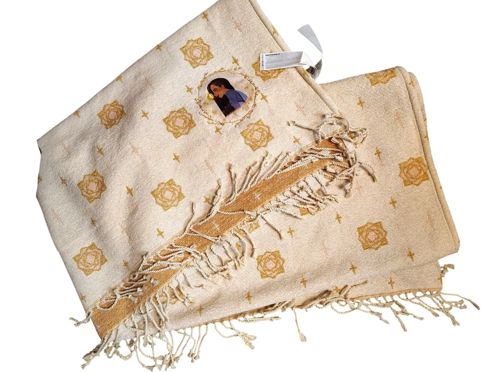 Cozy and enchanting, this gold tone Disney Wish Asha and Star Chenille Throw Blanket adds a touch of magic to any space with its soft texture and elegant fringe design. It measures 50" x 60". No stains or tears; please see all photographs as they are part of the description. Shipped with USPS Ground Mail. J343