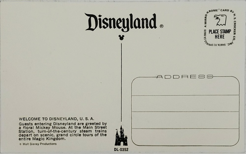 Welcome To Disneyland U.S.A. Postcard UNU UNP Main Street Station Mickey Photo. A Mirro Krome Card By H.S. Crocker Co.