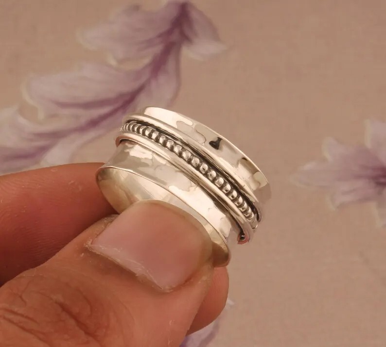 Solid 925 Sterling Silver Handcrafted Distressed Scratches Design Spinner Ring This Handmade Sterling Silver Spinner Ring is a perfect blend of artistry and functionality. Crafted by skilled artisans, each ring features a stunning textured band with unique, distressed scratches that give it a rustic, one-of-a-kind appearance. The spinner mechanism allows the outer band to rotate freely, making this ring a great choice for those seeking a soothing, tactile experience—whether you're wearing it as a worry ring , fidget ring, or simply for its bold, modern aesthetic . Features: Handcrafted with Love : Made from high-quality, solid sterling silver for a durable and timeless piece that will last. Unique Design : The outer band features distressed textures and scratches , giving each ring a distinct, organic feel. No two rings are alike! Spinner Mechanism : The inner band moves smoothly around the outer band, perfect for those who enjoy a calming, tactile sensation. Customizable Fit : Available in a range of sizes to ensure the perfect fit. The ring is made to comfortably slide over your finger, and the spinning feature adds extra fun and function. Versatile Wear : Ideal for daily wear, this ring is a great addition to any jewelry collection. It also makes a thoughtful gift for anyone who enjoys handmade jewelry , unique designs , or needs a soothing, tactile distraction. Perfect For: Those who love artisan-made jewelry with personality A personalized gift for birthdays, anniversaries, or special occasions Fidget or worry rings to help reduce stress and anxiety Anyone seeking a stylish and functional ring with a bit of movement Sizing: Please refer to the size chart to choose your perfect fit. If you're unsure, we recommend ordering half a size larger, as spinner rings tend to fit more snugly than standard bands. Custom sizing requests can be accommodated—please message us with your specific requirements. Care Instructions: To keep your sterling silver ring looking its best: Clean gently with a silver polishing cloth to remove tarnish. Avoid exposure to harsh chemicals or excessive moisture. Store in a jewelry box or pouch to prevent scratches. Shipping & Returns: Free shipping within the U.S. and international shipping available. Fast processing time—your order will be shipped within 1-2 business days. 30-day returns for a full refund or exchange, no questions asked. Note: Due to the handmade nature of this ring, slight variations in texture and appearance may occur, making each piece completely unique. This adds to the charm and individuality of your jewelry!