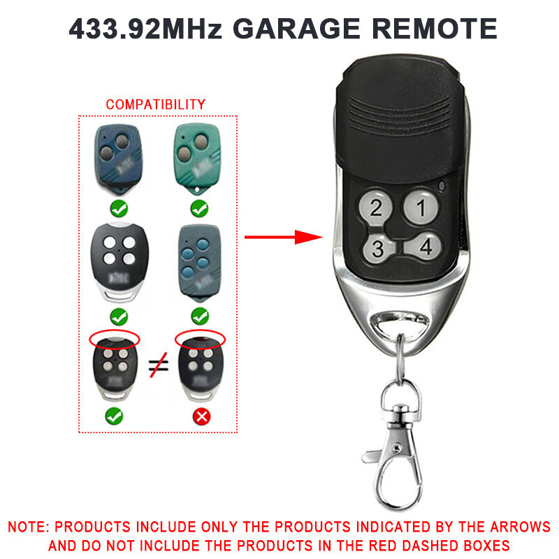 Product Description If you have any questions, please contact customer service first, do not open disputes easily, thank you! NOTE: The product you will receive is the one shown by the arrow, it is a universal remote control, other than that no other items appearing in the picture are included. Description: 1. Type of programming: Programming with the receiver 2. Number of channels: 4 3. Code: rolling code 4. Frequency: 433.92mhz 5. Woring Range: 10-50 m (open space) 6. Power supply: CR2032-3V 7. Remote come with Battery 8. Security of use: dynamic code provides a high level of security, non-copyable code. 9. Your Old remote must be same as the advertisement , new remote do not compatible with other remotes Compatible models: For DITEC GOL4 For DITEC BIXLG4 For DITEC BIXLP2 For DITEC BIXLS2 NOTE : NOT FOR DITEC GOL4C Package Includes: 1* Remote Control Note: 1. Please allow 1-3 mm error due to manual measurement. Please make sure you don't mind before ordering. 2. Please allow 1-3g weight error. Please make sure you don't mind before ordering. 3. Due to the lighting of the photos and the difference of monitors, the pictures may not reflect the actual color of the real item. Please make sure you don't mind before ordering, thank you! About Us We accept all payments authorized by eBay. powered by