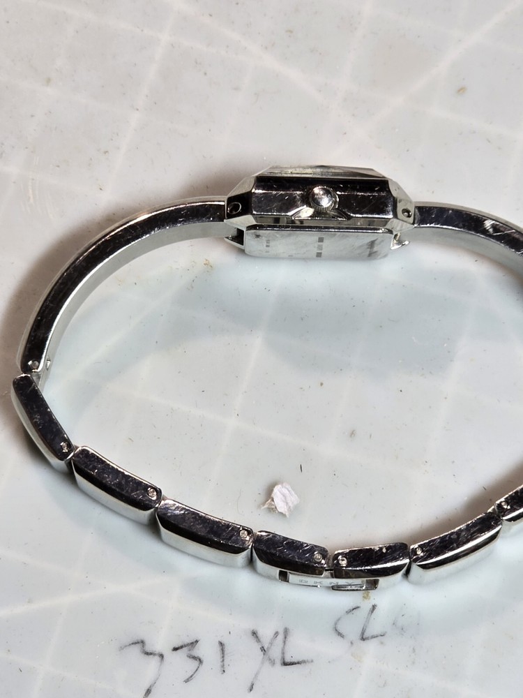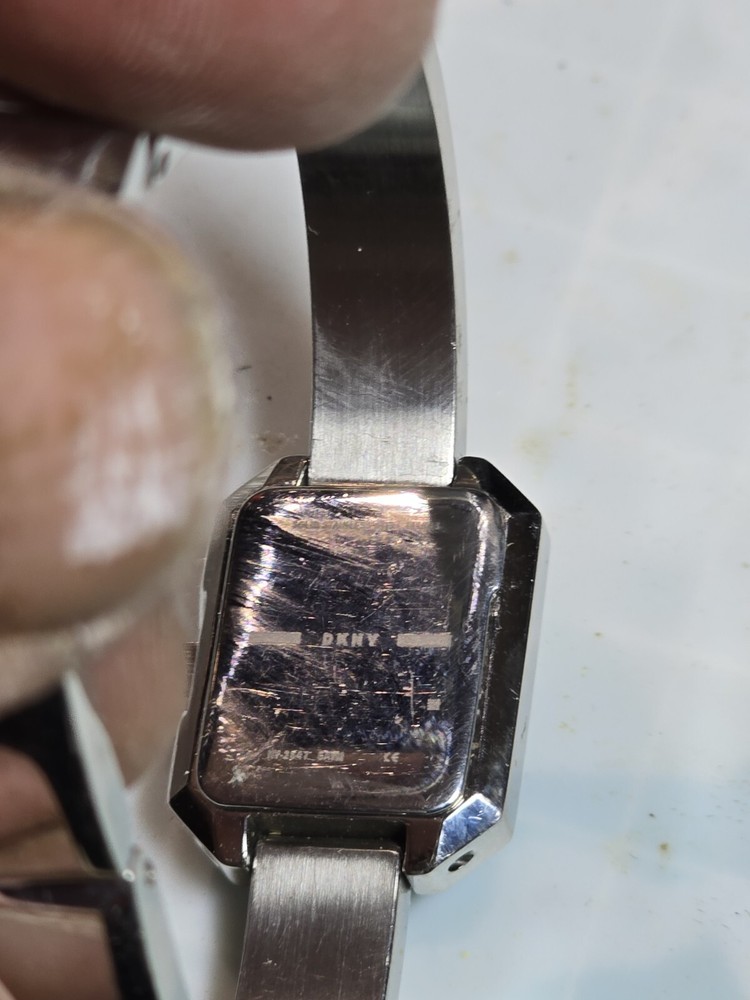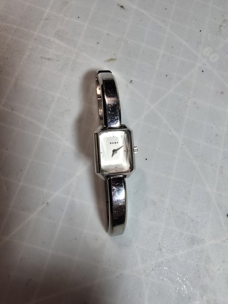 This vintage DKNY wristwatch features a stunning silver case and bezel, with a quartz movement and analog display. It is a perfect accessory for any woman who loves classic style and timeless elegance. This watch is made of high-quality stainless steel and does not come with original box or papers. It is not customized and has not been handmade. Works great