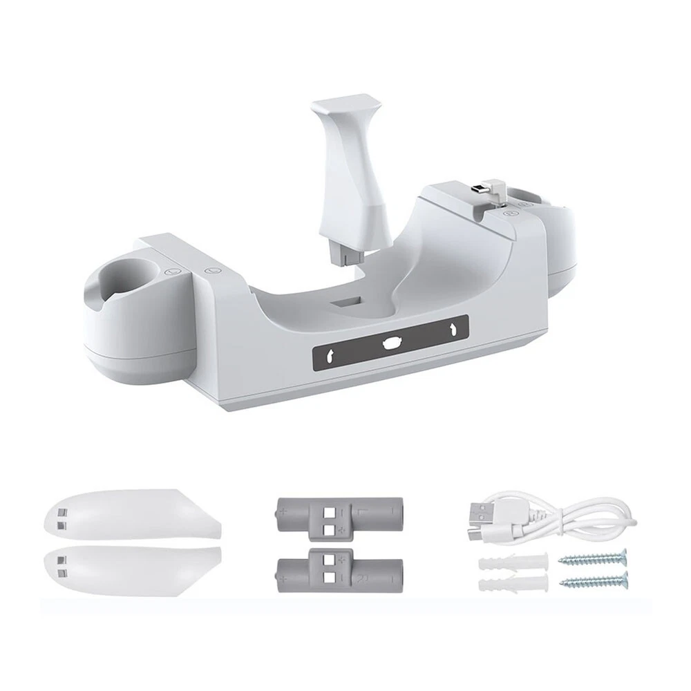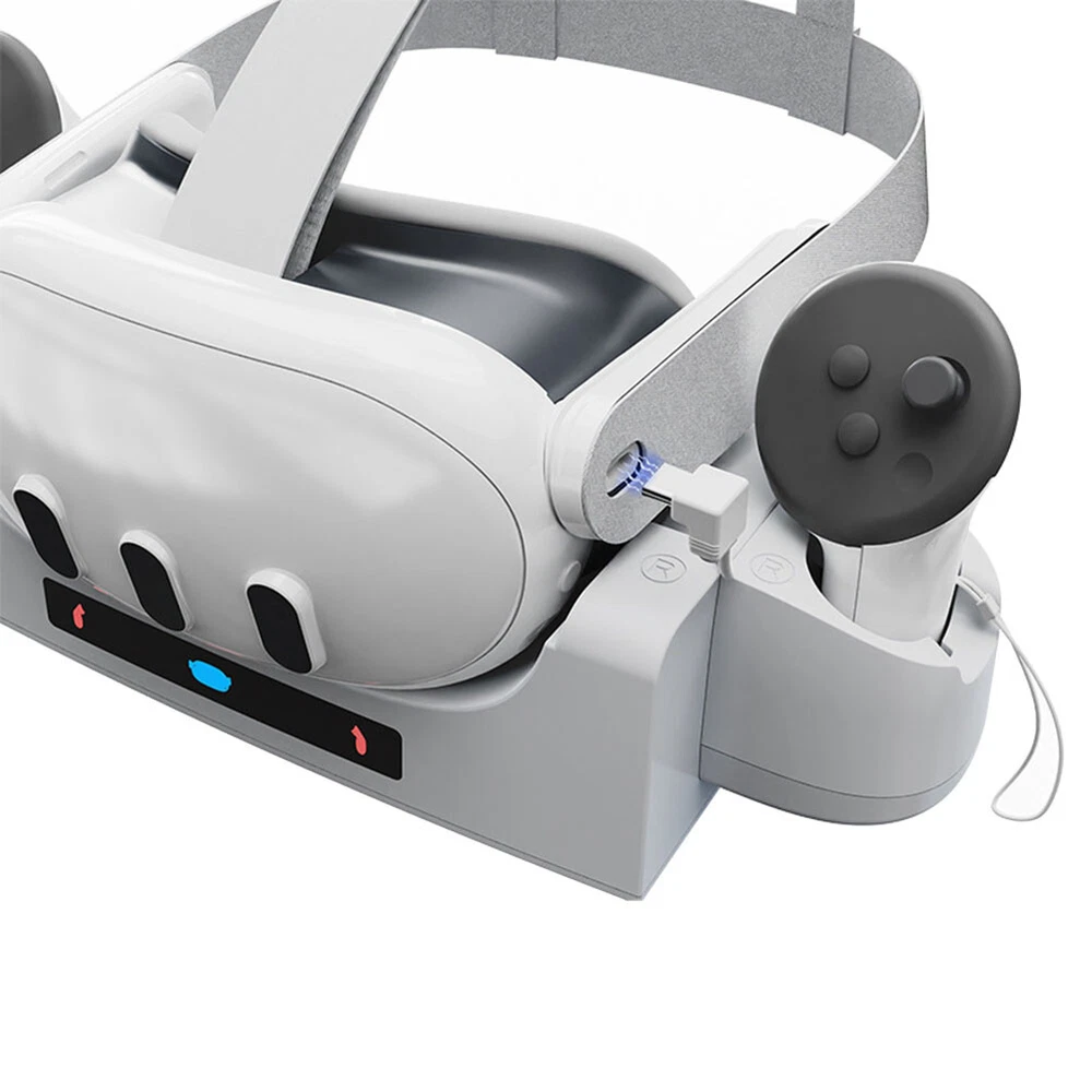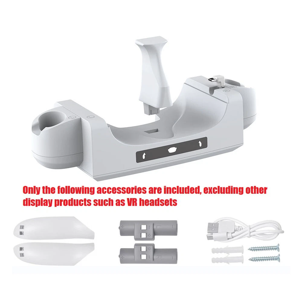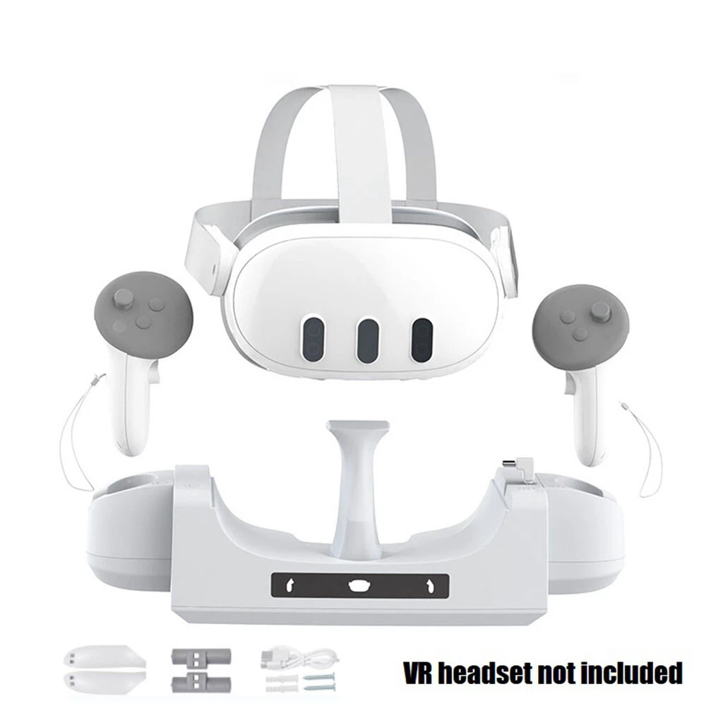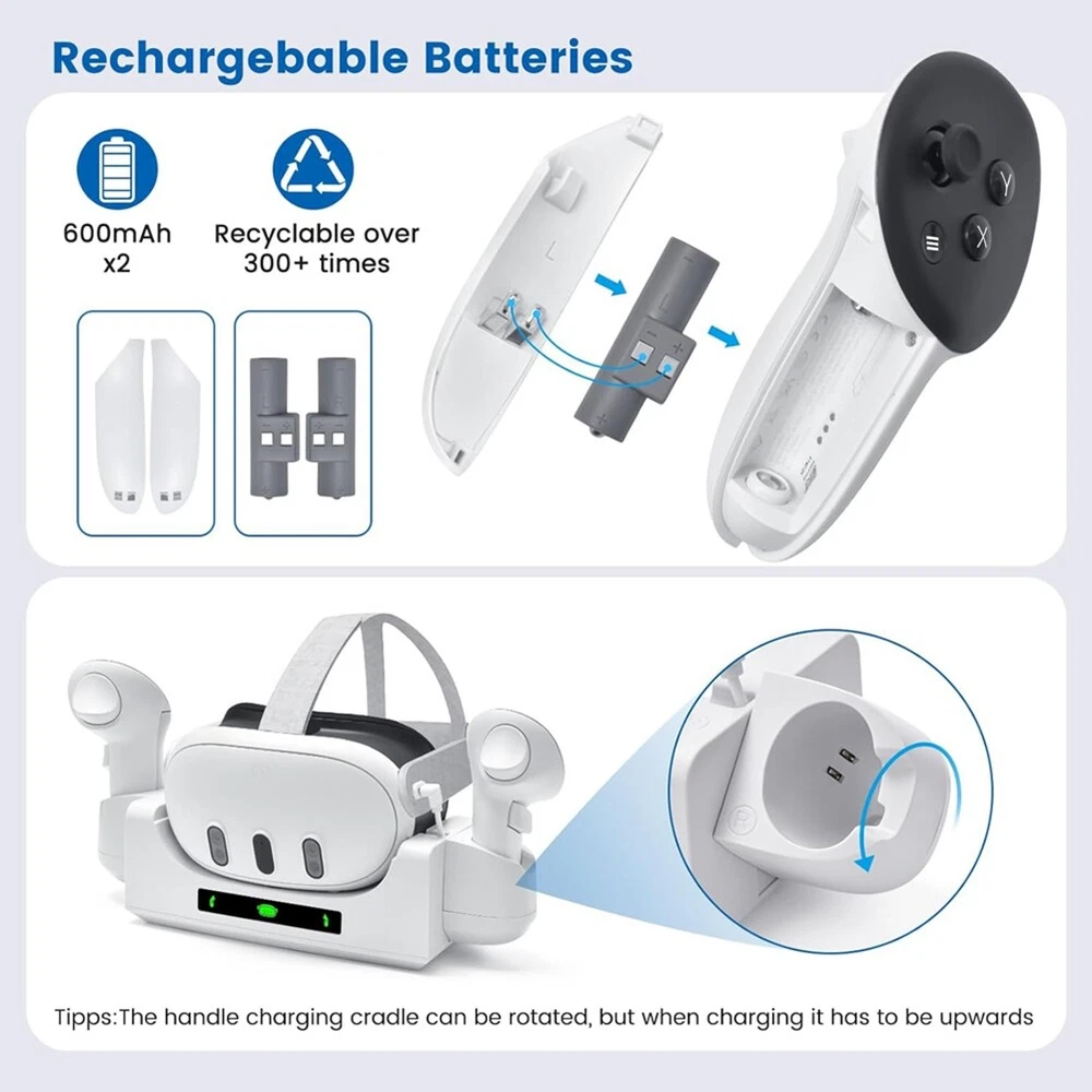 Docking Station Base Wall Mount for Meta 3 Station Controller for VR2961 Equipped with a 2X600 mAh battery, The handle needs to be installed with the battery we supplied before it can be . The battery in the handle does not have a charging hole and cannot be . Product Description: 1. Suitable for 3 glasses and handles; 2. Charging the handle: first remove the battery cover for the Quest 3 controller and install the equipped rechargeable battery, and then install the equipped battery cover (need to match the left and right); 3. Assembly method: ① Place the desktop; ② Can be hung (the charging grooves of the left and right controllers are rotated upward 90°, the wall screws are aligned with the wall screw fixing holes on the back of the base, and then hung); 4. Handle charging indicator: charging: red light, full/empty: green light Glasses charging indicator: charging: red light, full/empty: blue light 5. There are anti-slip pads at the bottom of the charging stand, which makes the placement more stable; Due to different batches, the appearance, color, and printed words of the product , which does not affect its use. Material: plastic colour: White Package Contents: 1 x base 2 x 600mAh batteries